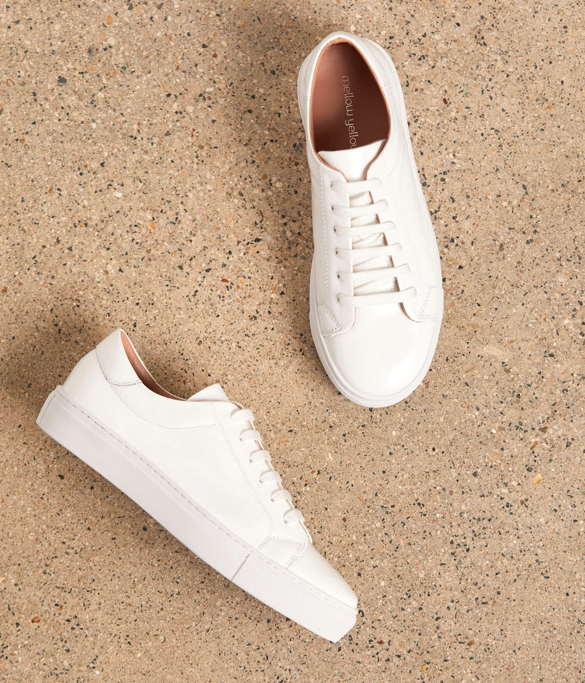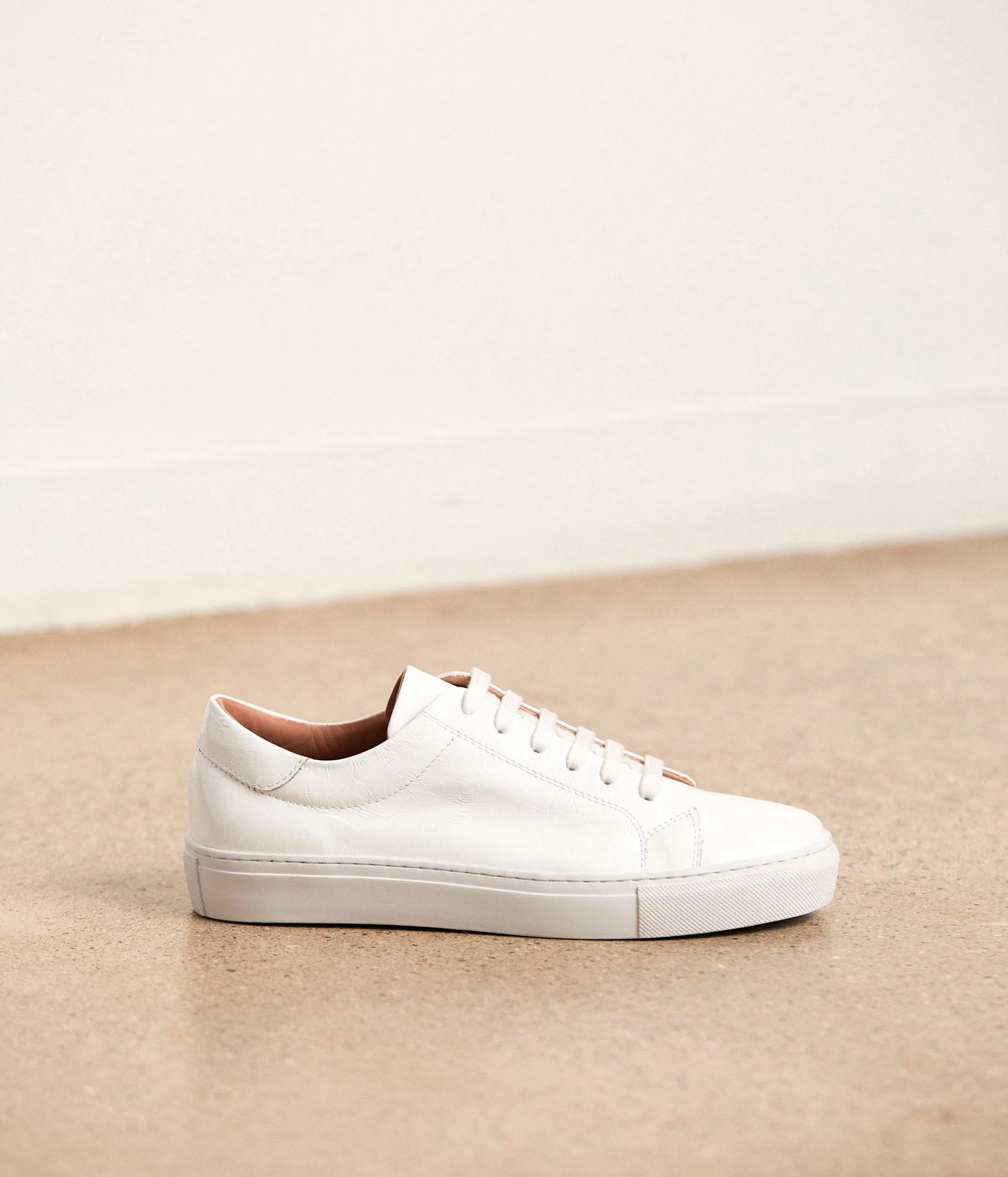 White is white disait la chanson. Les baskets Lester prennent la consigne au pied de la lettre. Cuir verni blanc, doublure camel, elles ont ce je-ne-sais-quoi de minimaliste et d’intemporel.