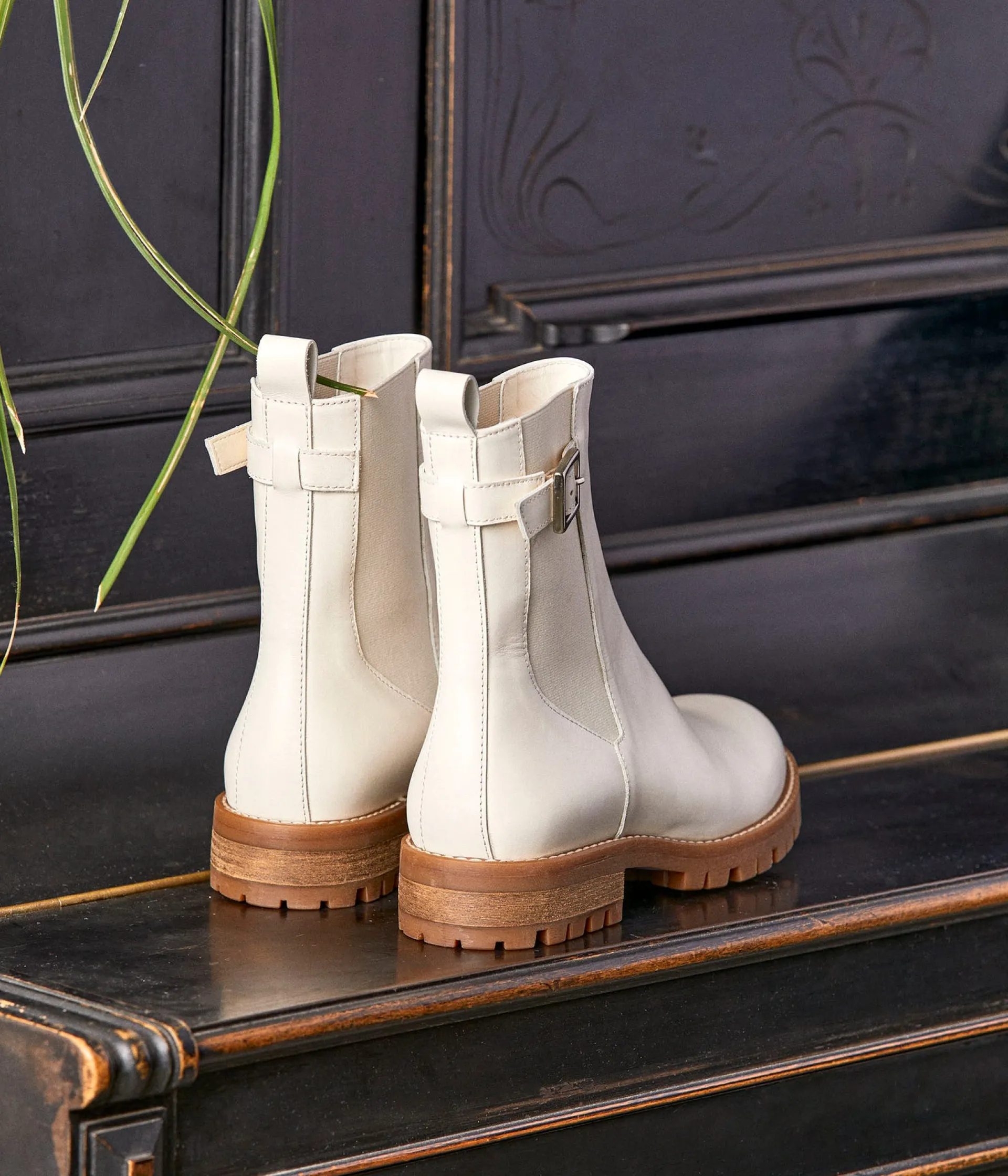 Cuir lisse et semelle crantée : un désaccord parfait qui résonne comme une évidence. Succombez au charme des Chelsea boots Norma, déclinées en blanc d’hiver. Une ligne minimaliste cintrée d’une bride, pouvant s’illustrer par une seule devise : less is more.