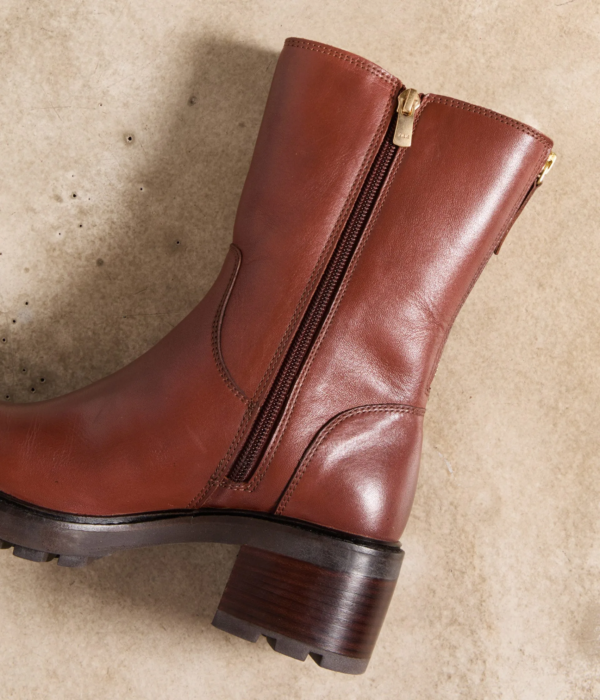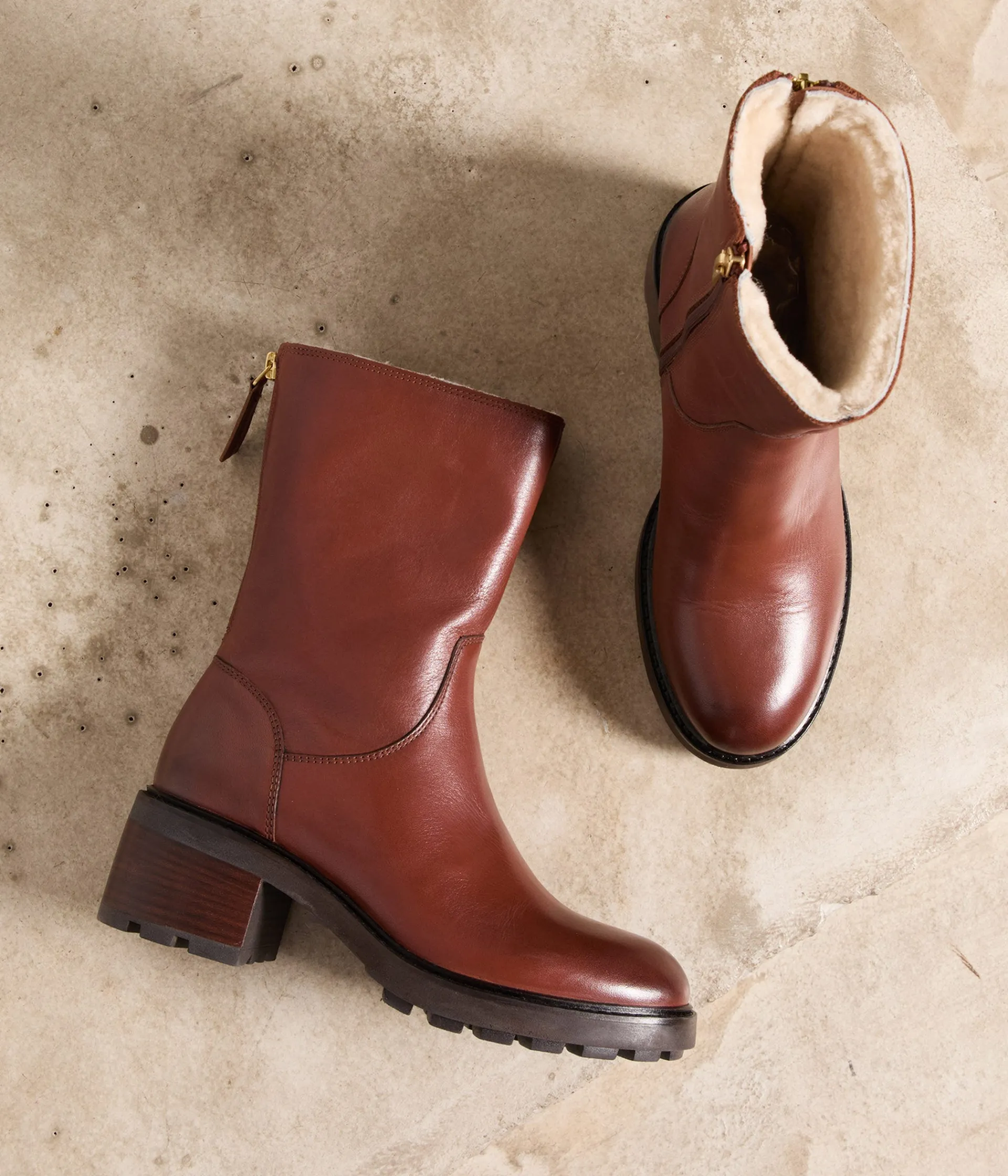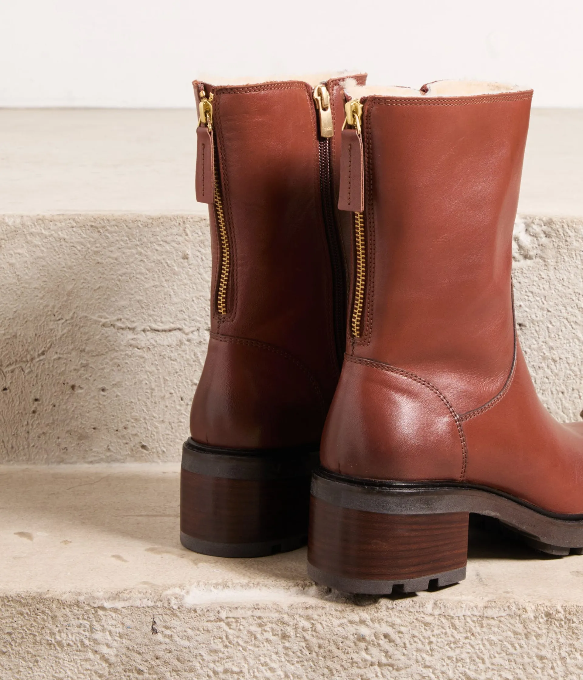 Leur cuir souple, leur coloris cognac, leur doublure fourrée, leur talon cranté, leur fermeture zippée à l’arrière…