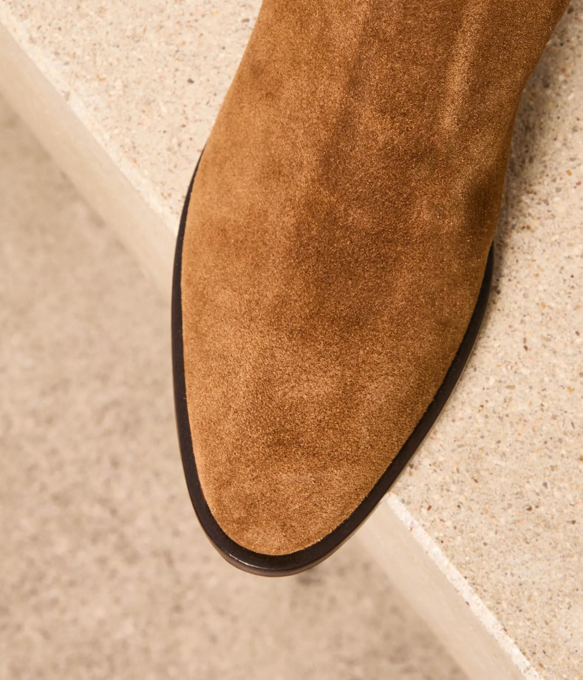 On dit souvent de vous que vous êtes un beau brun de fille ? Prenez l’expression au pied de la lettre avec les boots Hailey. En cuir velours camel, elles s’inspirent de la tendance western, avec bout pointu et talon biseauté. Jouez-les en camaïeu, avec une veste courte en daim et un pantalon large.