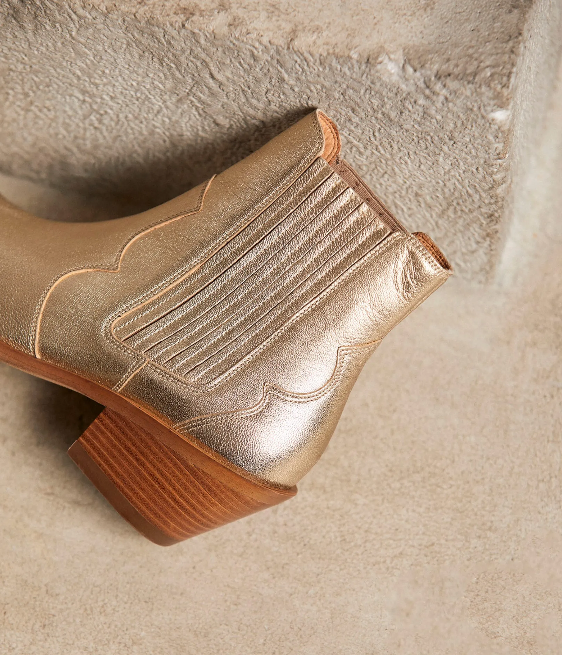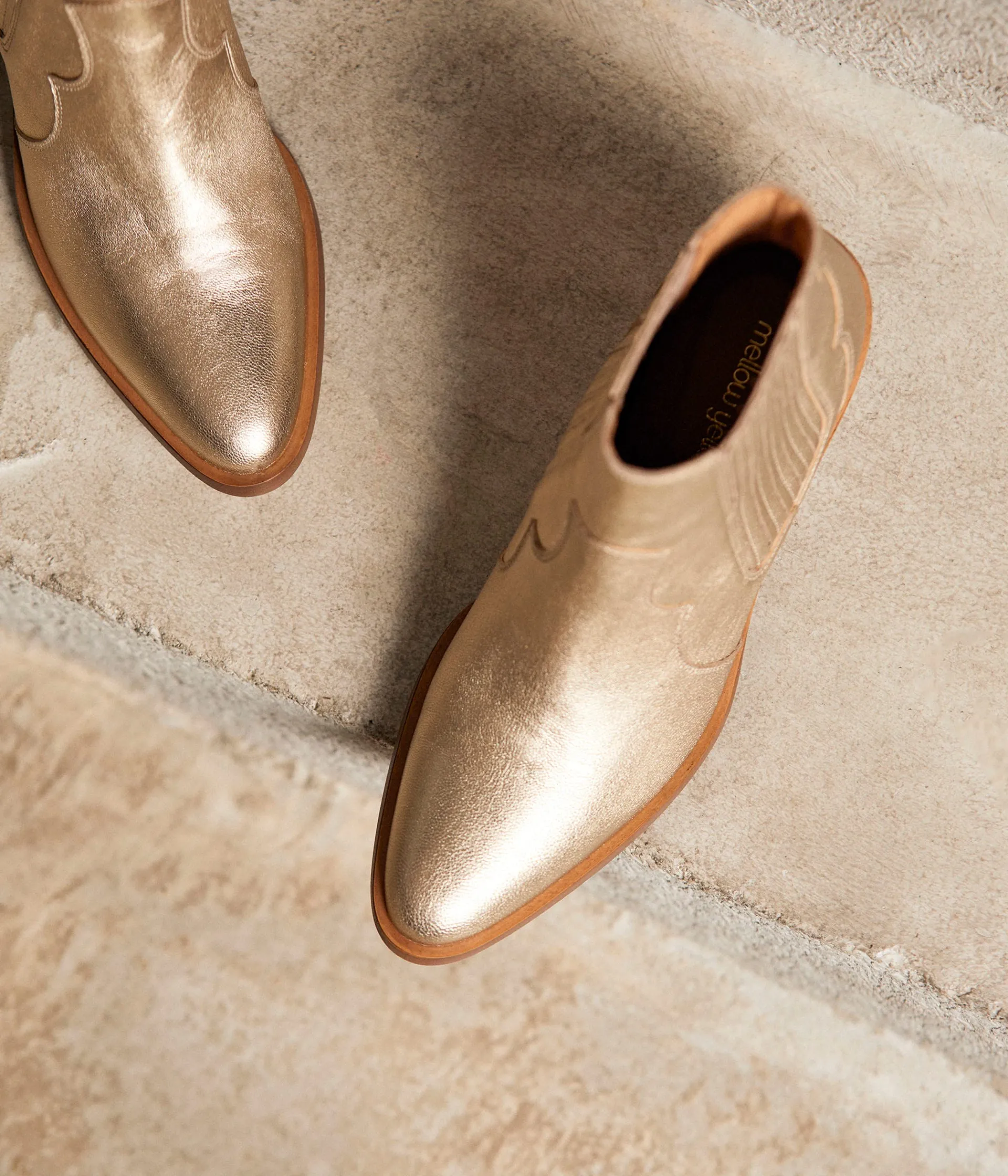 Et si Lucky Luke avait été une femme ? Même chapeau, même foulard, même petit gilet noir. Peut-être une nouvelle chemise. Peut-être un jupon long en denim. Et pourquoi pas, de nouvelles boots ? Esprit western en cuir métallisé, essayez Carrie. Sans aucun doute, les boots les plus fashion de l’Ouest.