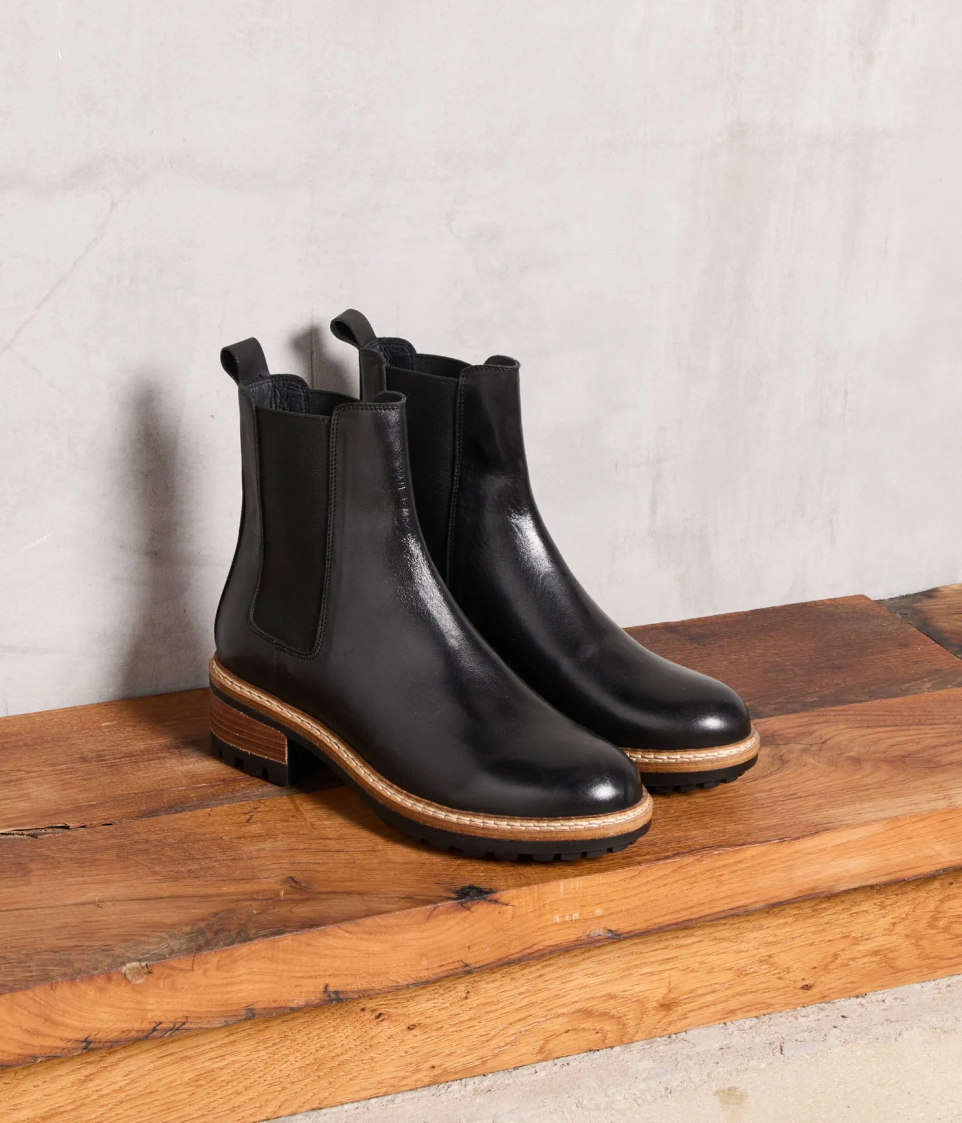 On reprend depuis le début. La mode est un jeu, et, un éternel recommencement. En résumé, on se fait plaisir, avec des chaussures qui vont vivre dans le temps. Démonstration avec nos chelsea boots Calista, en cuir noir, à talons bicolores et semelles crantées. Le twist fashion qui change tout : des chaussettes pailletées qui dépassent de la tige.