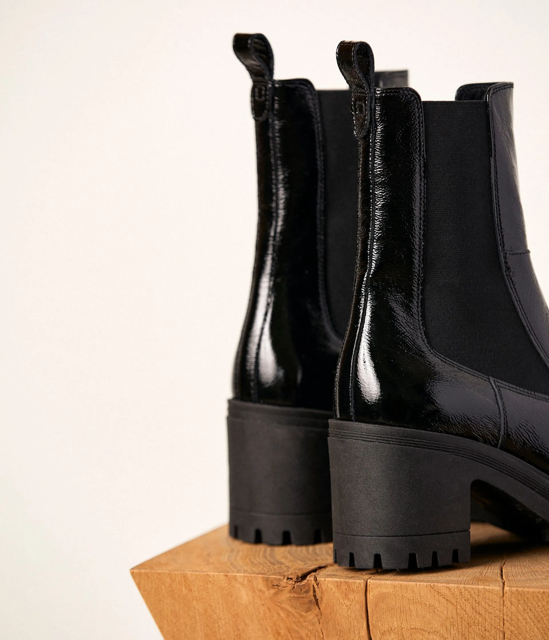 London Calling. Impossible de lutter contre cette envie irrésistible de speak English et d’oser des looks so fancy. Cuir noir verni et talons carrés de 7 cm sur semelle crantée, vous avez déjà les boots. Prenez vos billets.