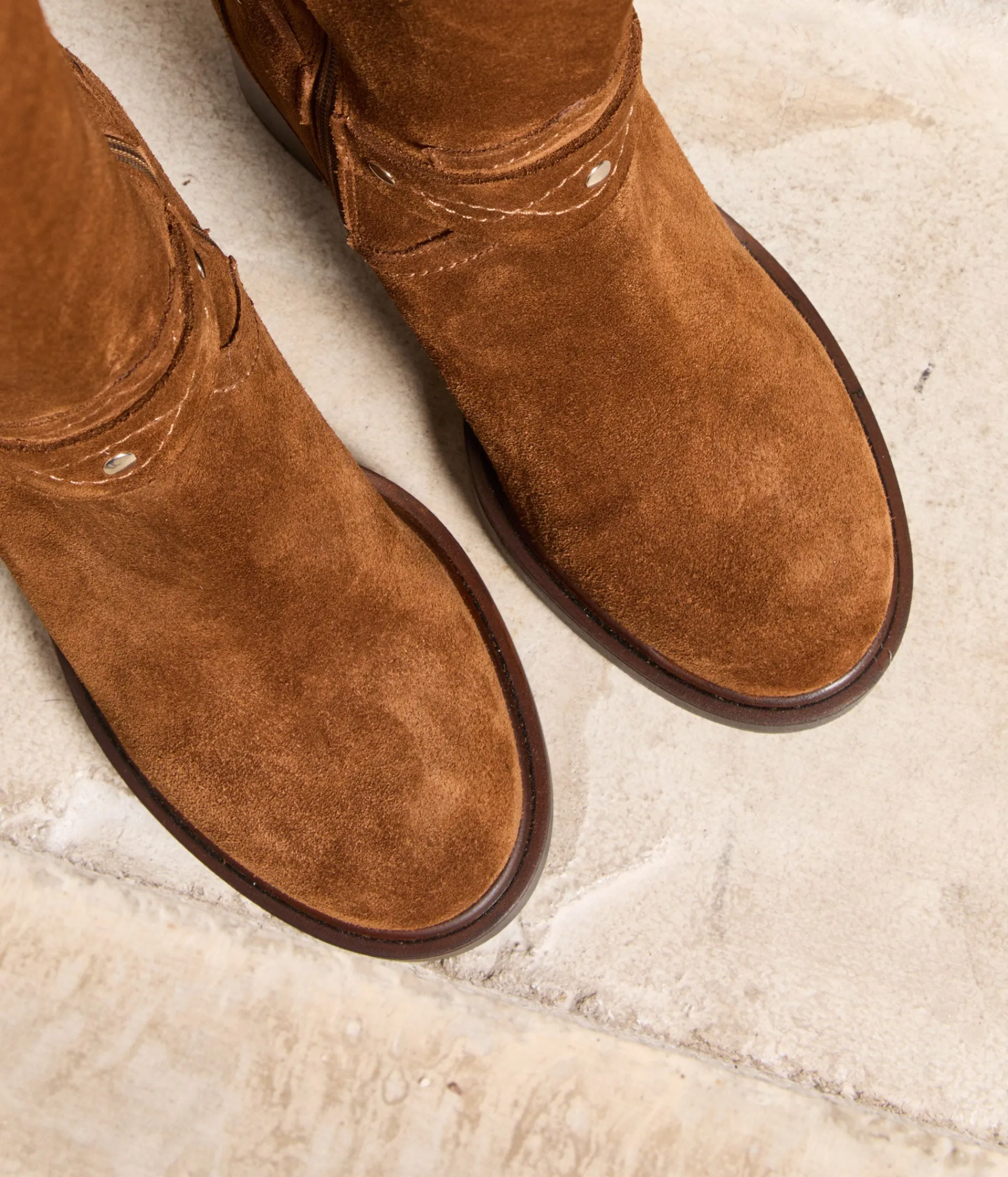 Cette saison (encore), il faut se rendre à l’évidence : l’esprit motard a repris la pole position. En guest, les bottes Zoé. Ultra séduisantes, elles associent cuir velours camel et jeux de surpiqûres à tendance folk sur la tige et les brides placées aux chevilles. Le talon carré de 7,5 cm apporte de la féminité.