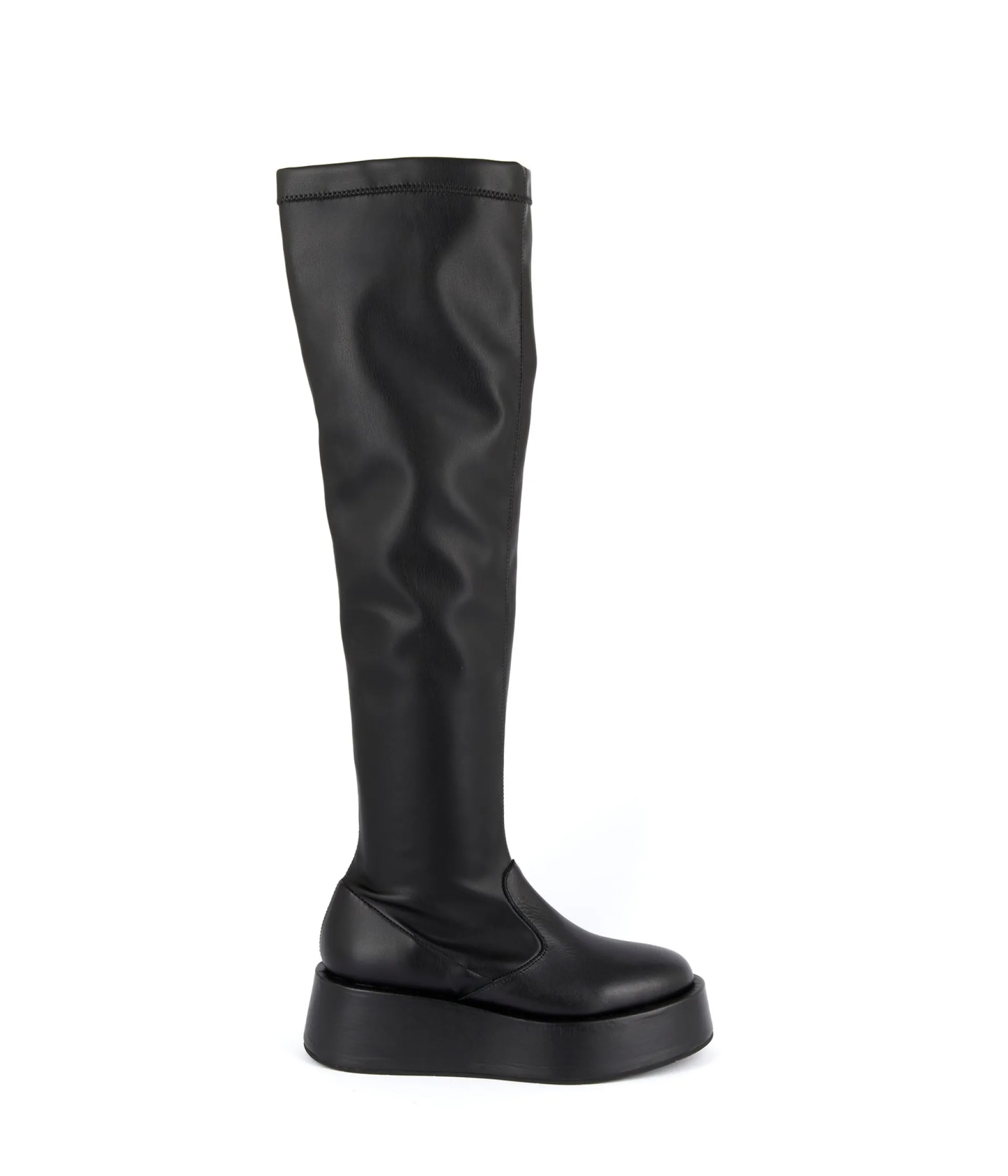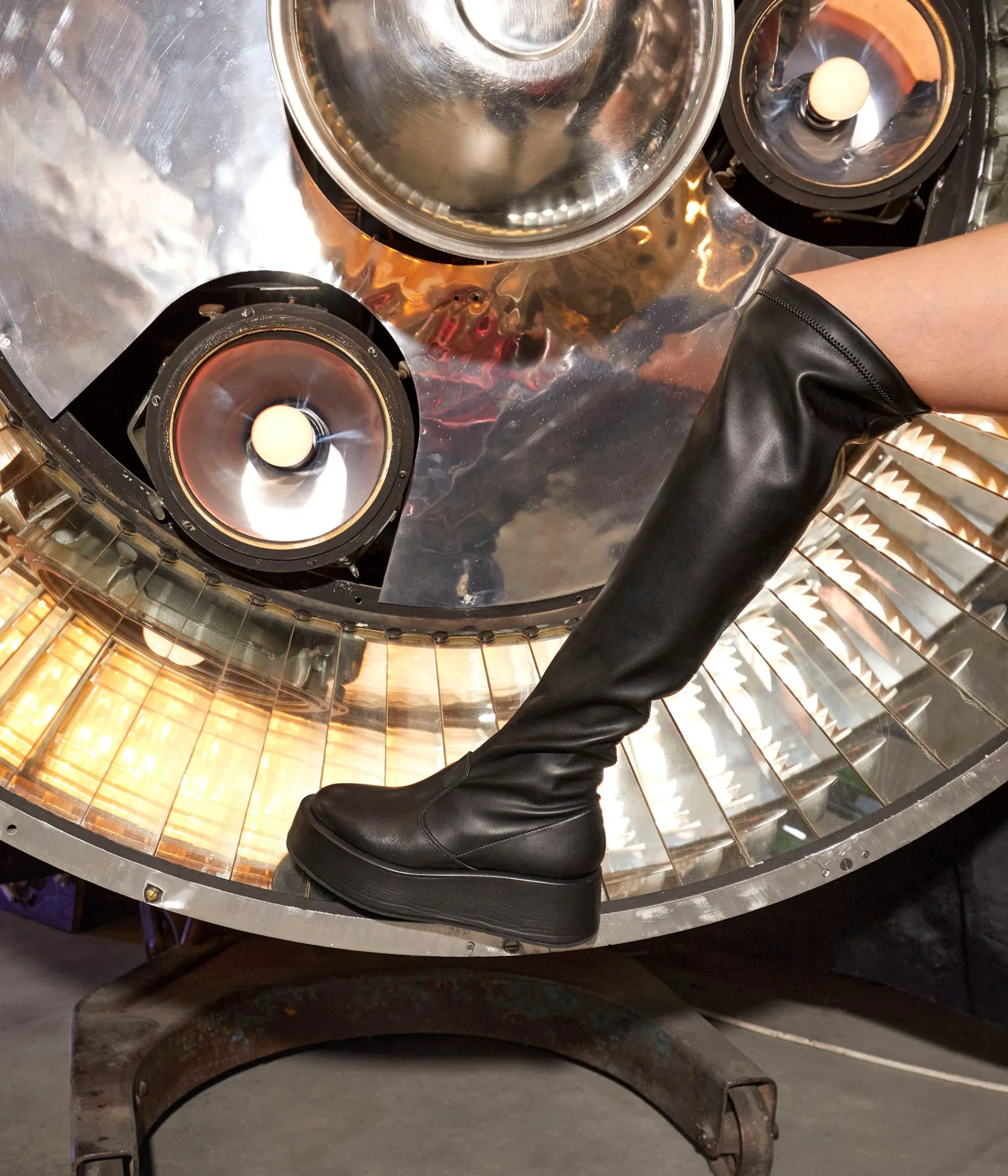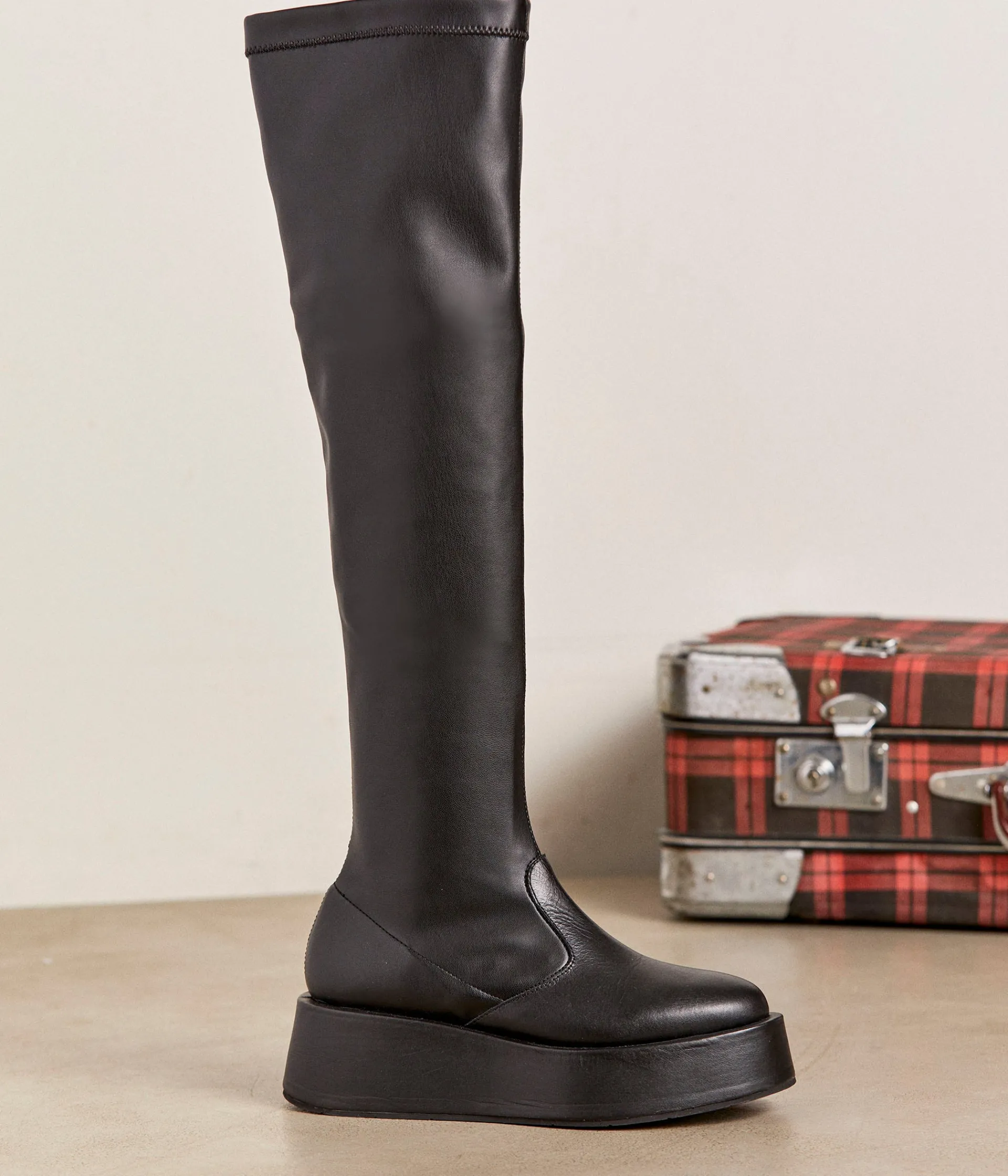 Allure cuir glam espiègle pour les cuissardes Stanislas, qui prennent l’hiver de haut. Comment ? Avec une tige haute (si haute) et stretch (si stretch), et une semelle compensée de 5 cm. Blouson de motard sur mini moulante ou short à paillettes : l’ajusté est plus qu’easy, c’est carrément sexy.