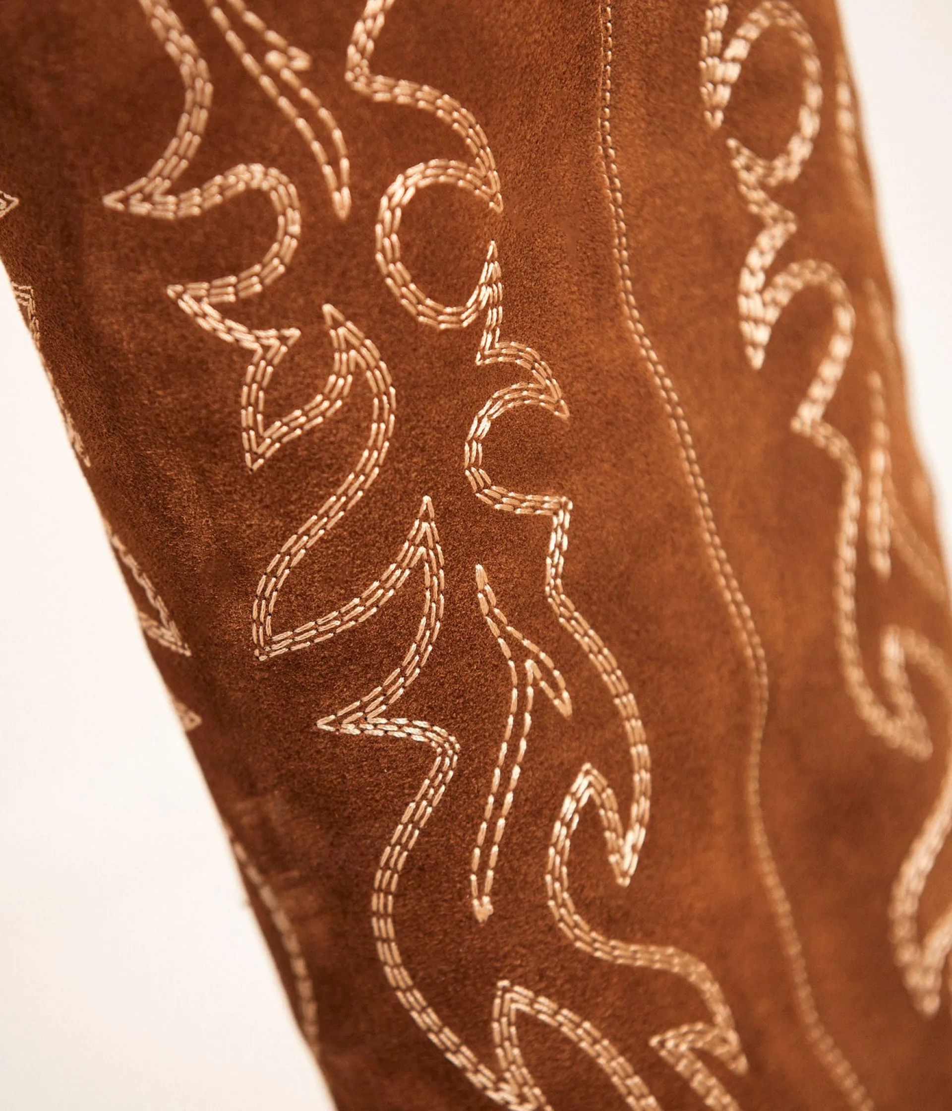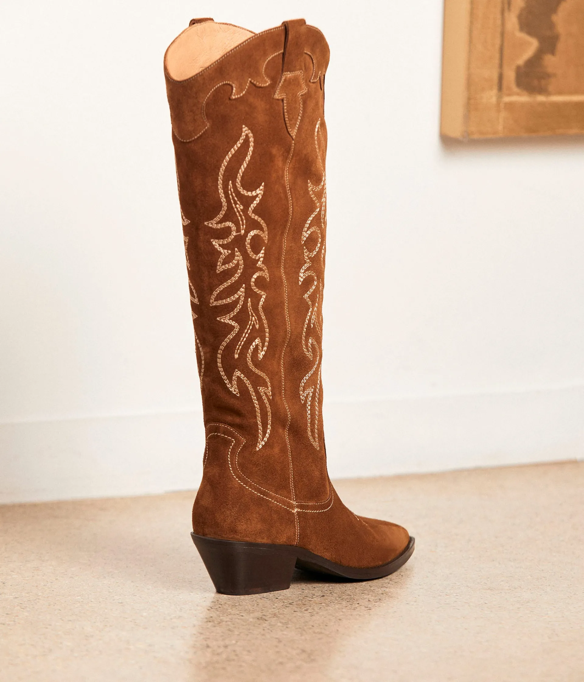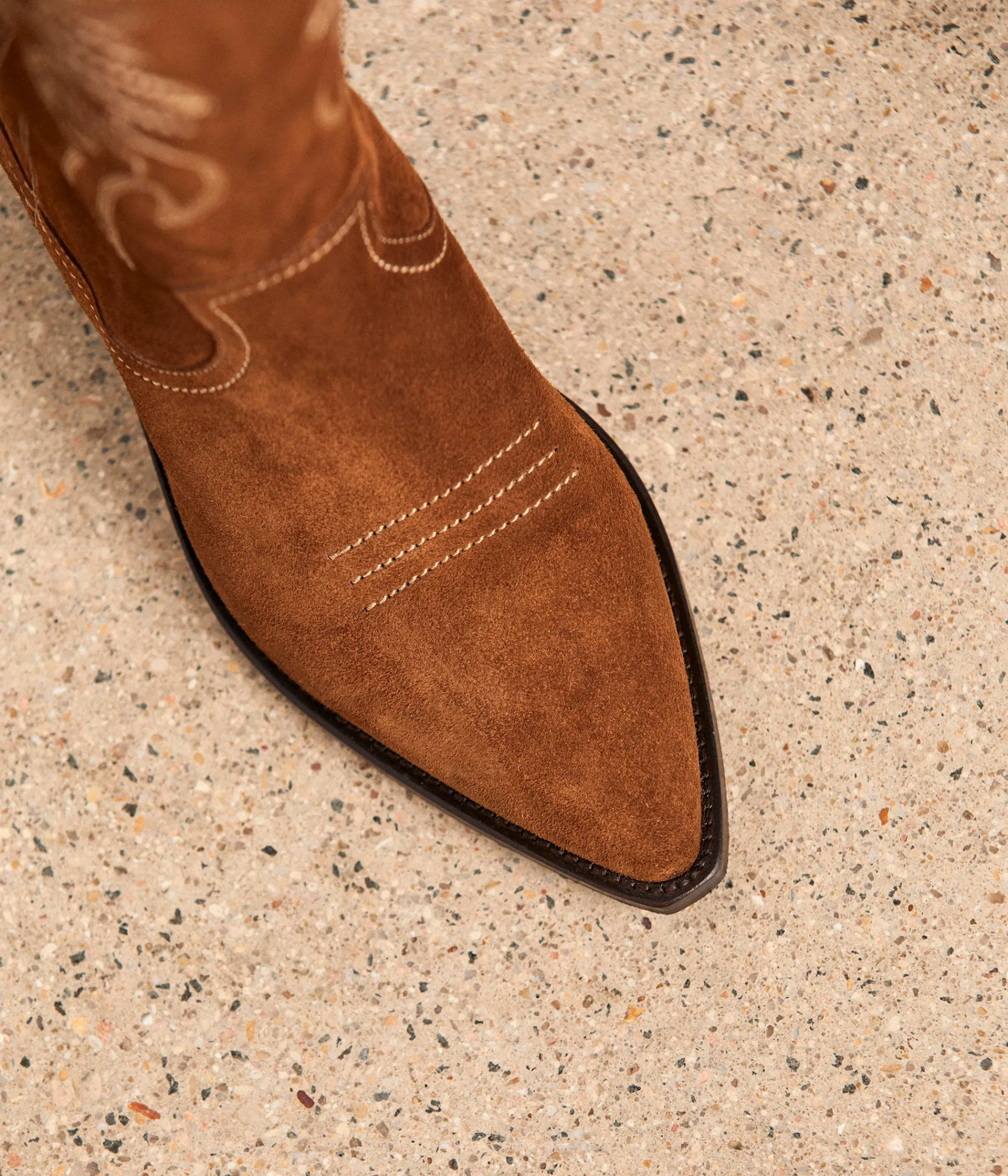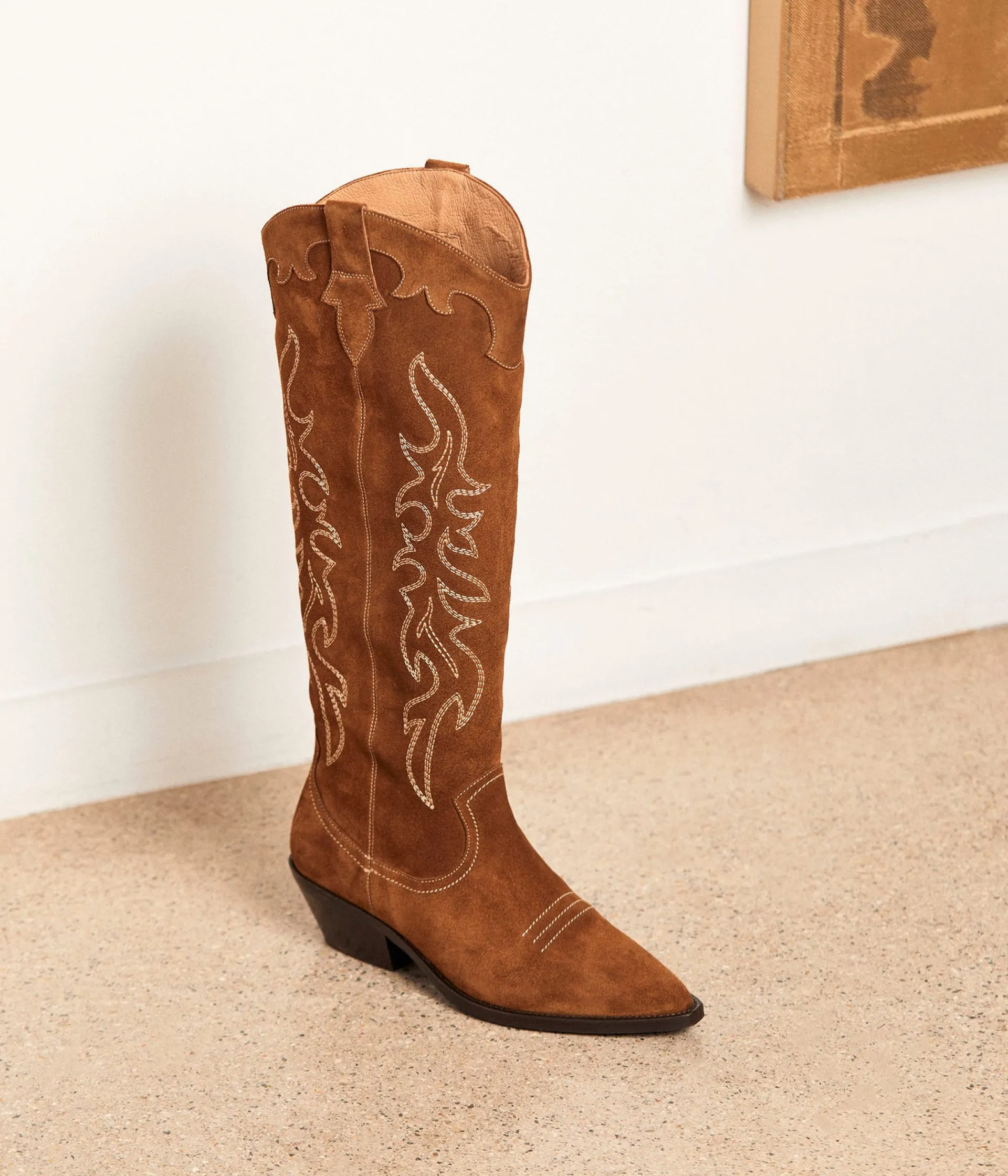 On les voit. On l’entend. Quoi donc ? La guitare acoustique, pardi ! Pas besoin de chapeau de cow-boy ni de savoir danser la Country, pour oser les bottes Tokyo. Sublimes dans leur cuir velours coloris tabac, elles séduisent par leurs surpiqûres contrastées, leur bout pointu et leur talon biseauté.