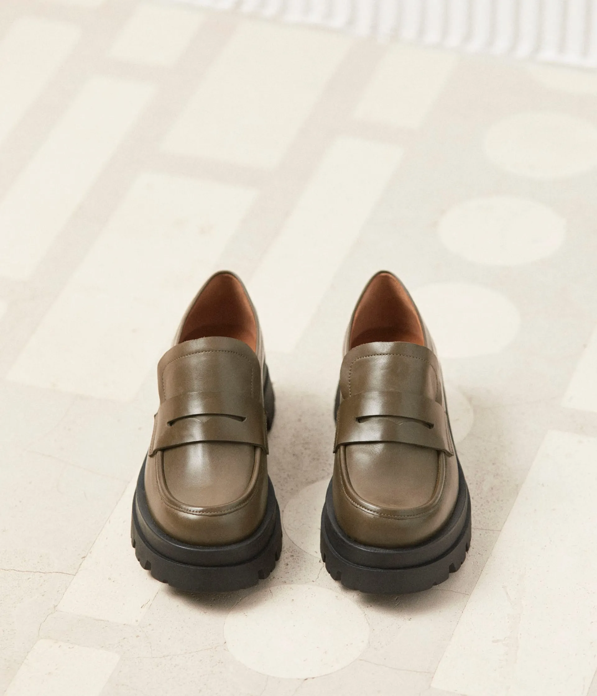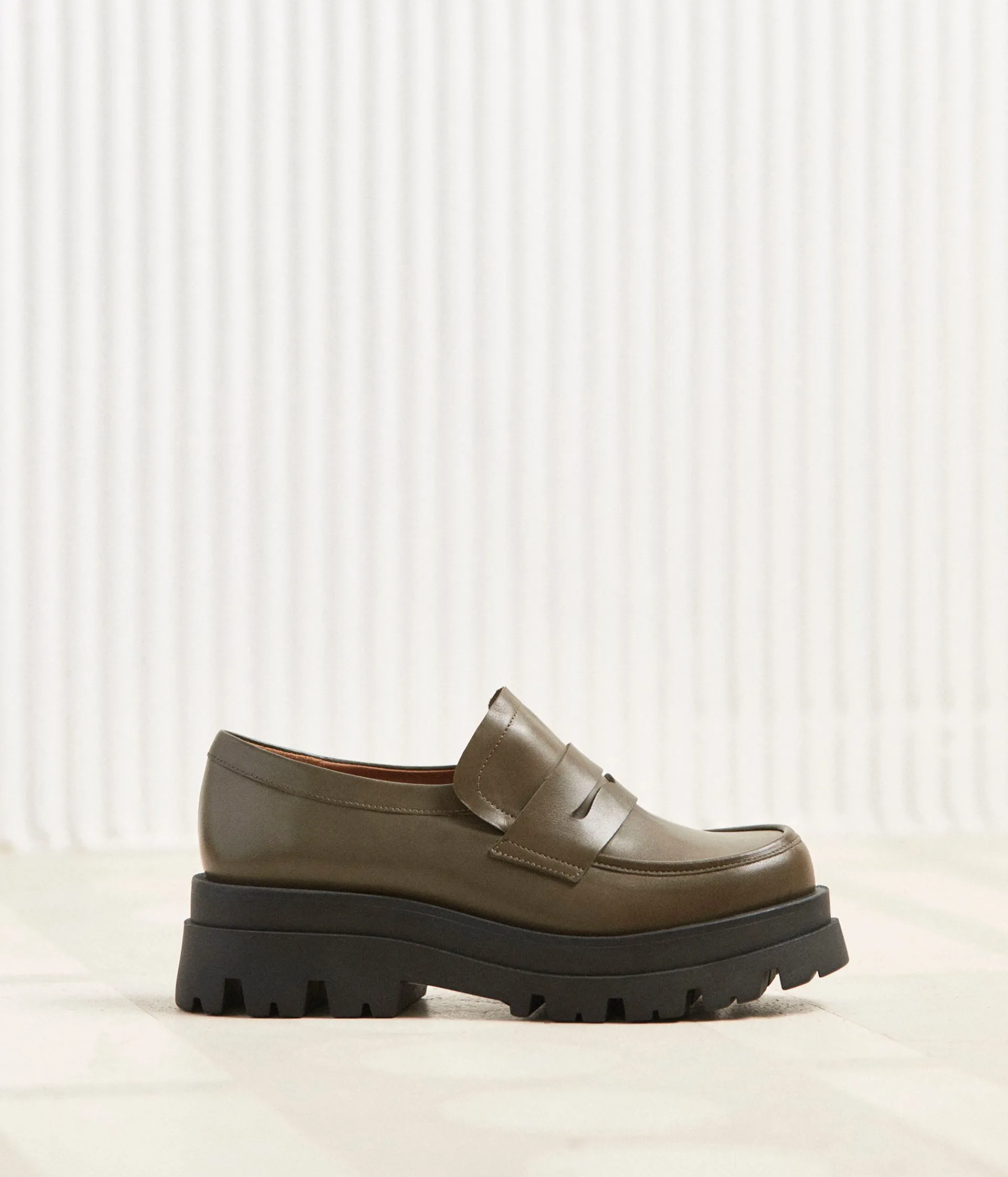 Voici nos mocassins Jack en cuir kaki. On sait que vous l’avez probablement remarqué, car elles sautent aux yeux, mais on tenait à souligner sa semelle moulée, mieux crantée que le plus épais de vos après-skis.