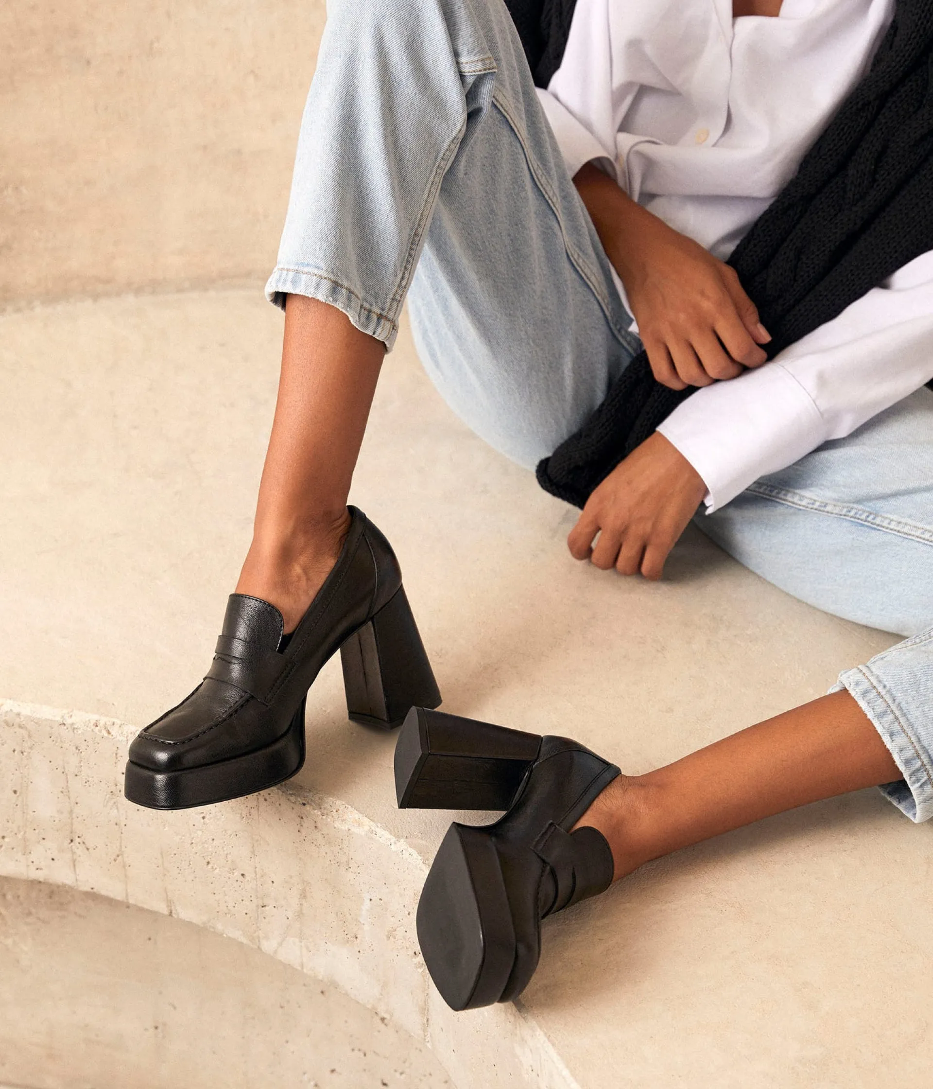 Exit les souliers pointus et autres ballerines arrondies, les bouts carrés sont la nouvelle attitude mode à adopter. Cette forme complètement rétro caracole en tête de la saison. Notamment Batia, des mocassins en cuir noir, montés sur un talon flare avec patin à l’avant.