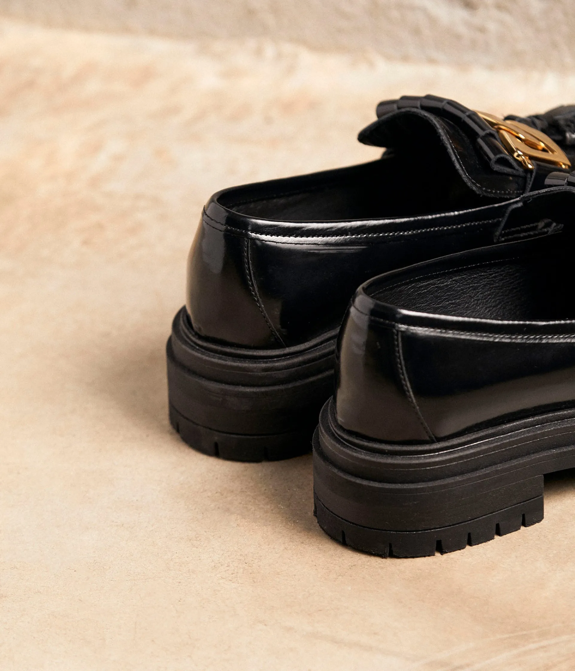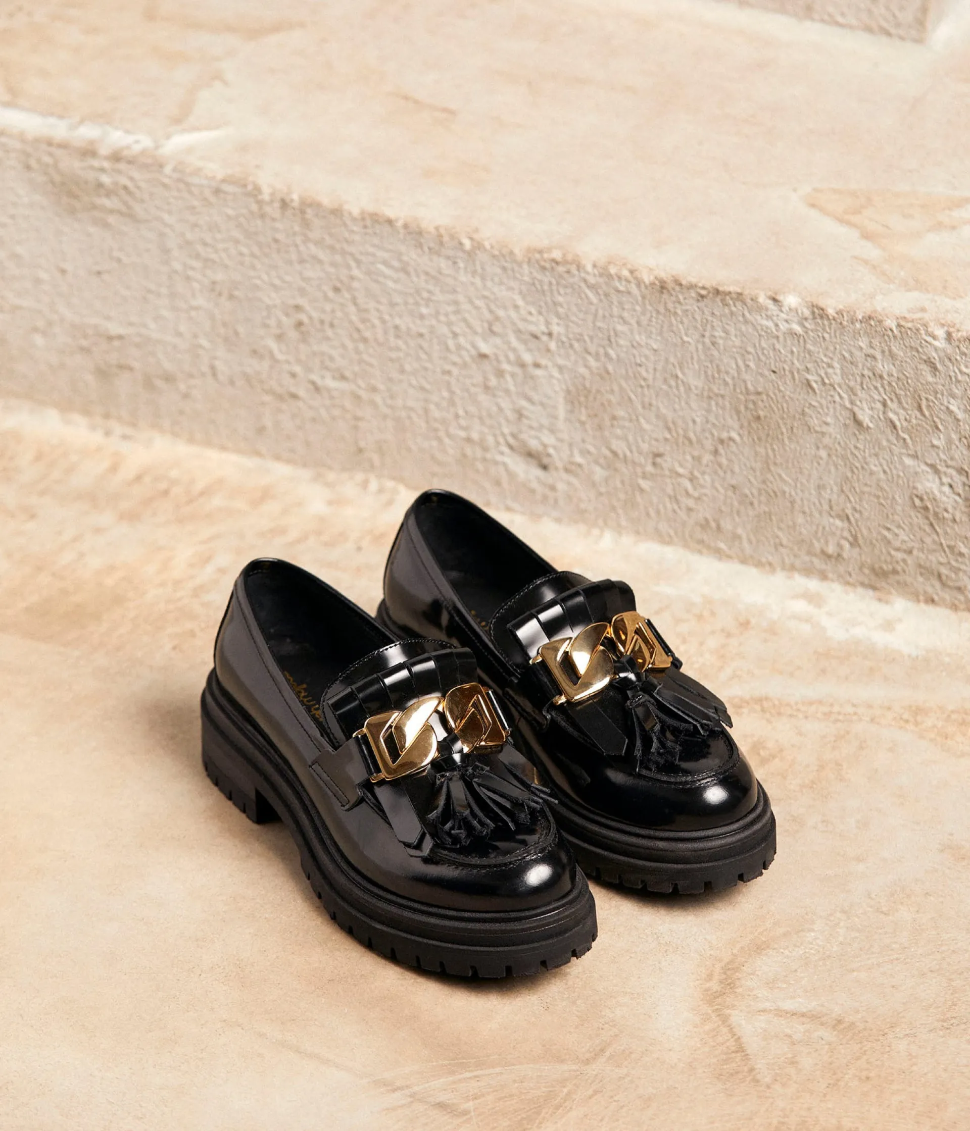 Il y a celles qui portent haut les bottes, celles qui ne jurent que par les baskets, celles qui trottinent en bottines, et celles qui vénèrent le retour des mocassins. Toutes sont piles dans l’air du temps, mais nous, on a clairement une préférence pour Anelia. Pour leur semelle crantée, pour leur détail de franges rock et de maxi chaîne dorée, pour leur coloris noir adoré.