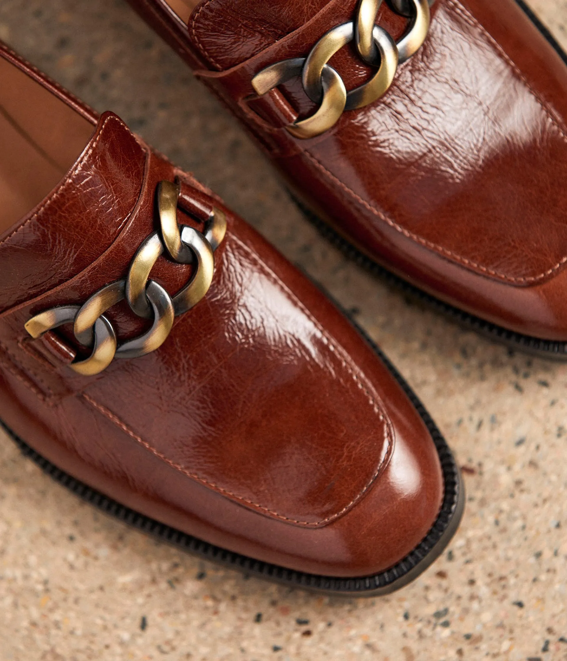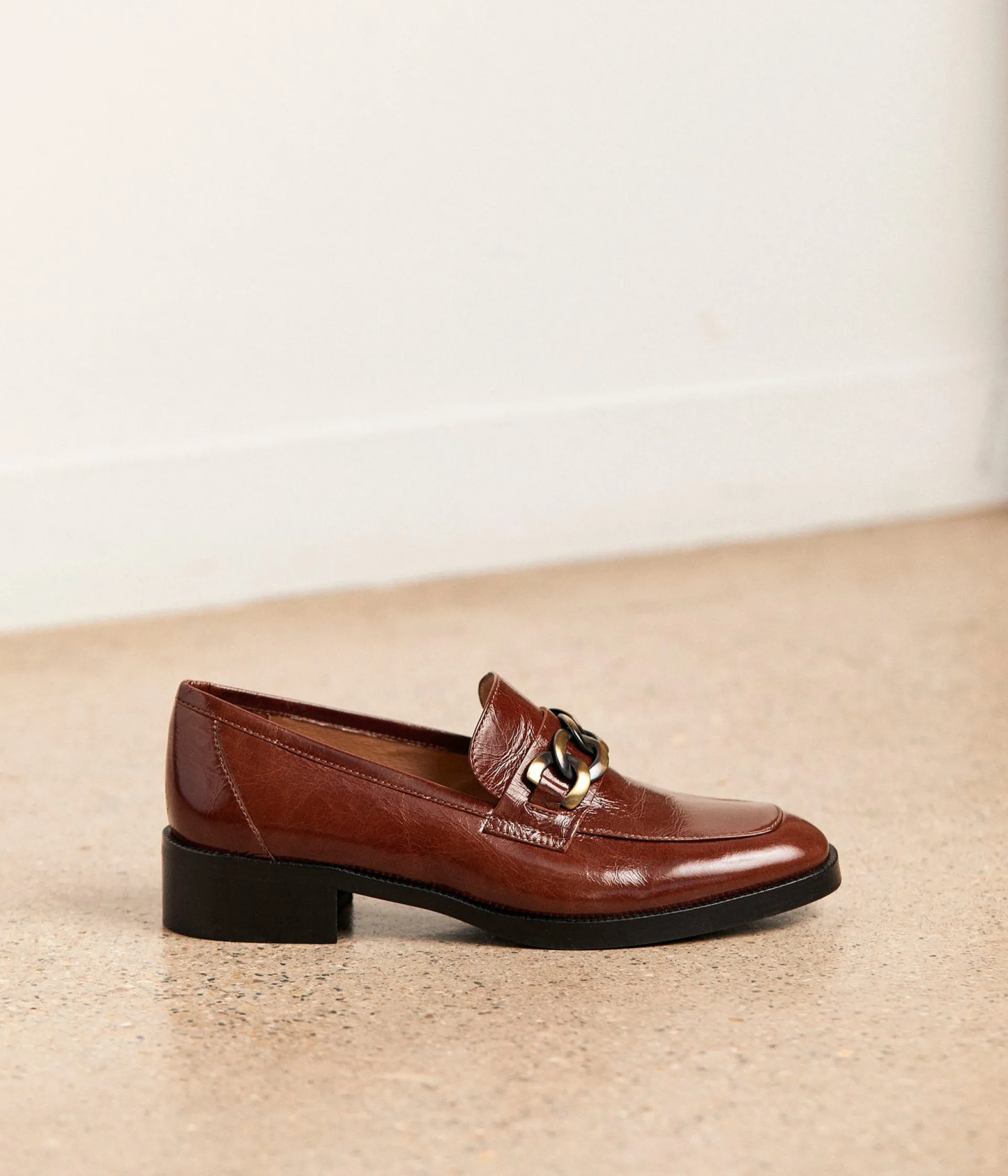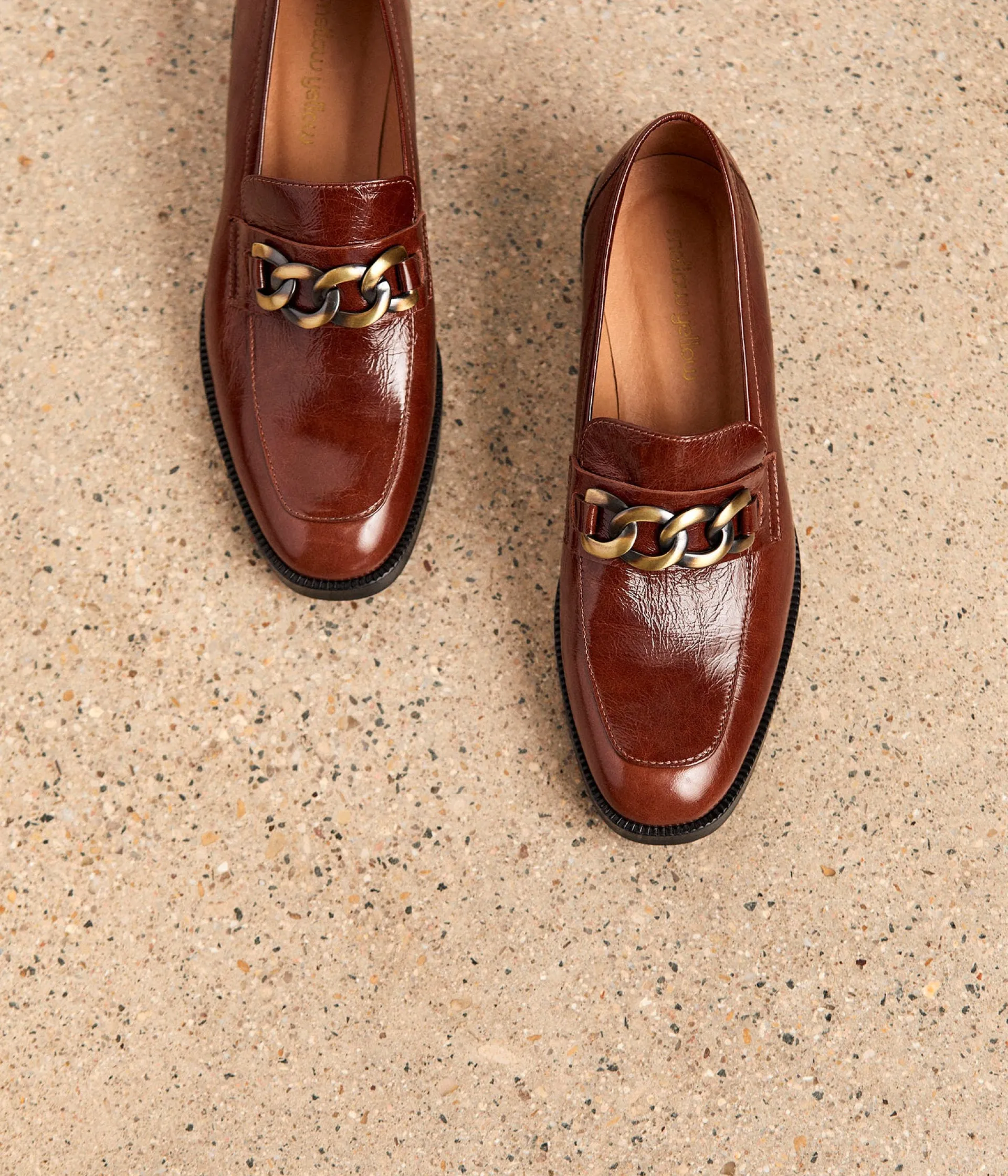 Le mood de cette saison ? Régler votre pas sur la bonne cadence mode, pour qu’on saisisse tout de suite votre démarche. Et les mocassins Oriane, en cuir verni marron donnent le ton. Sobre et profondément élégant, preppy avec une touche de chic.