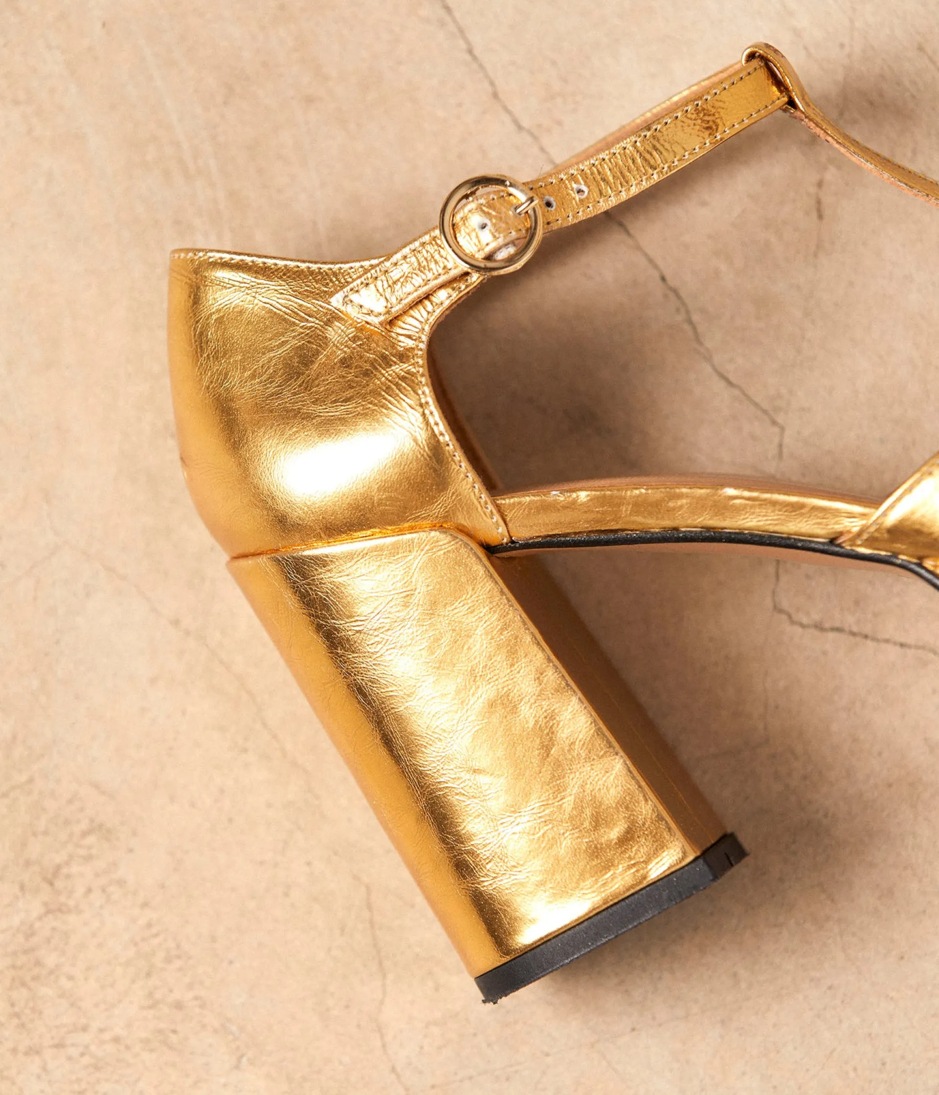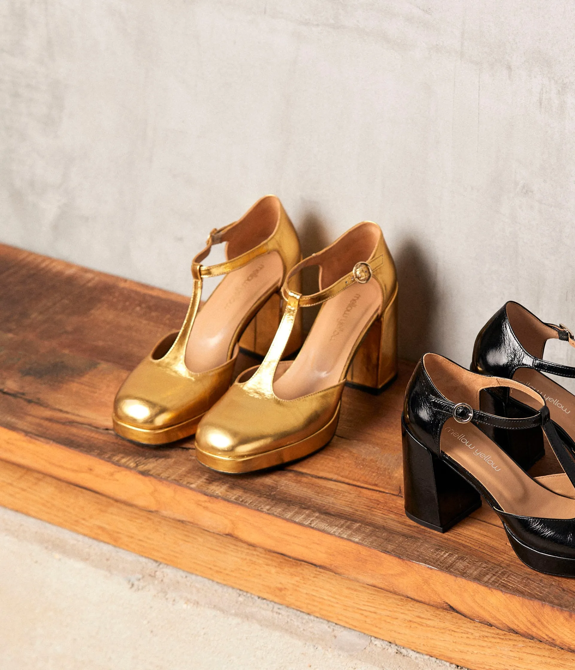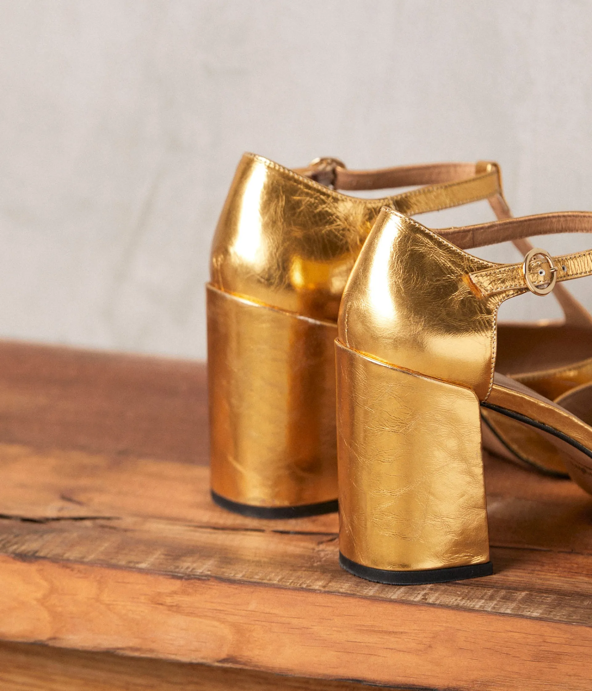 Vous l’appréciez sur vos bijoux ? Vous l’osez aussi en touche mode festive ? Aujourd’hui, c’est sur les babies à talon, que l’or se dépose, avec finesse. LE nouveau coup de cœur pour briller de mille feux ? C’est Adelyne. Ready pour en mettre plein les yeux !
