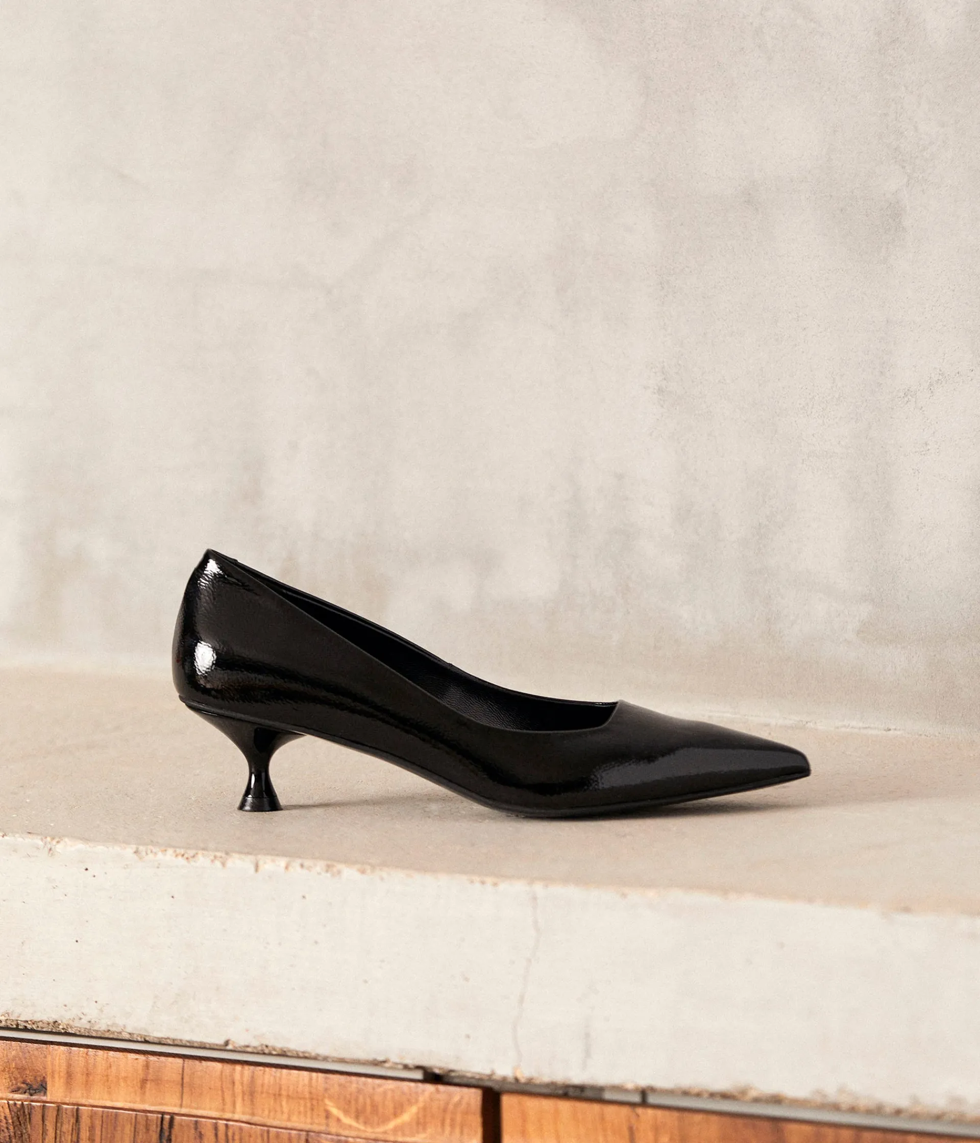 Optez pour l‘élégance discrète du kitten heel. Indissociable des chaussures délicates à bout pointu, fin et haut de 5 centimètres, signifiant littéralement « talon de chaton », il n’est pas vraiment du genre à sortir ses griffes. Sur les escarpins Cyriane, en cuir noir, il évoque la démarche dansante d’une Audrey Hepburn, le jour comme le soir.