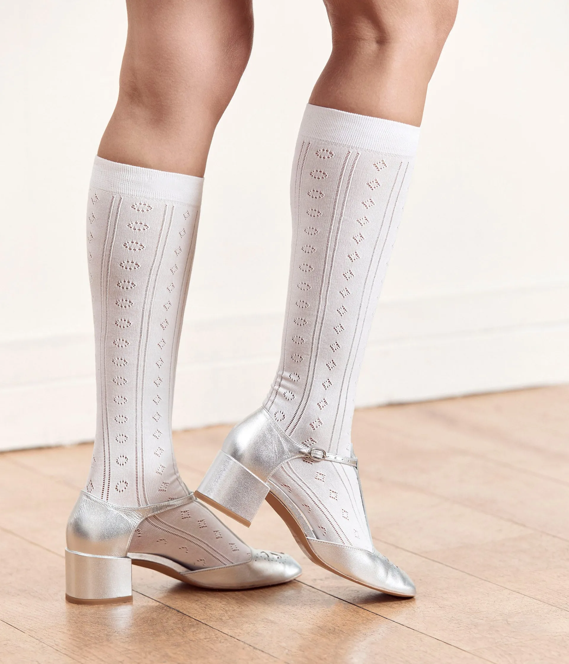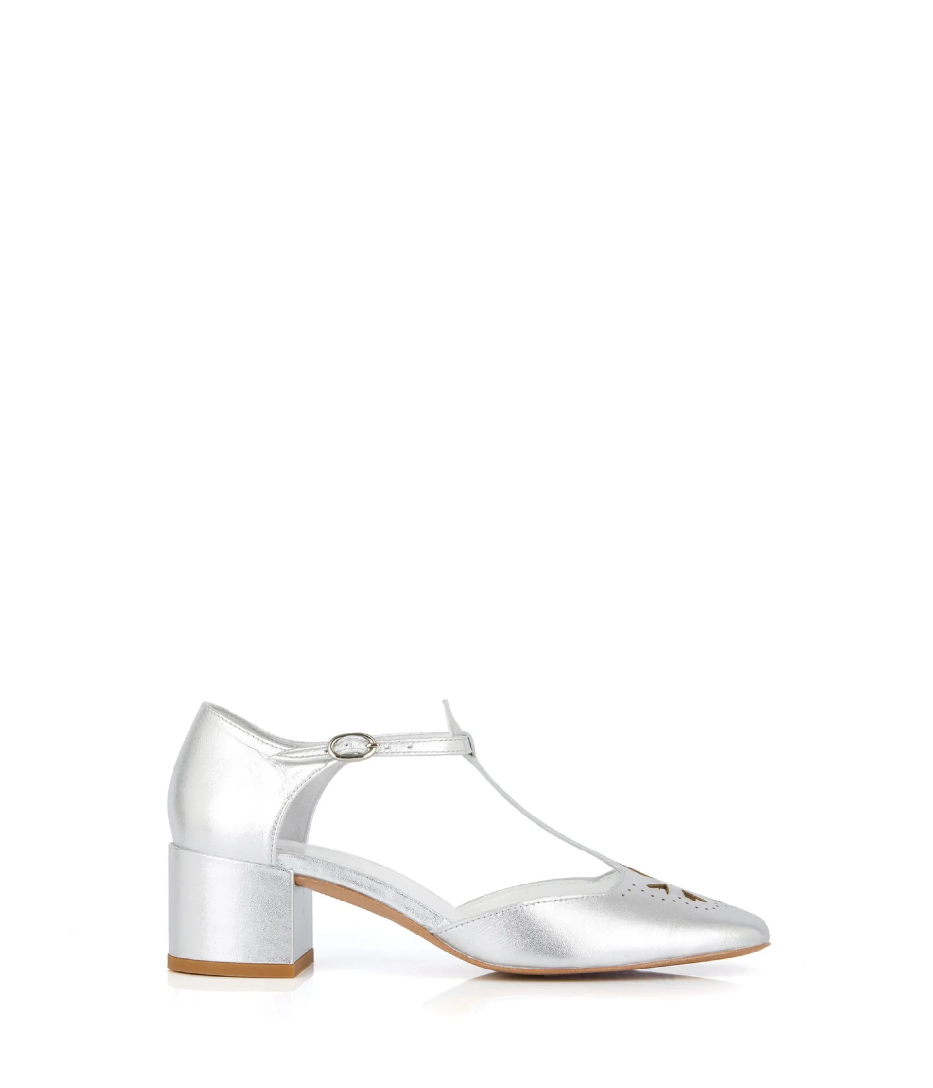 Votre cœur en or se décline ici en argent. Sur vos escarpins Perrine type salomés en cuir métallisé avec jolies perforations en cœurs. À vous de décider si vous voulez les utiliser (ou non) pour passer un message. Swipe right.