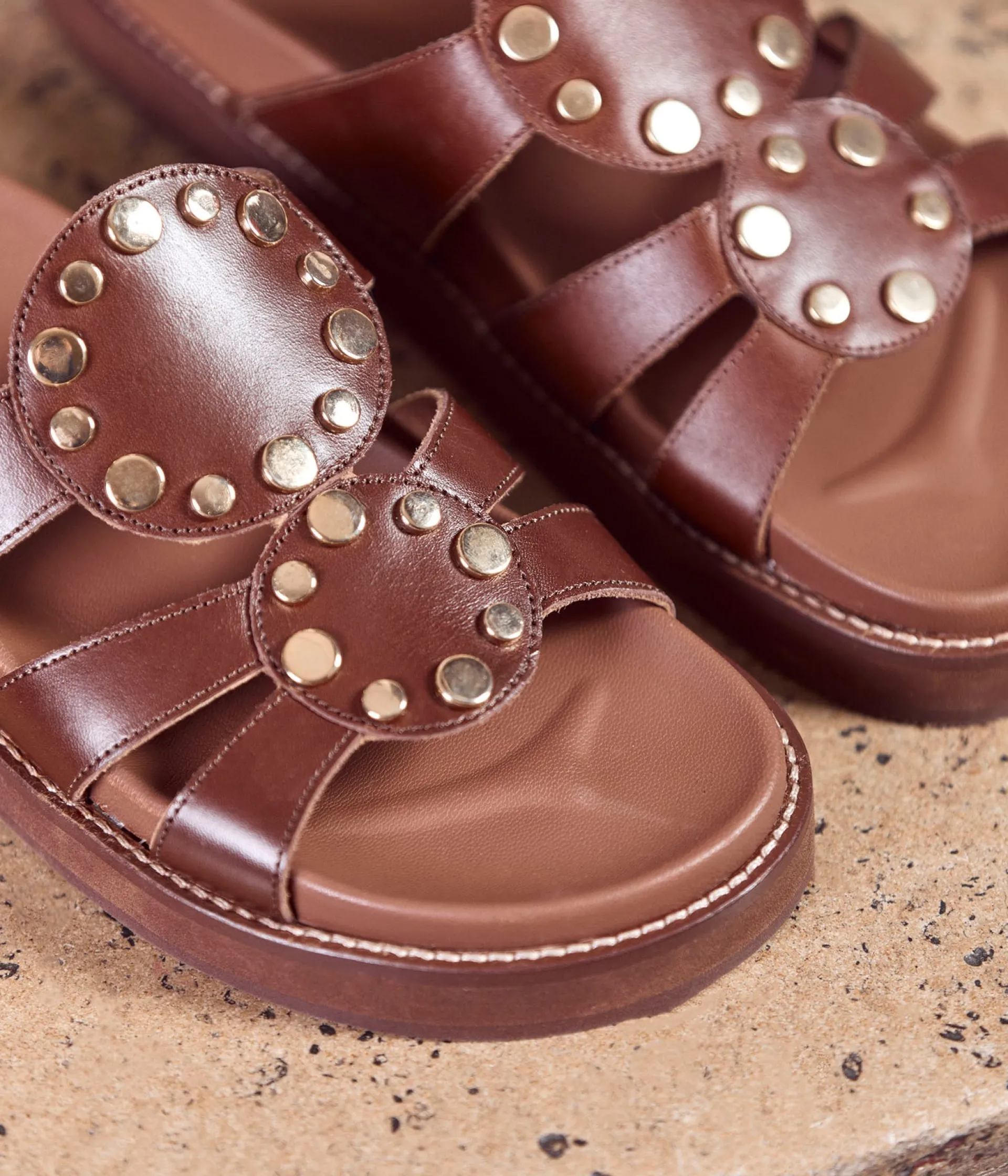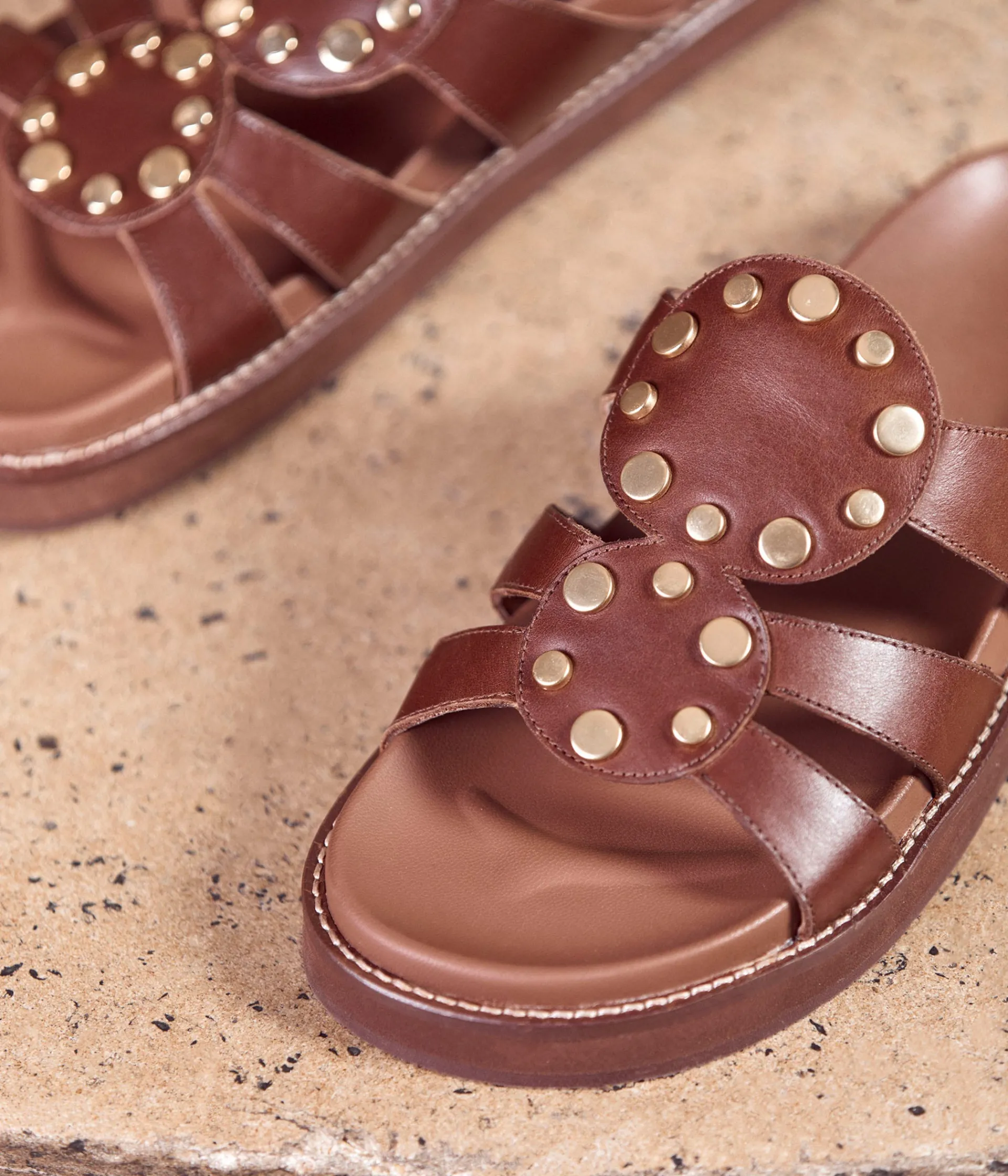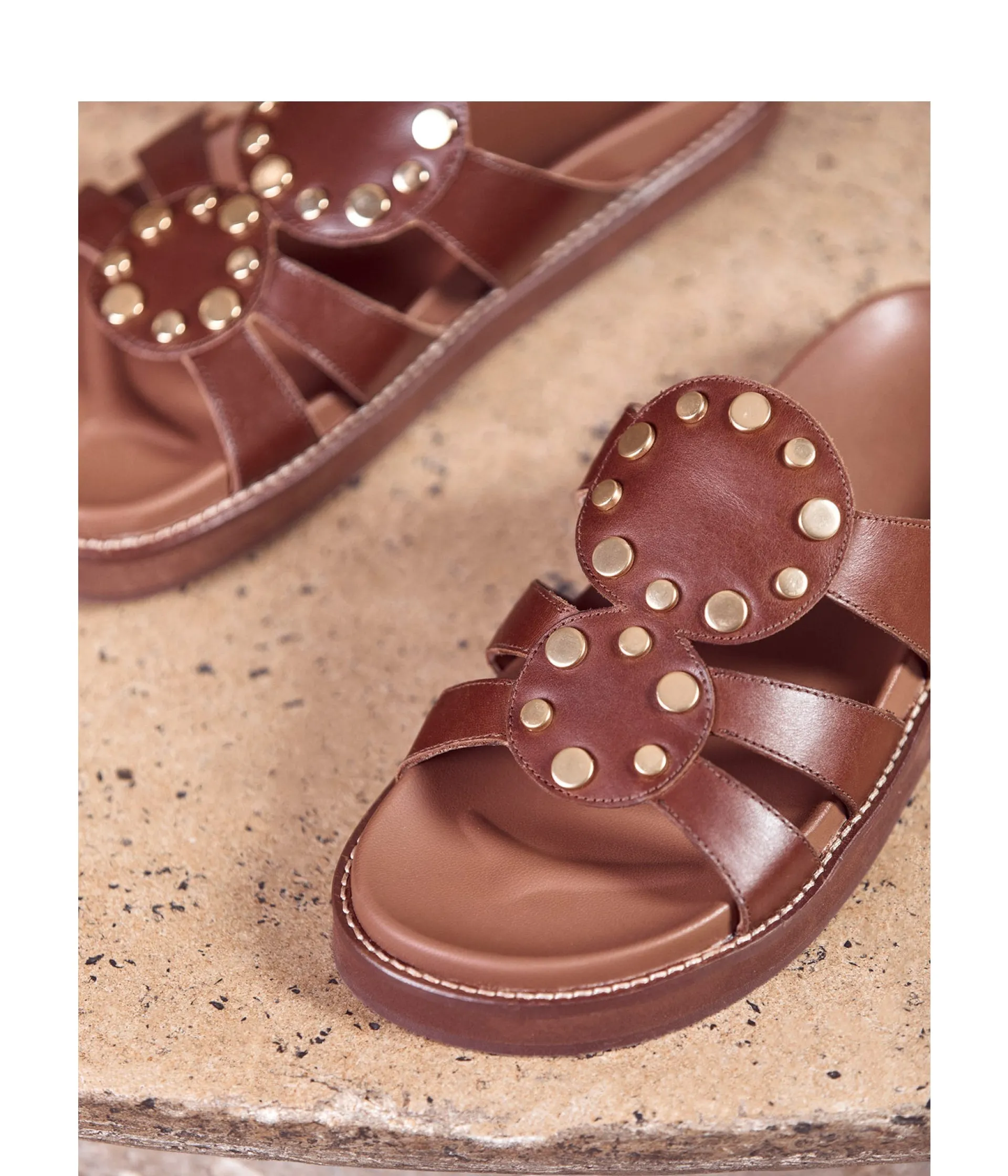 Sur une plage d’Ibiza (oui ,vous avez piqué les plans vacances de JM Blanquer), d’Hydra ou dans les calanques marseillaises (pour celles qui checkent leur bilan carbone), vous aurez la paire à instagramer. Elle s’appelle Ana : cuir terracotta, clous dorés et célébration de l’été.