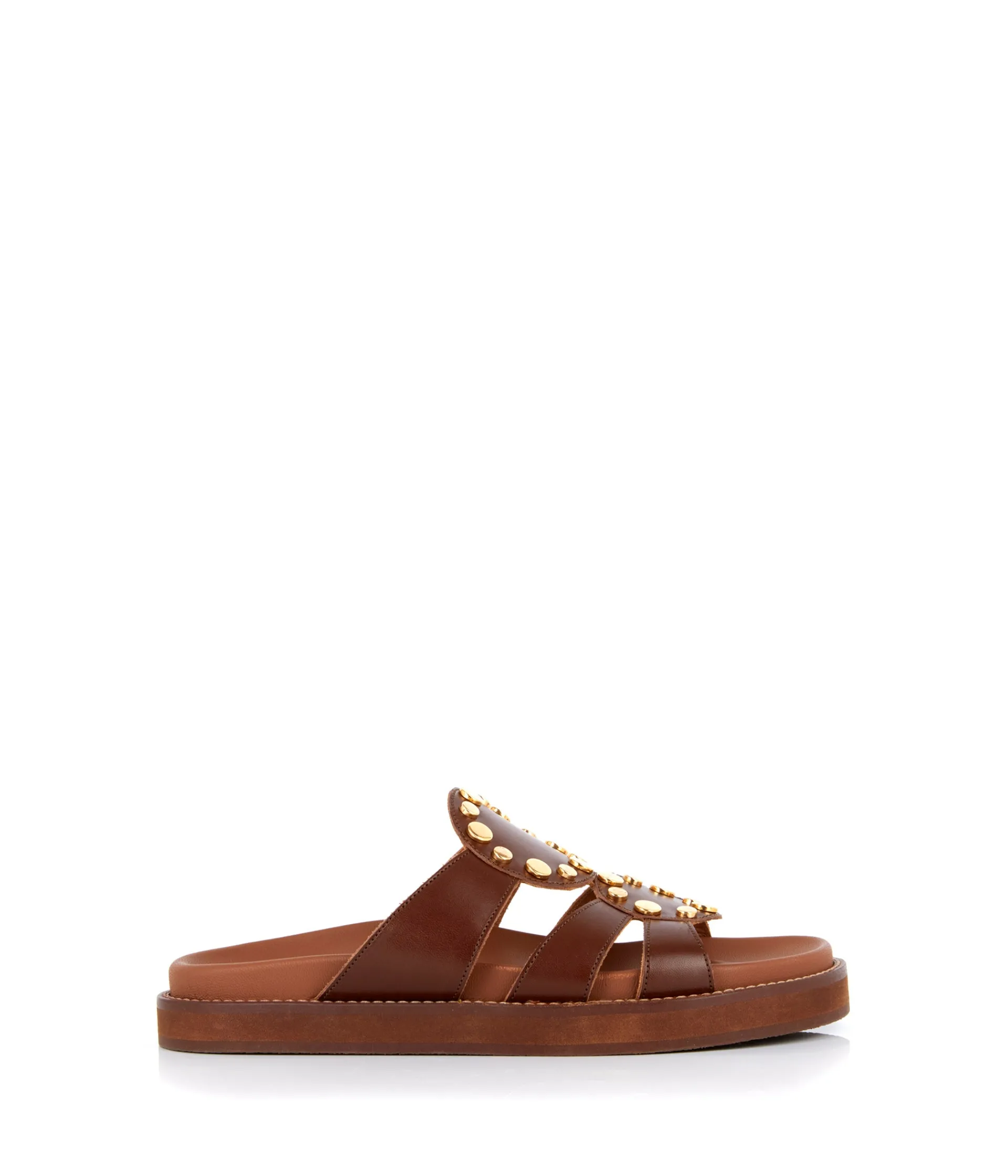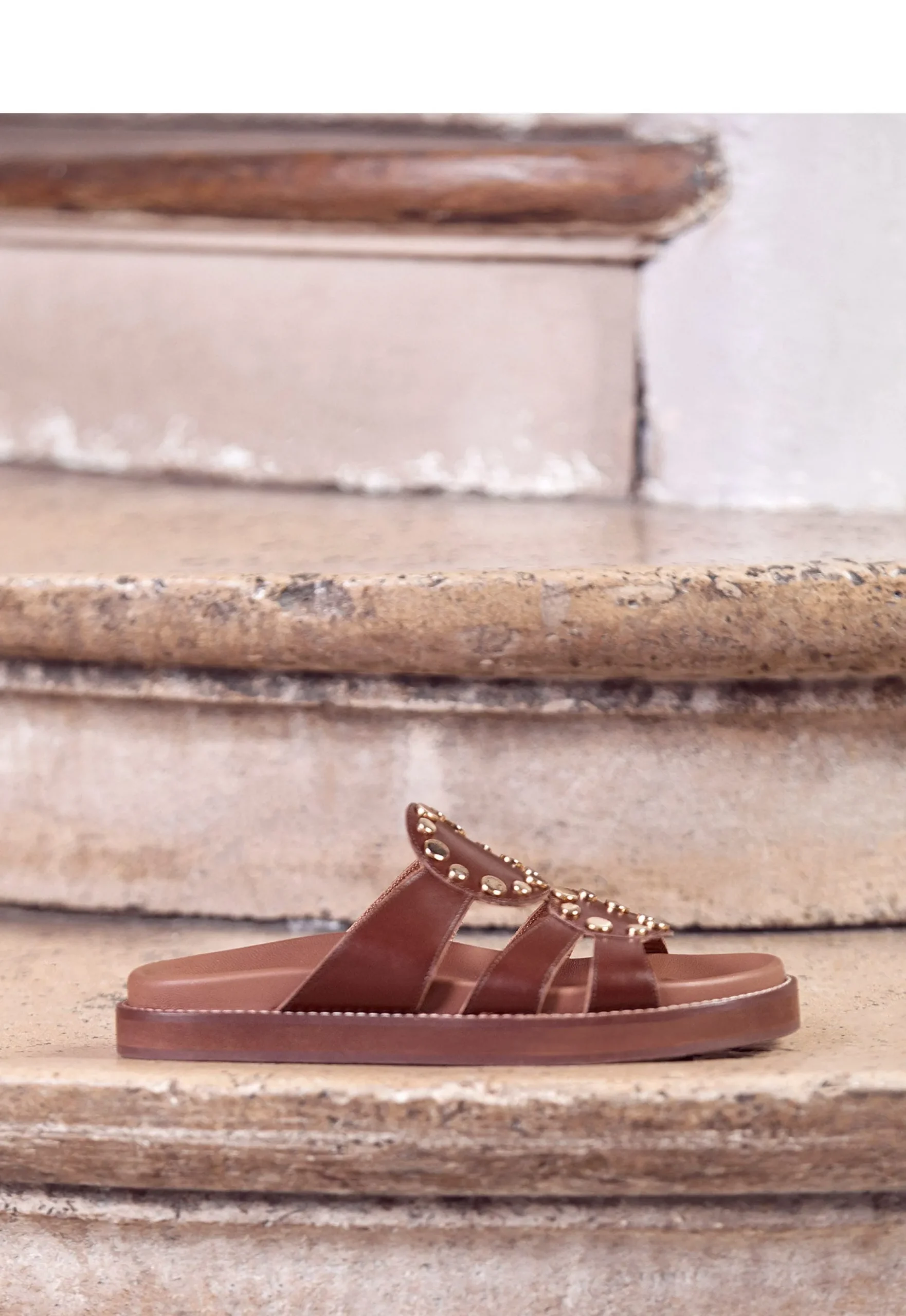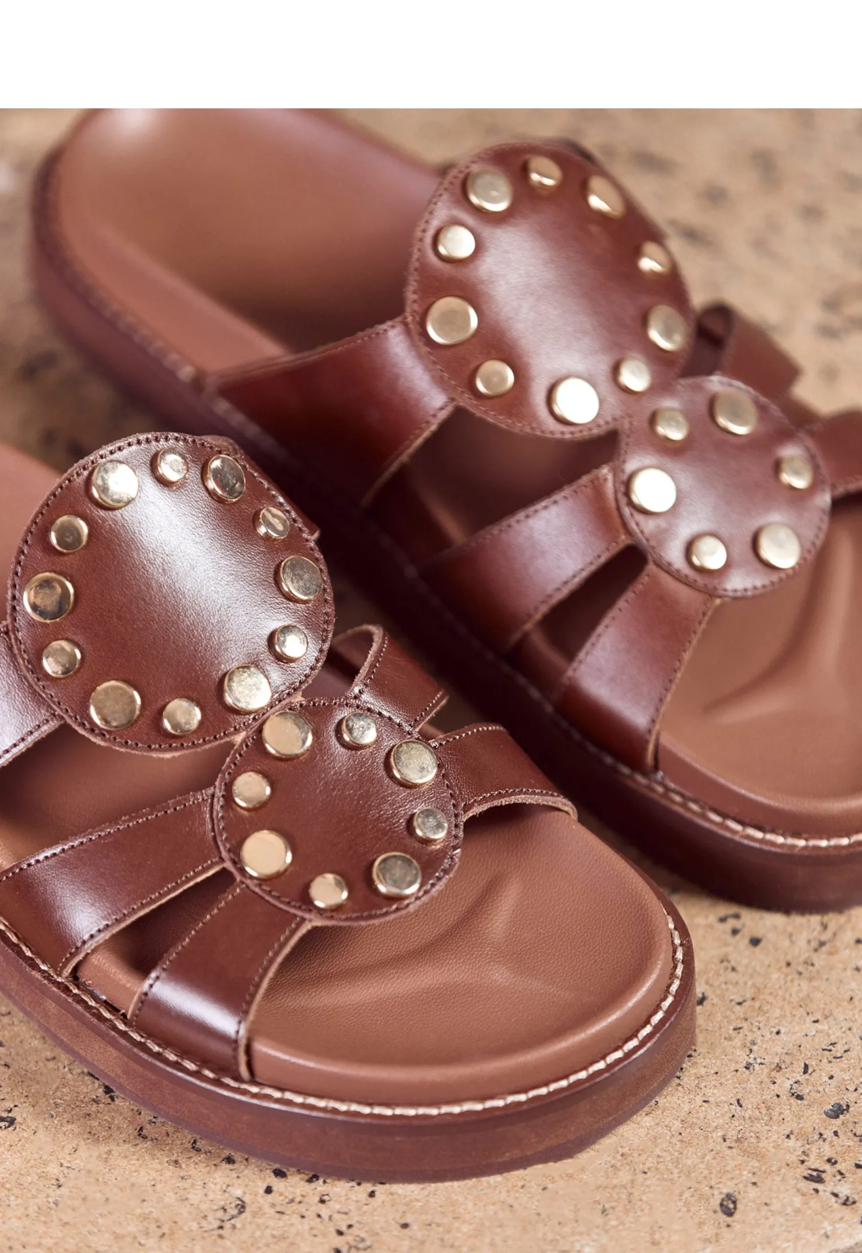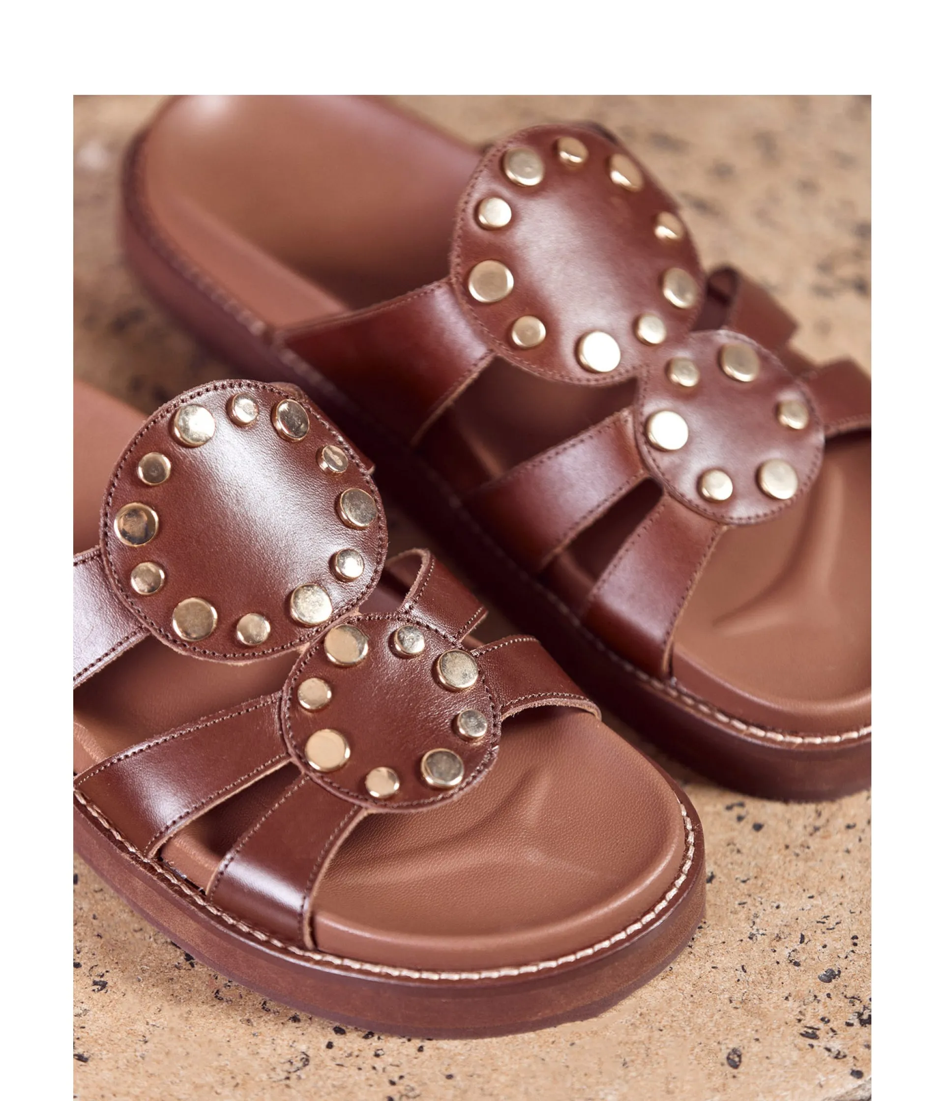 Sur une plage d’Ibiza (oui ,vous avez piqué les plans vacances de JM Blanquer), d’Hydra ou dans les calanques marseillaises (pour celles qui checkent leur bilan carbone), vous aurez la paire à instagramer. Elle s’appelle Ana : cuir terracotta, clous dorés et célébration de l’été.