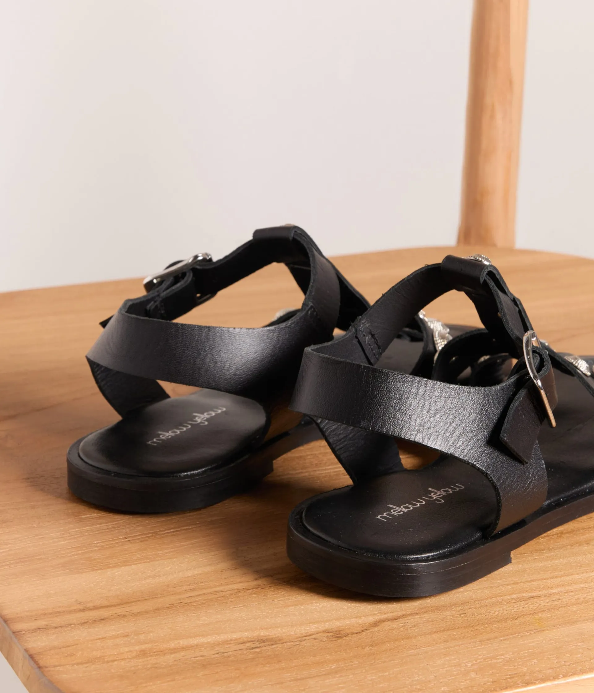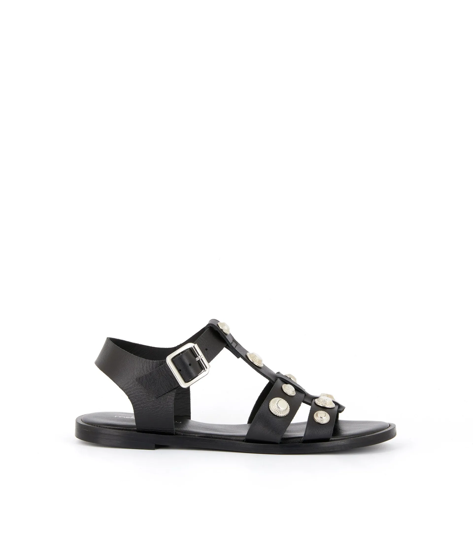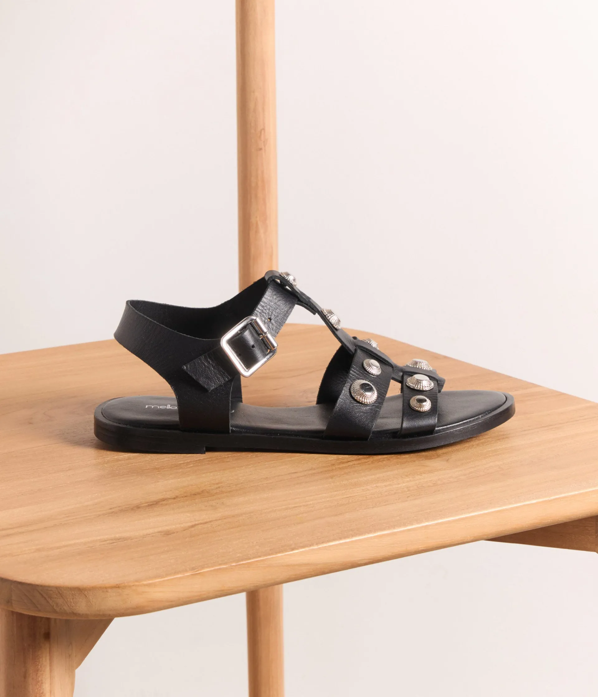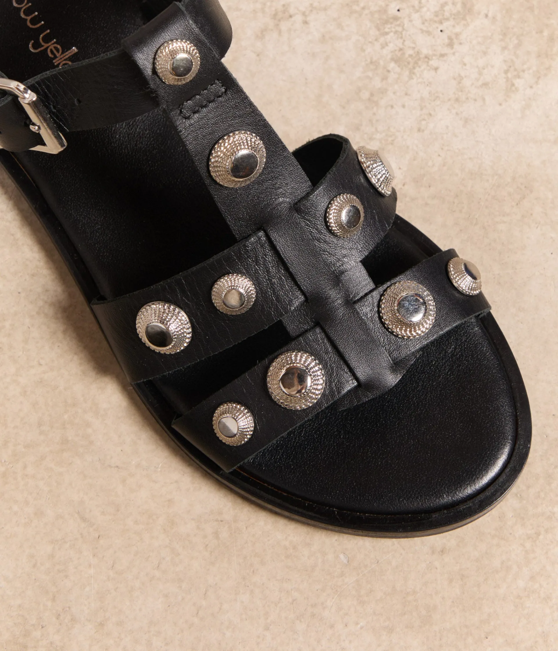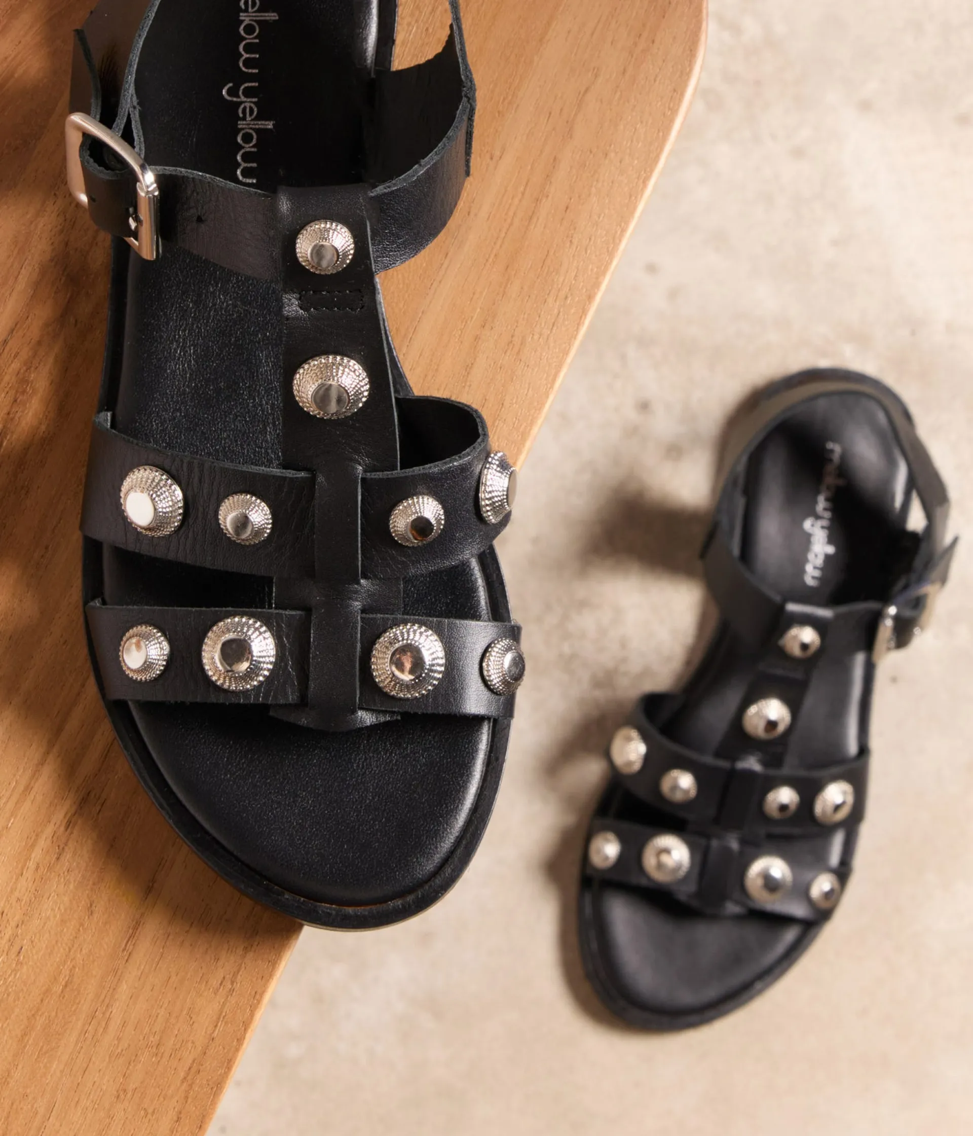 Décor maxi clous sur brides en cuir noir : le bon twist pour les beaux jours. L’heure de révéler la Patti Smith, Courtney Love, Dolores O’Riordan (Cranberries) ou Avril Lavigne qui sommeille en vous.