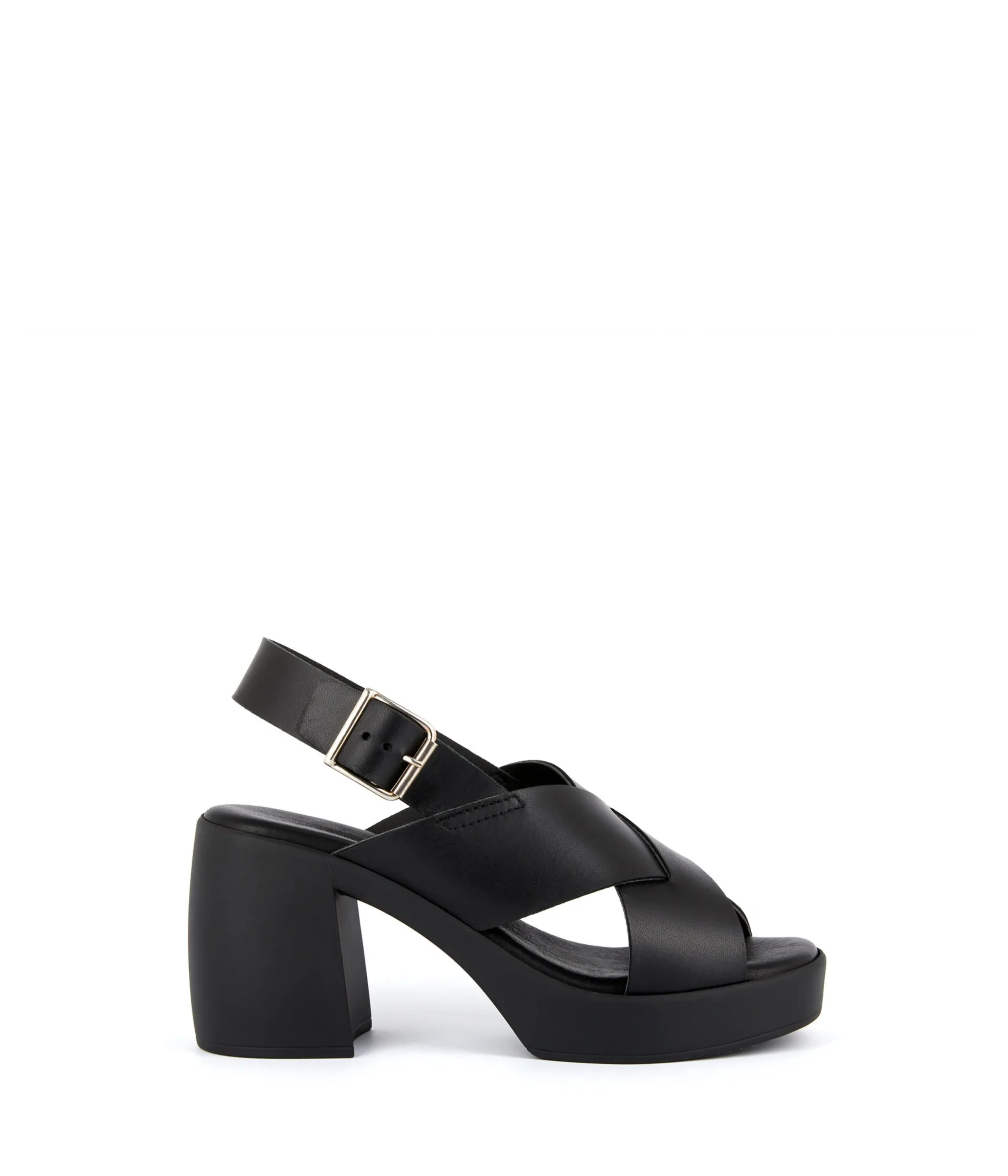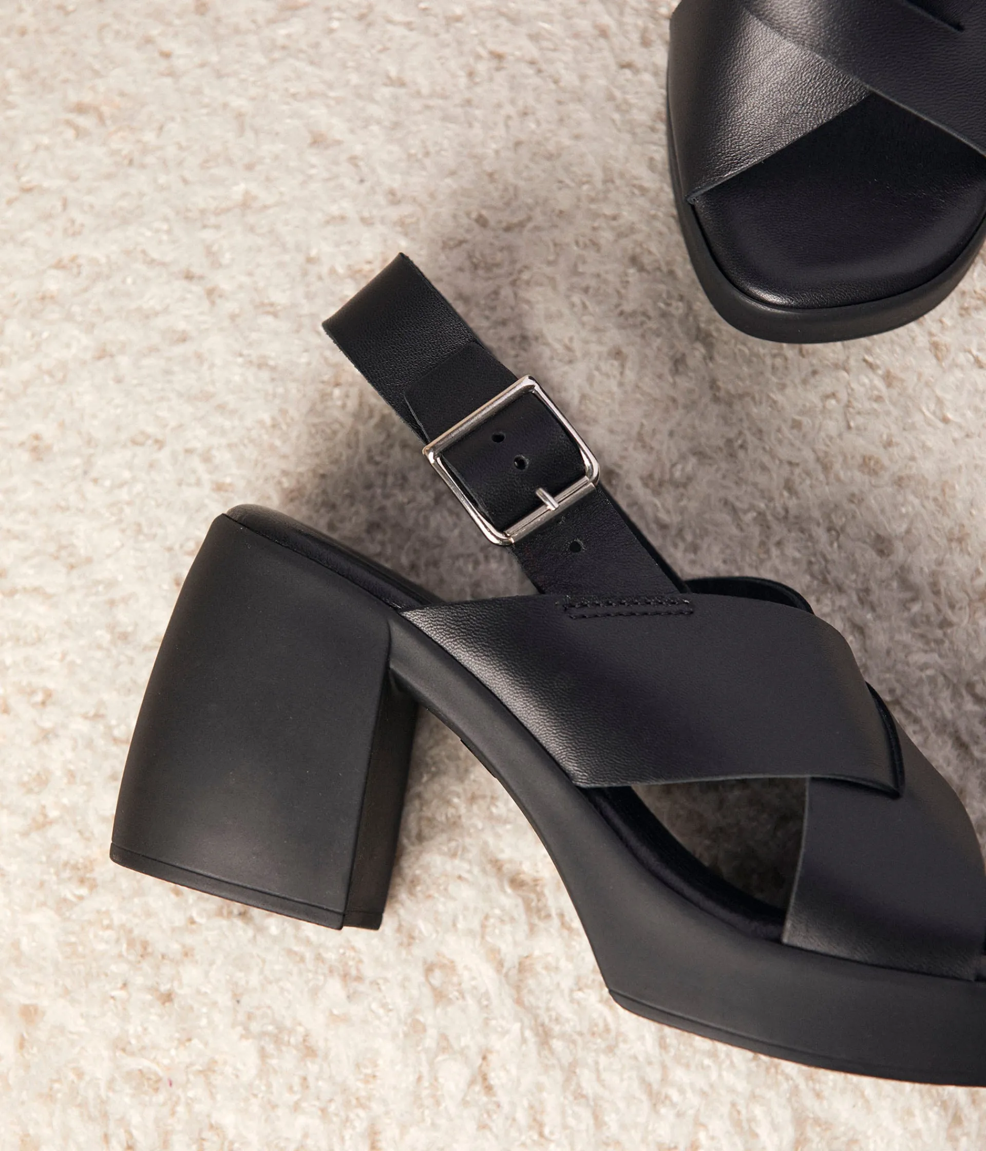 La mode est sur écoute. Pour suivre la tendance, dressez l’oreille. Ou plutôt, prenez de la hauteur, perchée sur les sandales Perine. Un véritable OCNI, pour Objet Chaussant Non Identifié, à larges brides en cuir noir sur maxi talon et plateforme, en provenance d’Italie.