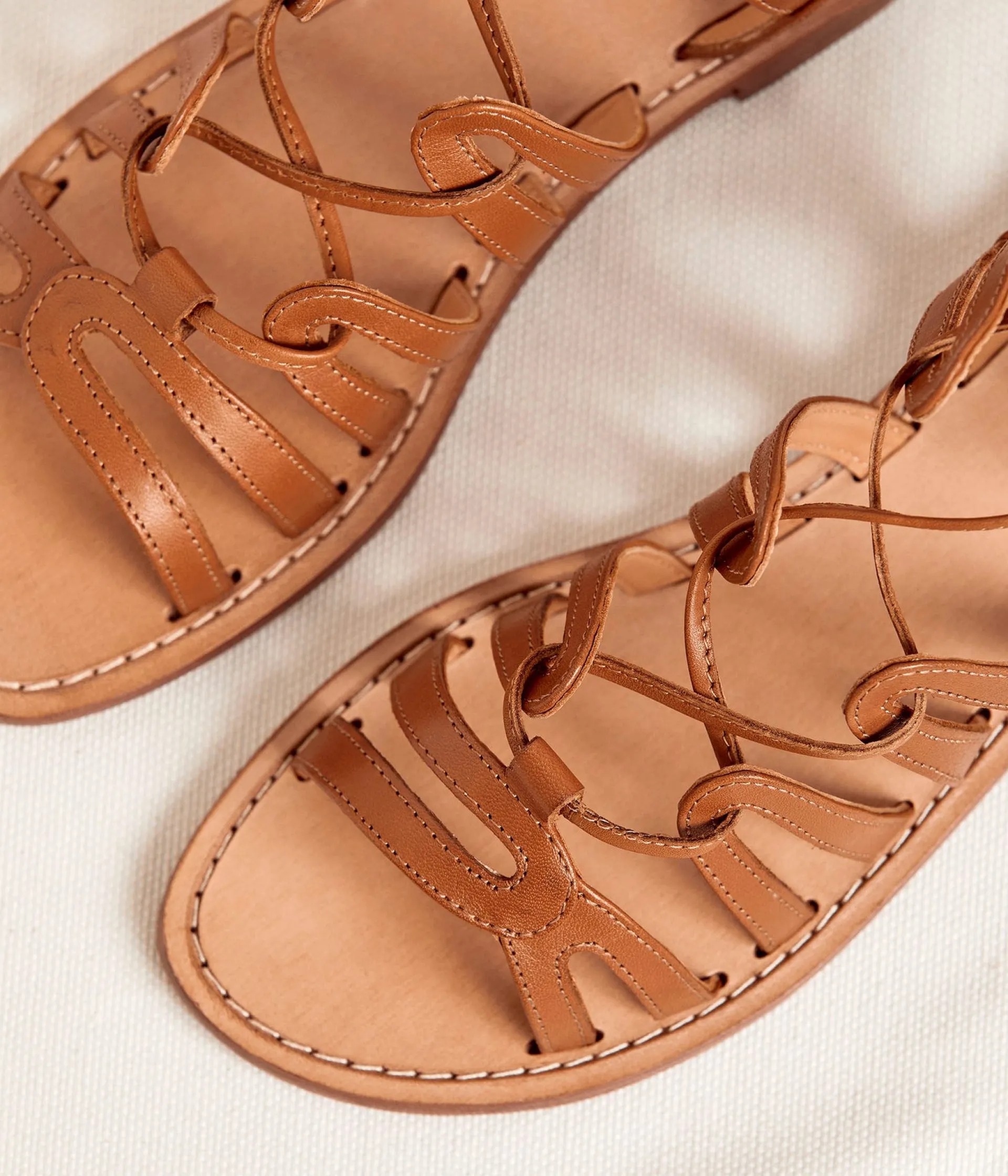 Rien de spartiate dans cette paire de sandales Leigh couleur cognac, si ce n’est peut-être sa semelle plate. Un laç…