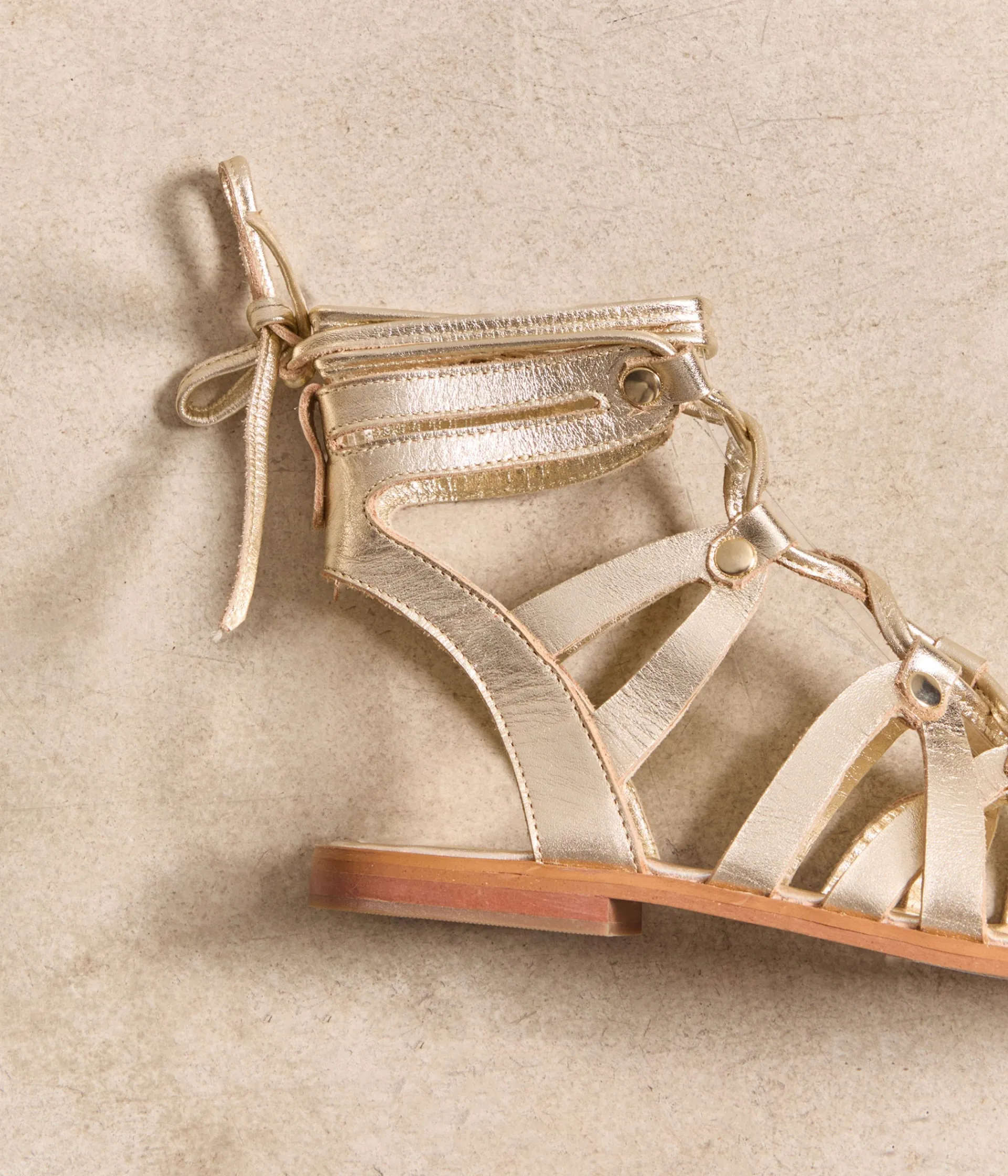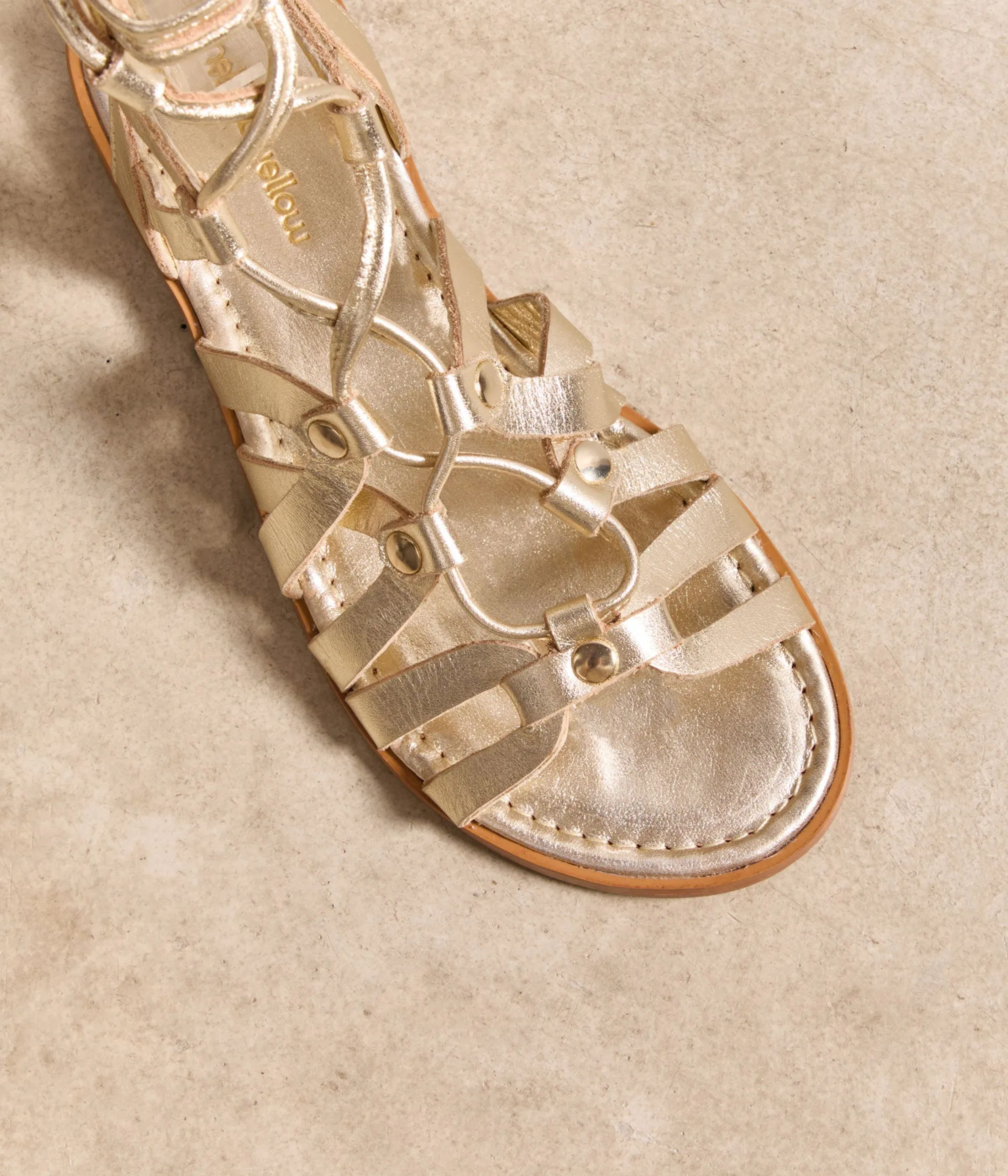Hello, le soleil brille, brille, brille ! Un concurrent de taille pour les sandales-spartiates Golda en cuir doré. On valide leur jeu de brides multiples, pour en profiter jusqu’au bout des orteils.