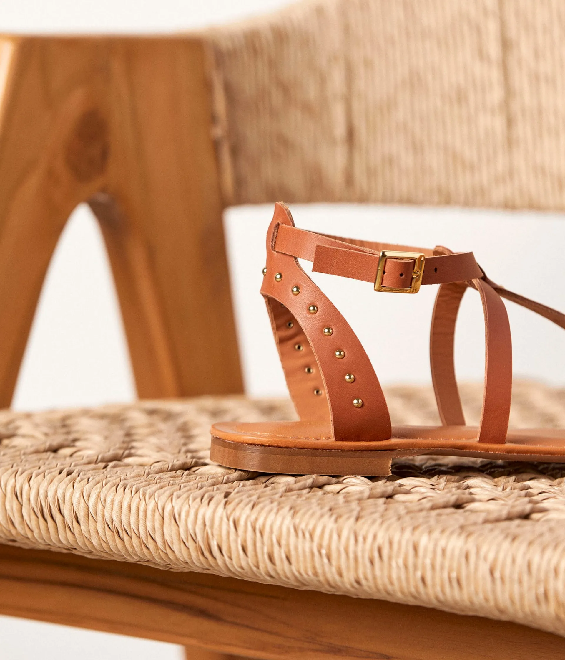 Oubliez Alice au pays des merveilles. Découvrez Alice au pays du rock en été. C’est le pari fou de ces sandales forme tongs, qui partagent le même prénom. Plates, en cuir camel, elles sont décorées de clous dorés sur la bride du dessus du pied. Mode easy métal activé.