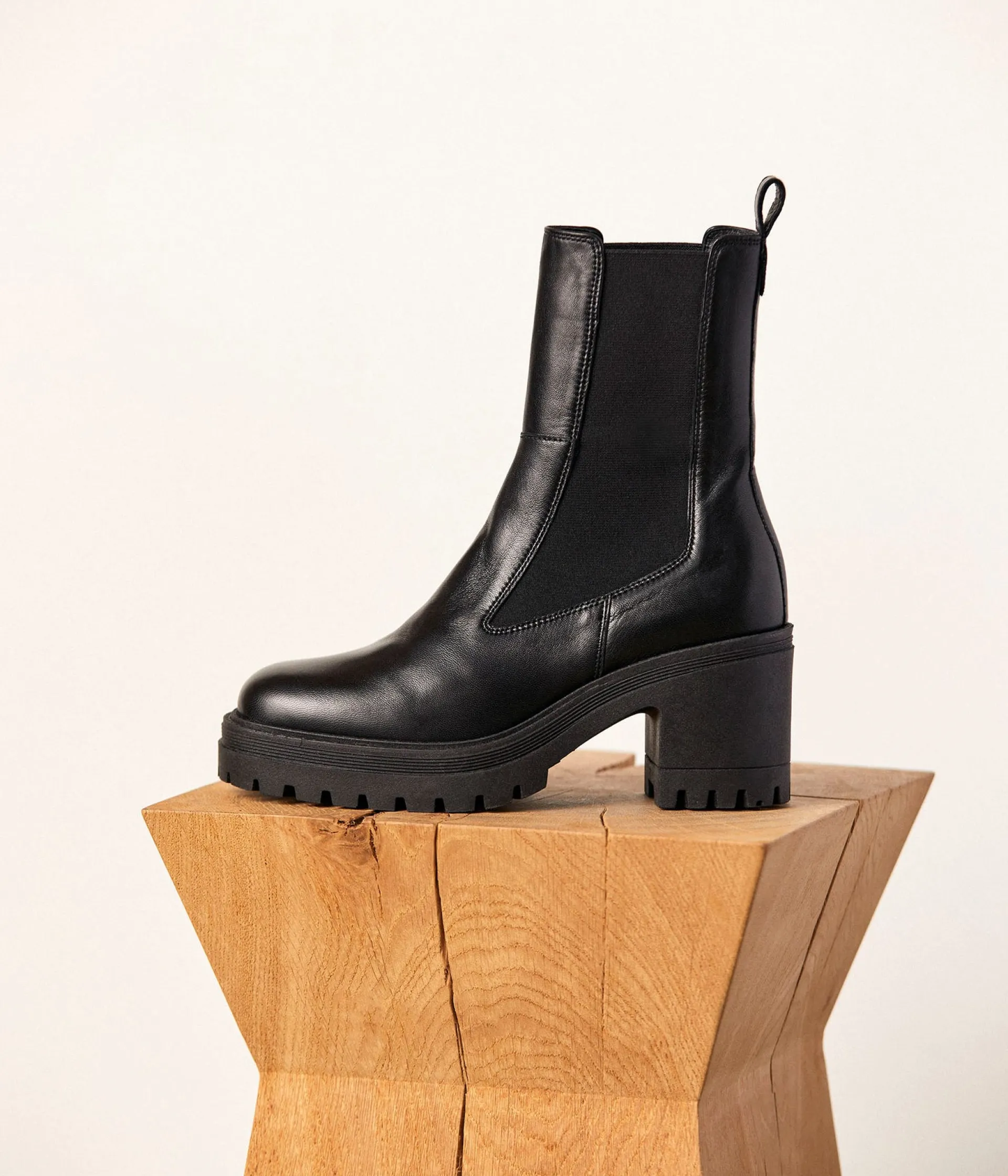 Montée sur ressorts, ou plutôt sur une semelle crantée de 8cm de haut, vous aurez toute la latitude de ne pas tenir en place avec votre paire de chelsea boots Alix en cuir noir. Peur de ne pas avoir la patience de les enfiler? Pas de problème, on a prévu le coup avec le double élastique.