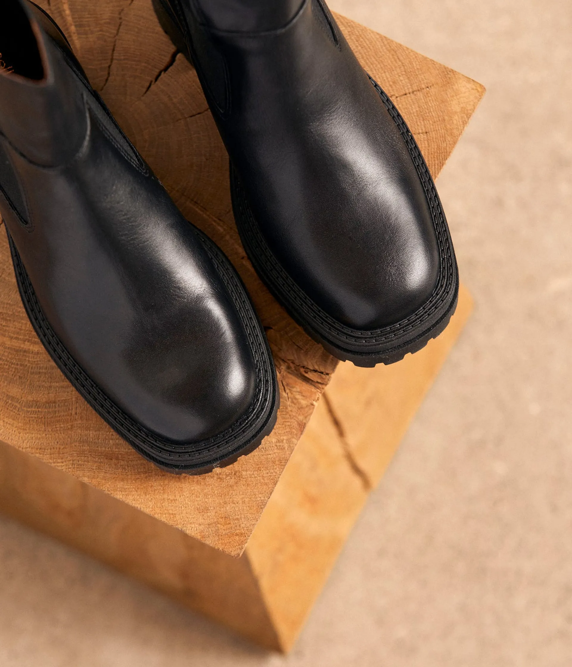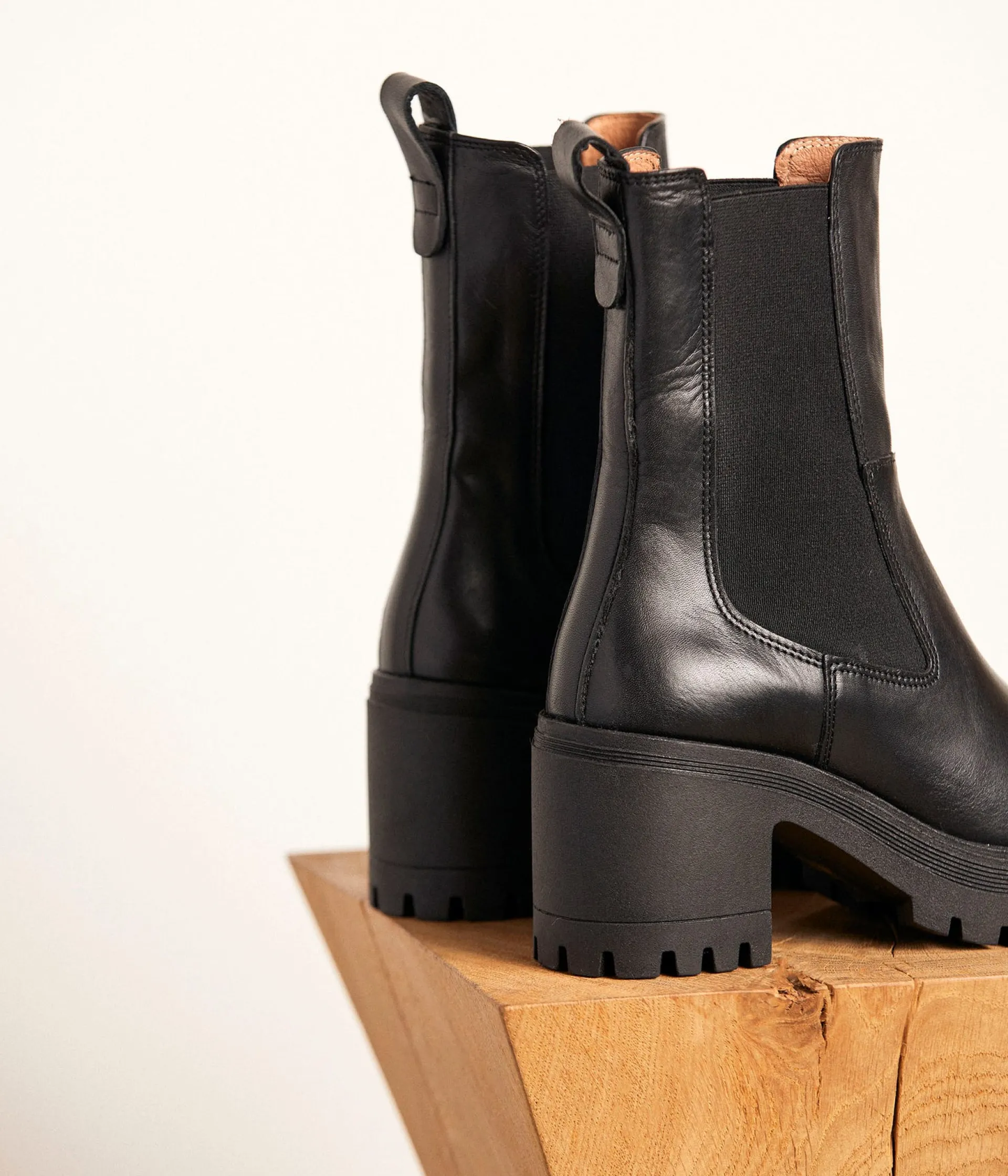 Montée sur ressorts, ou plutôt sur une semelle crantée de 8cm de haut, vous aurez toute la latitude de ne pas tenir en place avec votre paire de chelsea boots Alix en cuir noir. Peur de ne pas avoir la patience de les enfiler? Pas de problème, on a prévu le coup avec le double élastique.