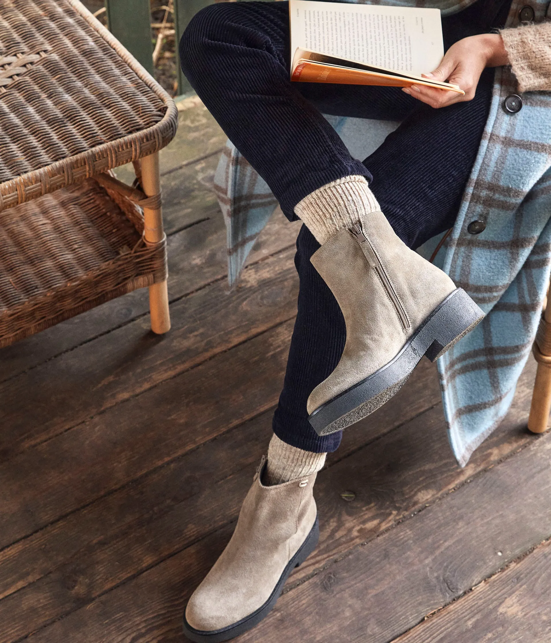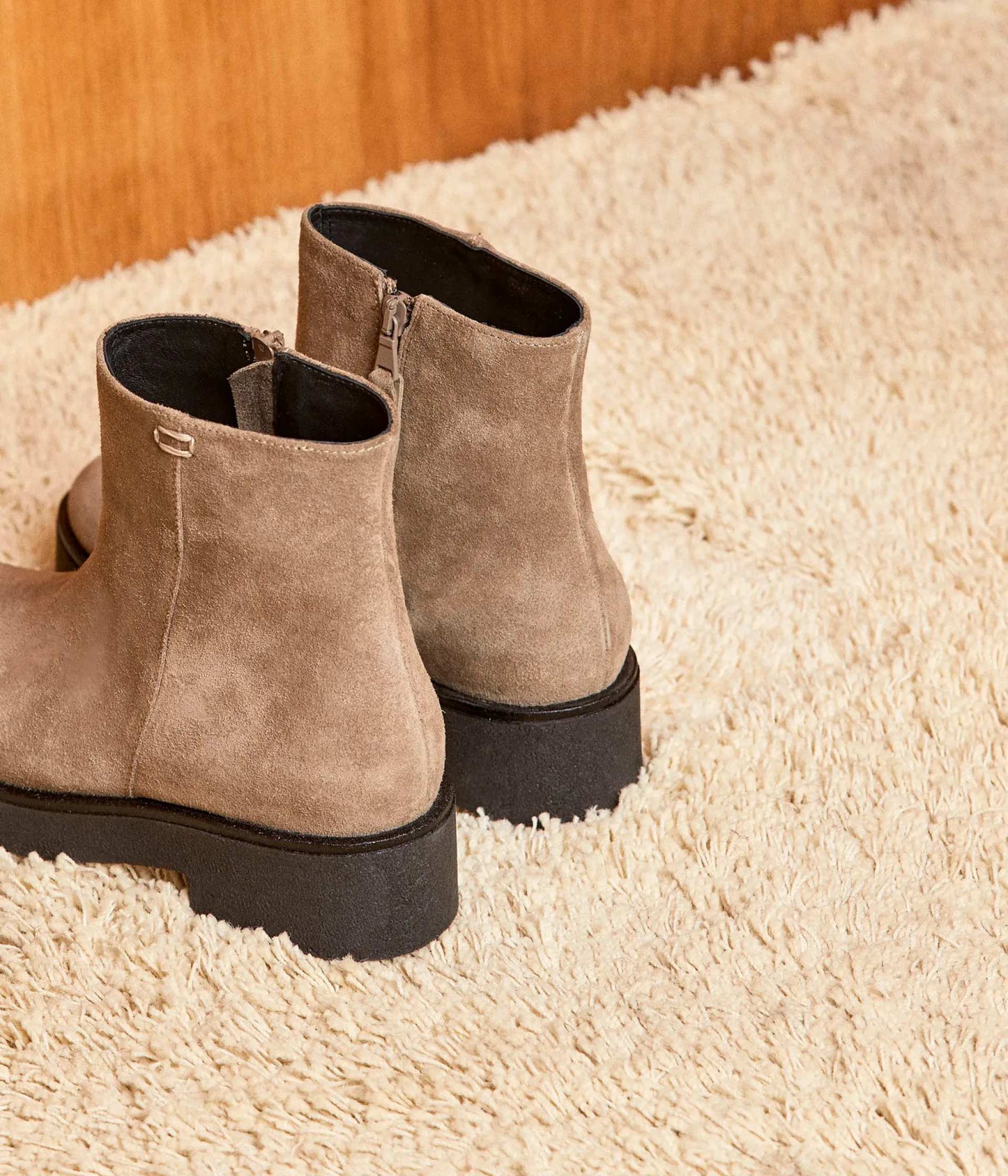Pour fouler le bitume urbain ou vous accompagner dans une échappée improvisée dans les paysages enneigés, une seule paire : Isaure. En cuir velours taupe sur semelle crêpe, ces boots ne vous laisseront jamais tomber. (Vous l’avez ?)