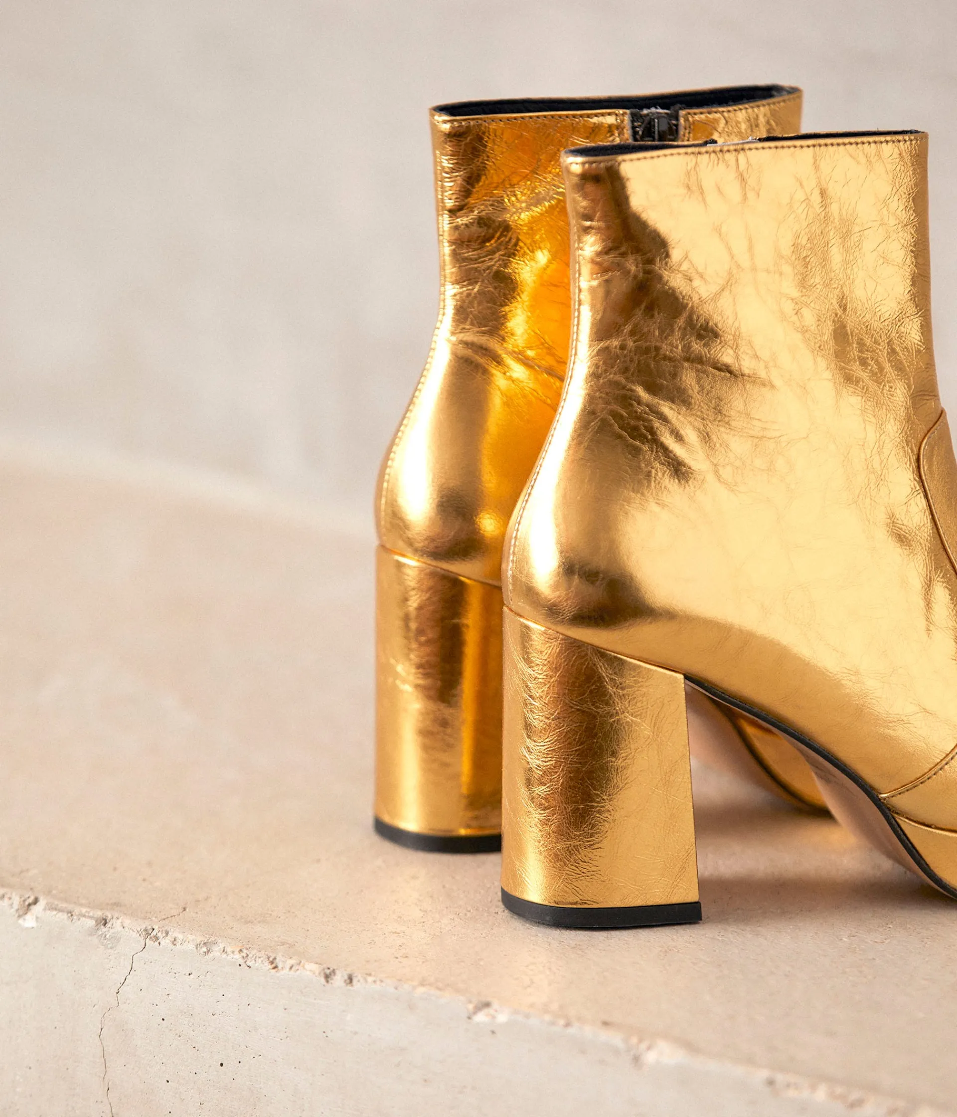 Des boots à talon qui subliment le look. Du cuir doré qui pimente le style. Rép’ à ça, la rentrée ! A vous les airs chics et effrontés. Offrez(-vous) Alissa : un vrai trésor à vos pieds ! Talon : 8,5 cm – Plateforme : 2 cm