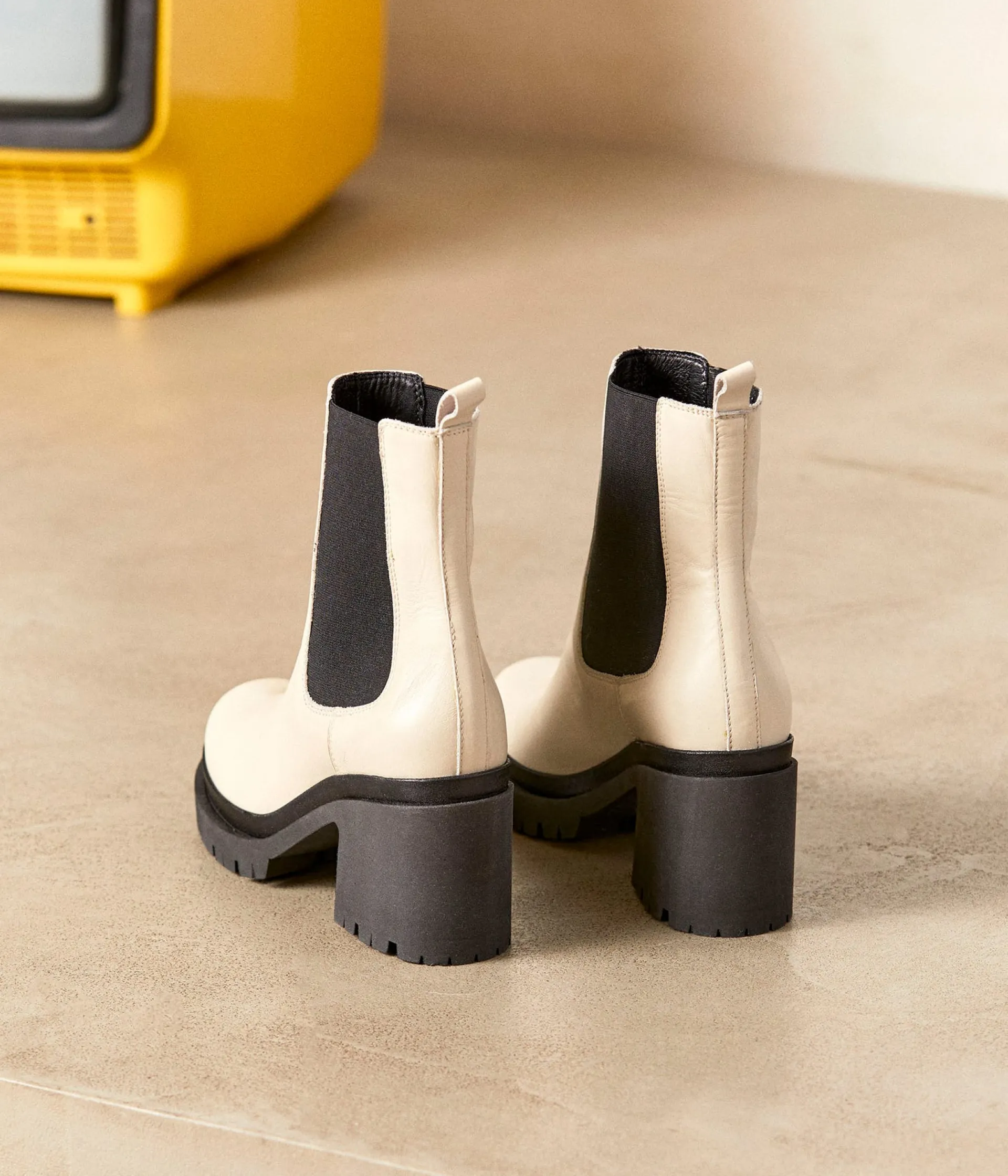 Ready ? Steady ! Go ! La silhouette prend de la vitesse et offre à la garde-robe motocross ses lettres de noblesse mode avec Candice. Une paire de Chelsea boots écrues, montées sur semelle crantée. Expect No Mercy.