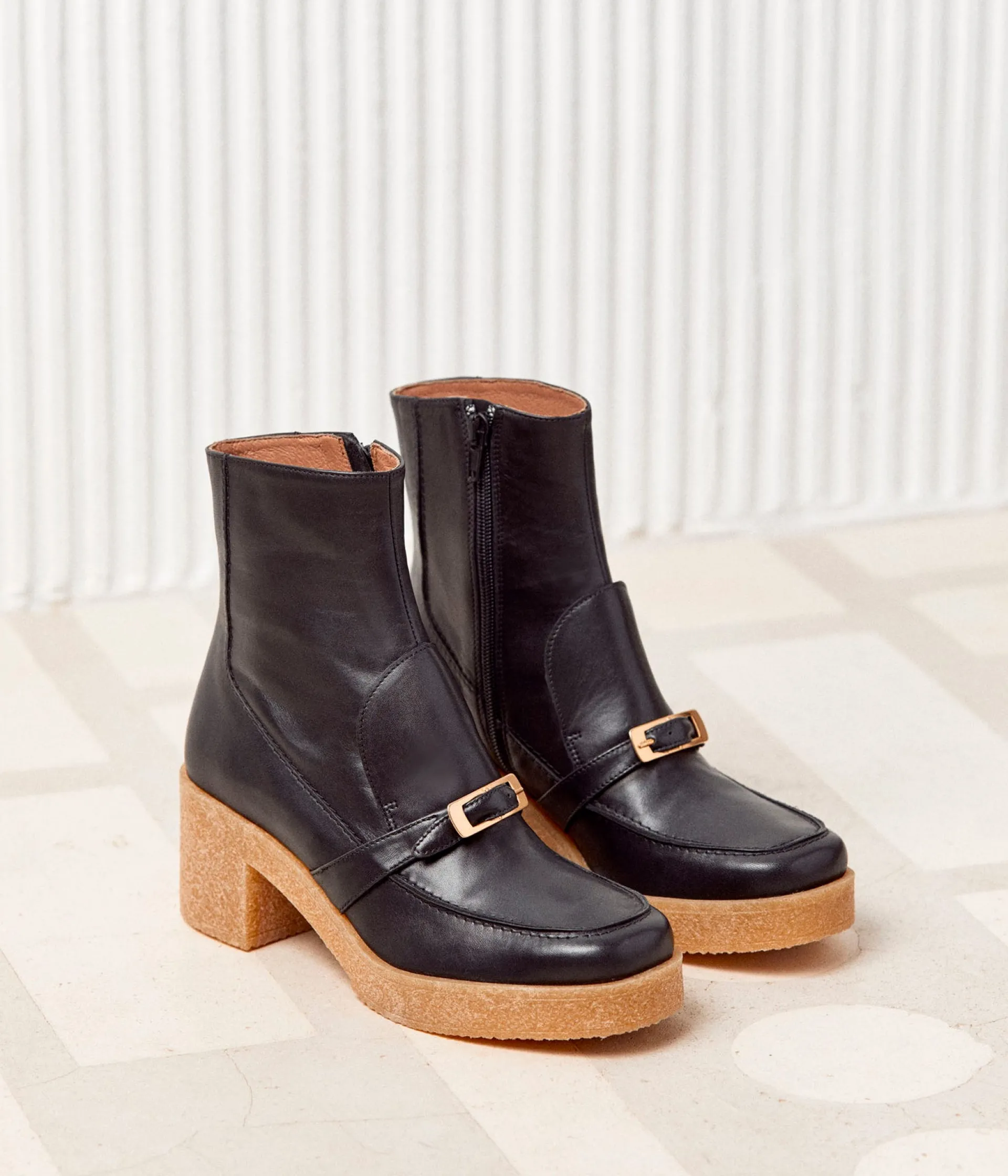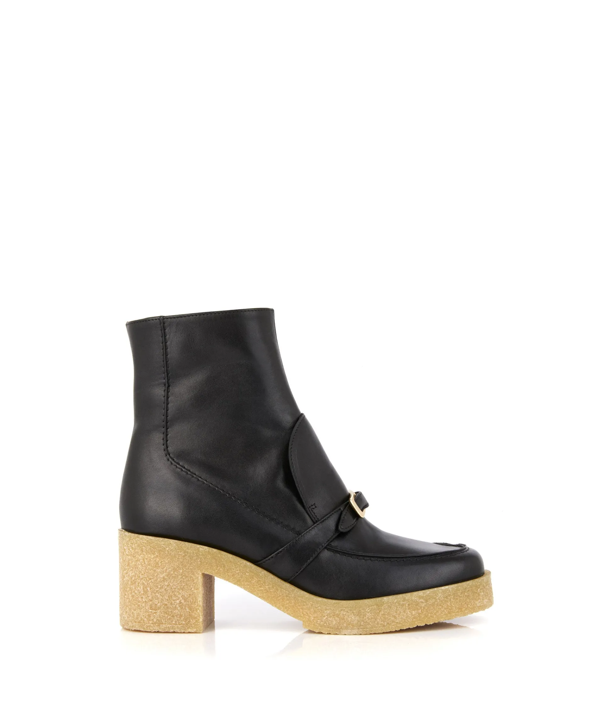 Maribel, c’est la reine de votre vestiaire d’hiver (encore un hommage de trop aux Martin Circus). Une bottine à talon de 6cm et plateforme (merci la cambrure) montée sur une semelle en faux crêpe. Avec une bride décorative pour le mélange des genres.
