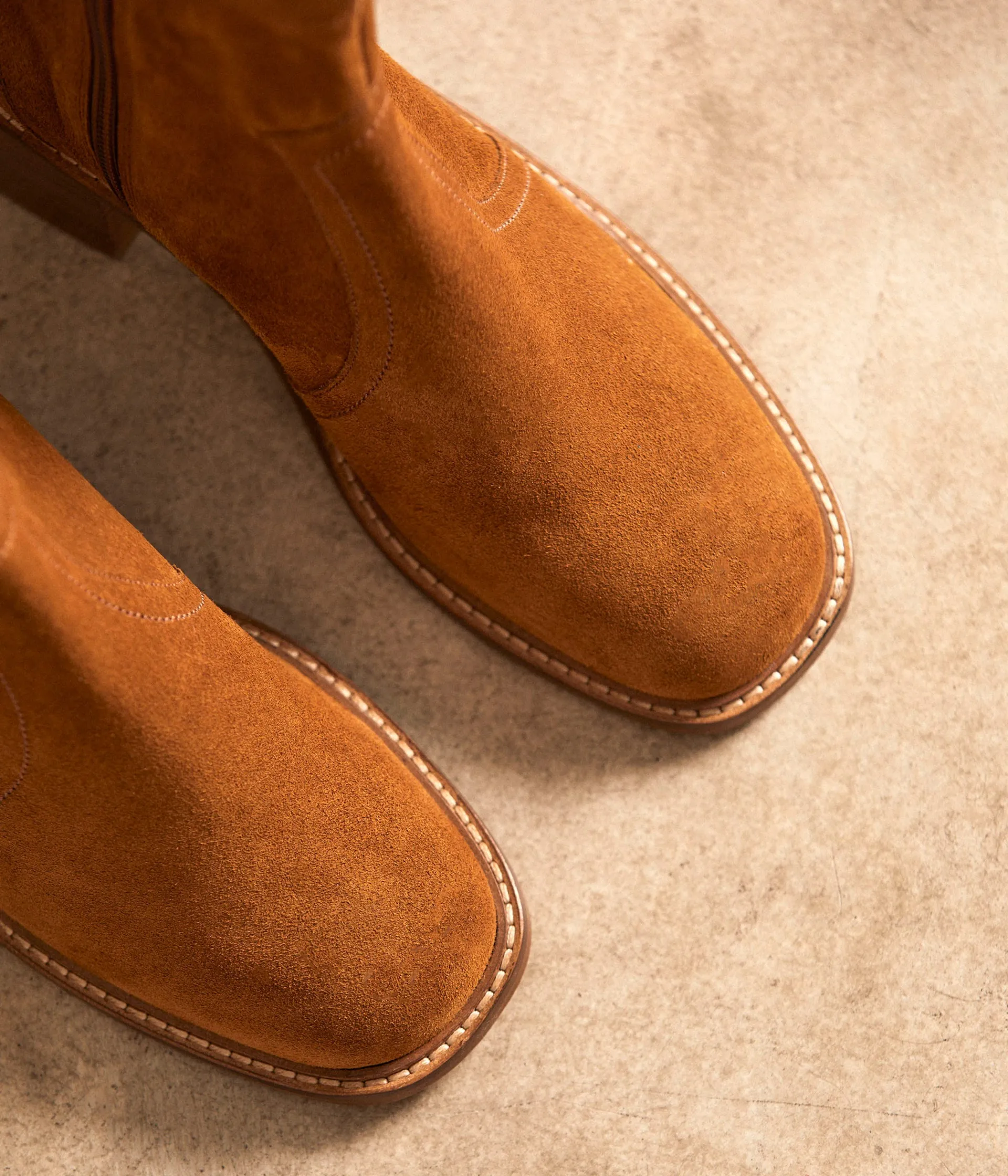 Le blanc + beige : le duo se débarrasse de son image ‘boring’, à condition de le bousculer avec du sportswear. La preuve avec les boots Ann en cuir velours tabac, à talon, à décaler avec un sweat ou un jean cropped blanc.