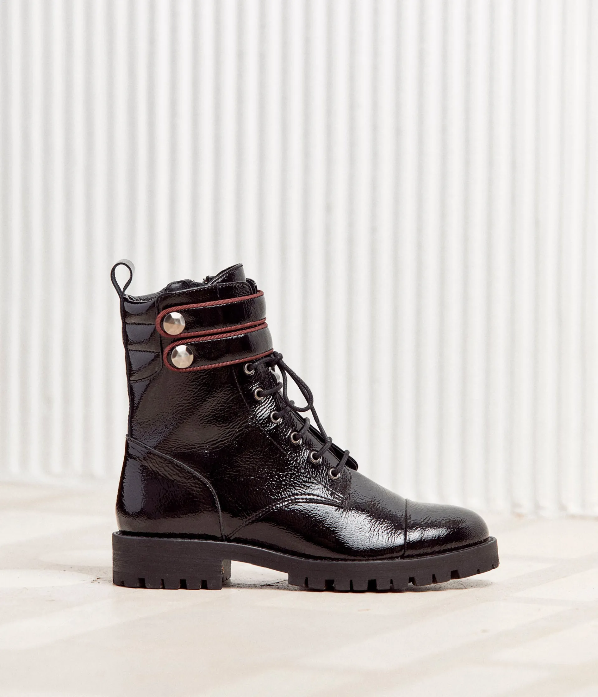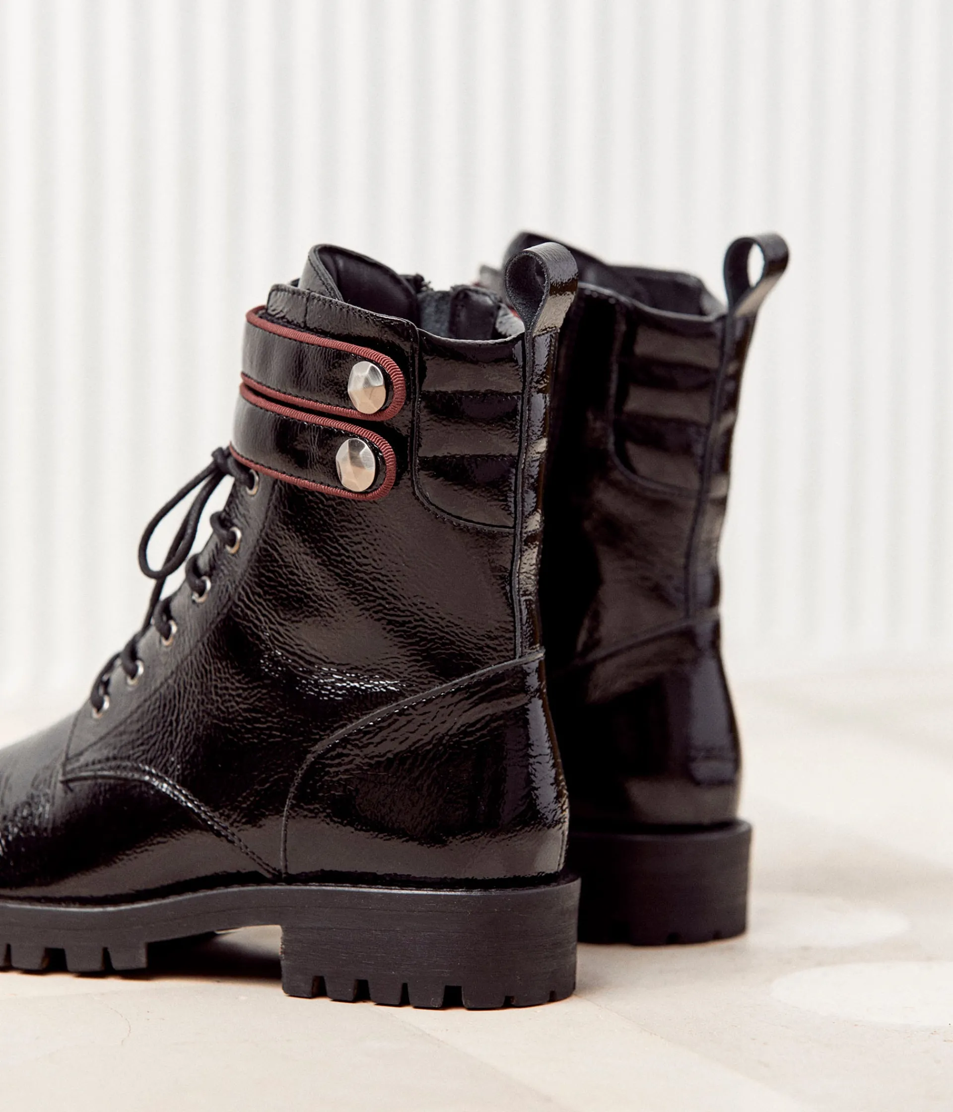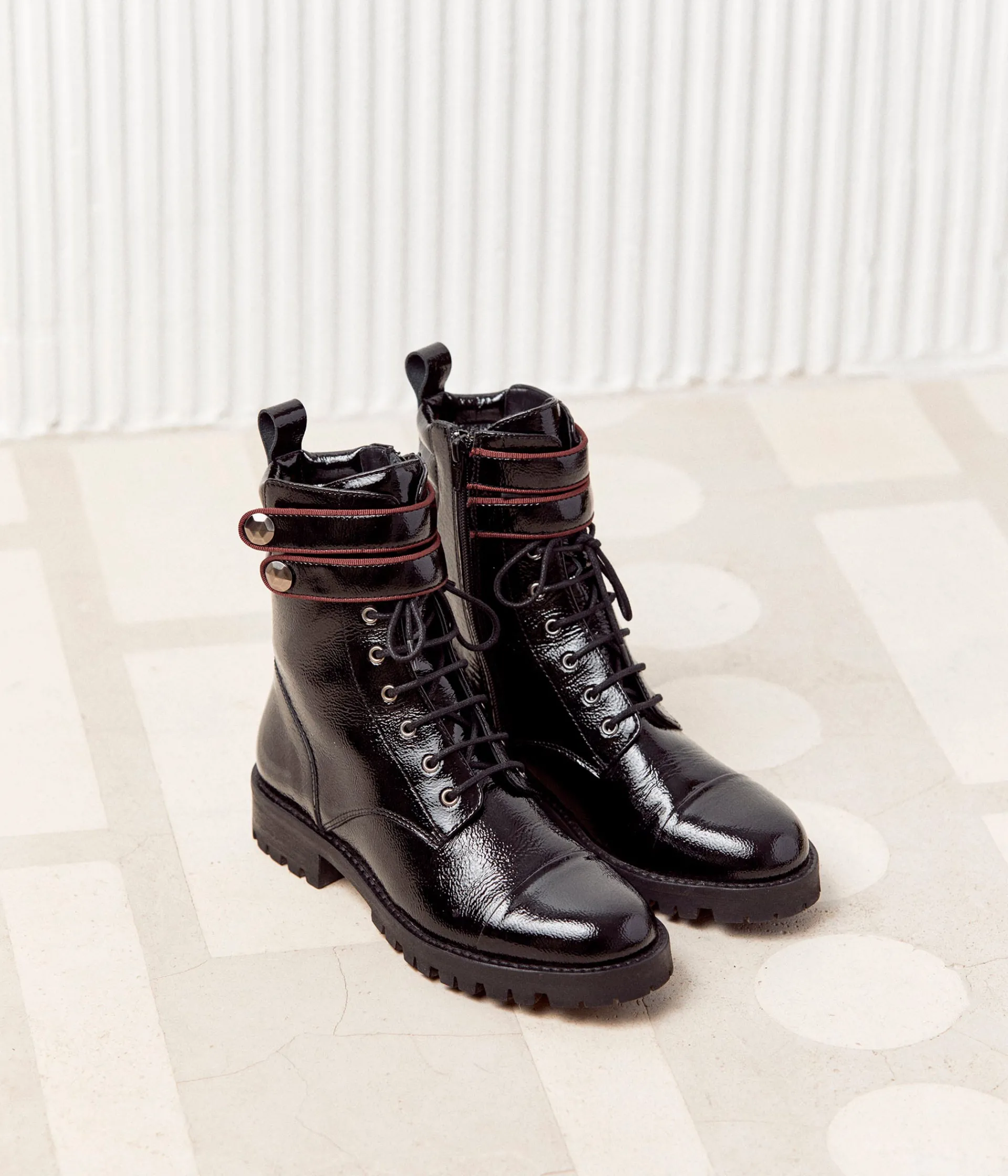 Le signe de ralliement de votre gang ? Ces deux brides à passepoil en gros grain surpiqué bordeaux montées sur votre paire de rangers à grosses semelles. Pratique pour se checker de loin, surtout avec ce cuir verni souple froissé qui est loin de passer inaperçu.