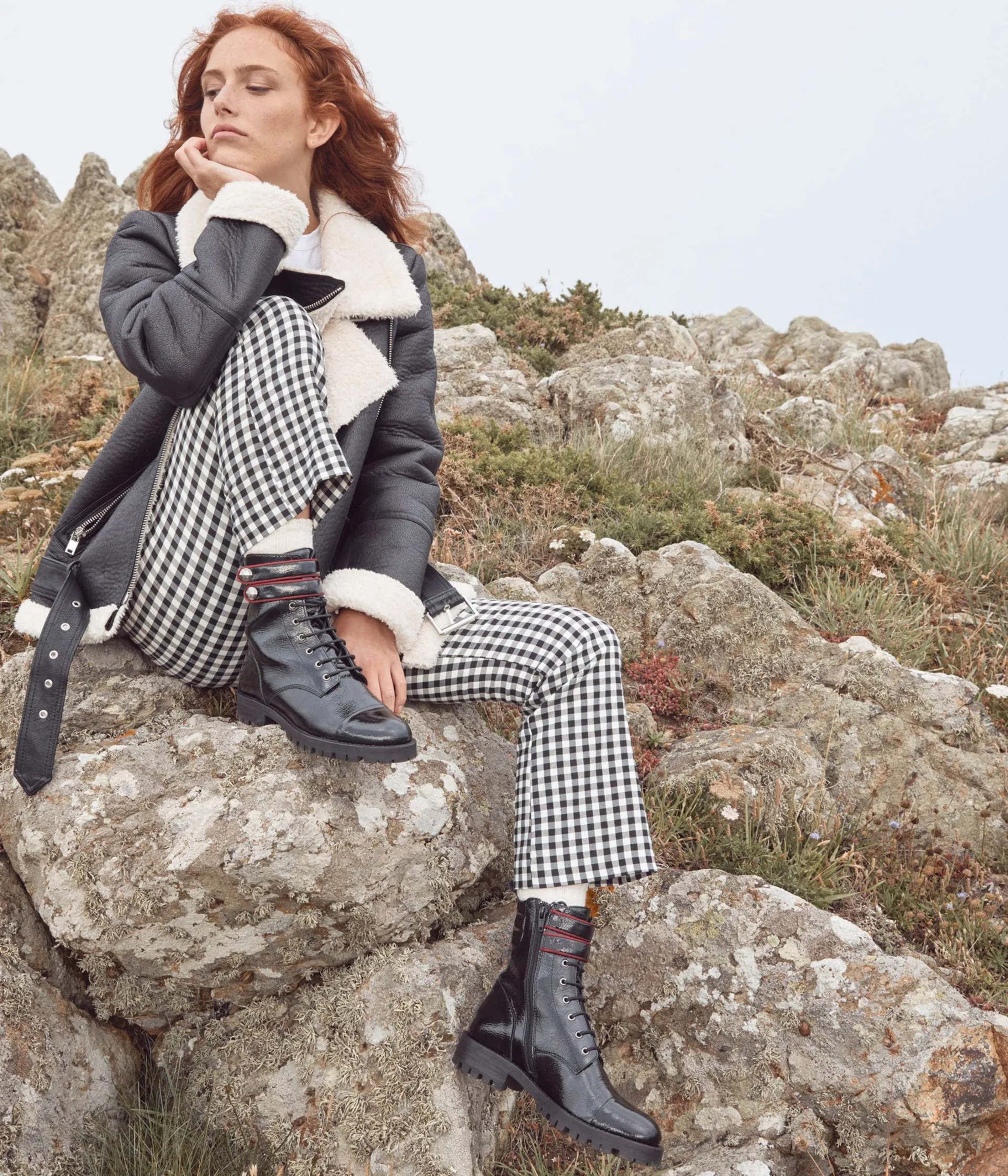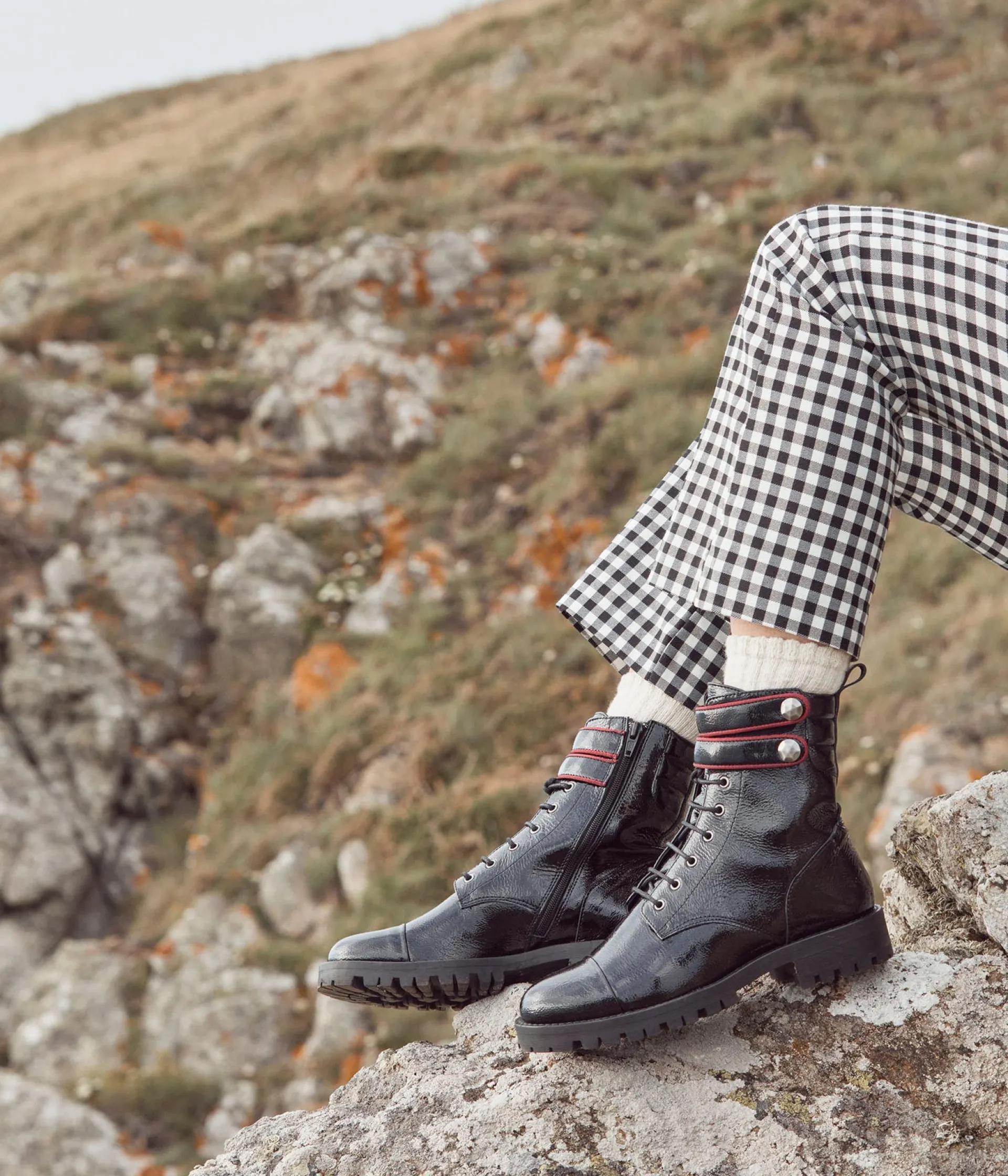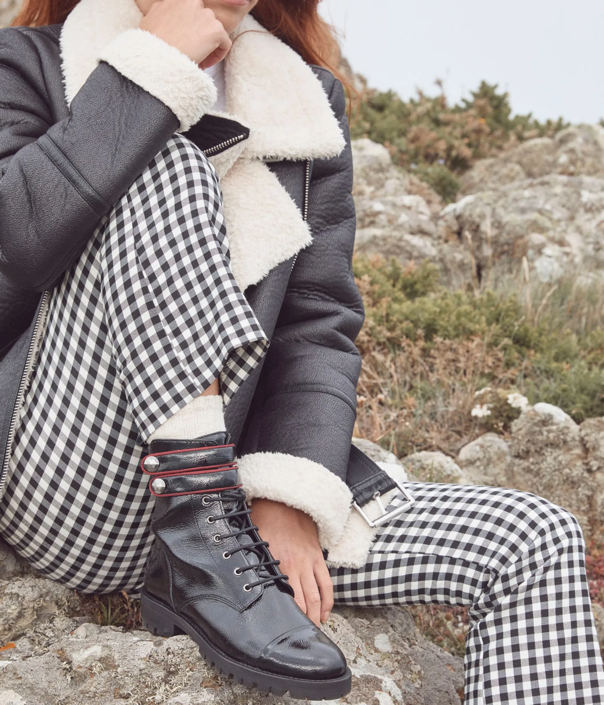 Le signe de ralliement de votre gang ? Ces deux brides à passepoil en gros grain surpiqué bordeaux montées sur votre paire de rangers à grosses semelles. Pratique pour se checker de loin, surtout avec ce cuir verni souple froissé qui est loin de passer inaperçu.