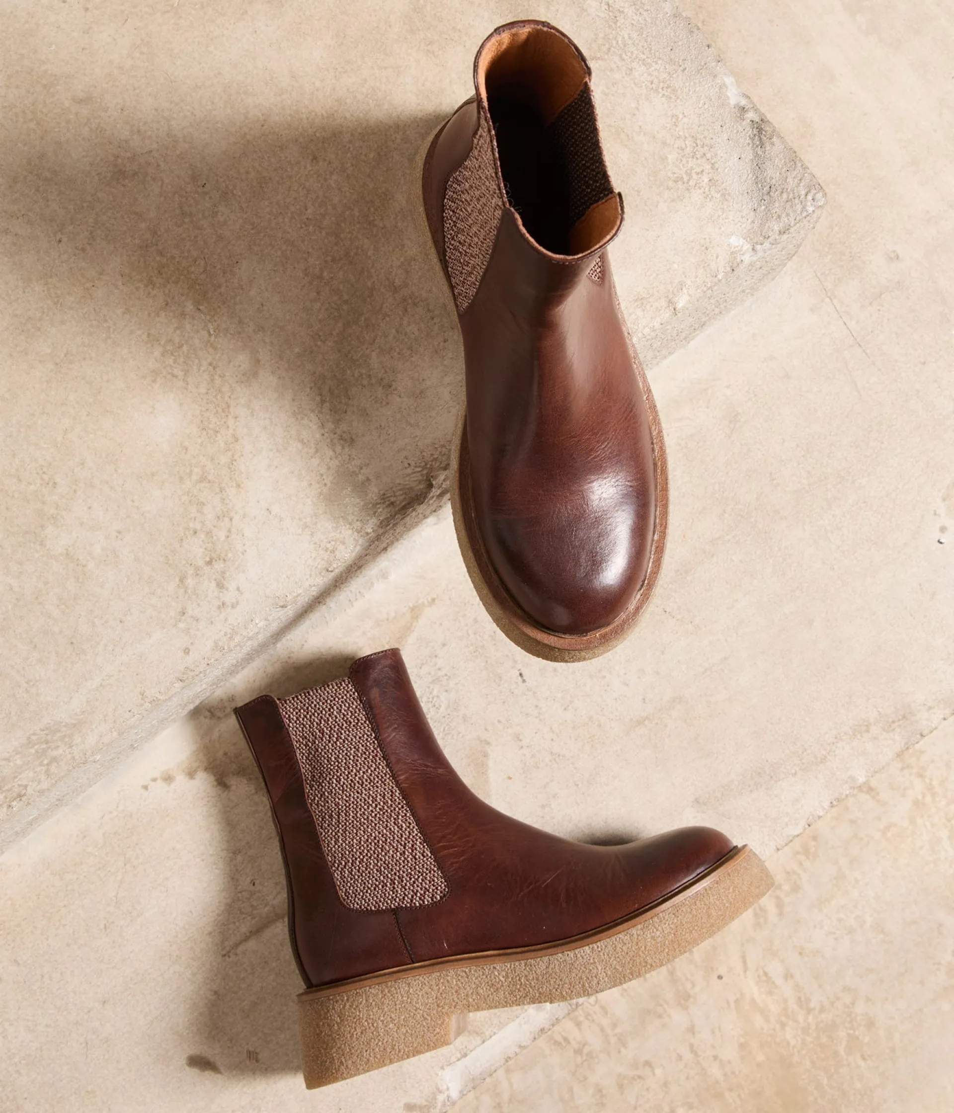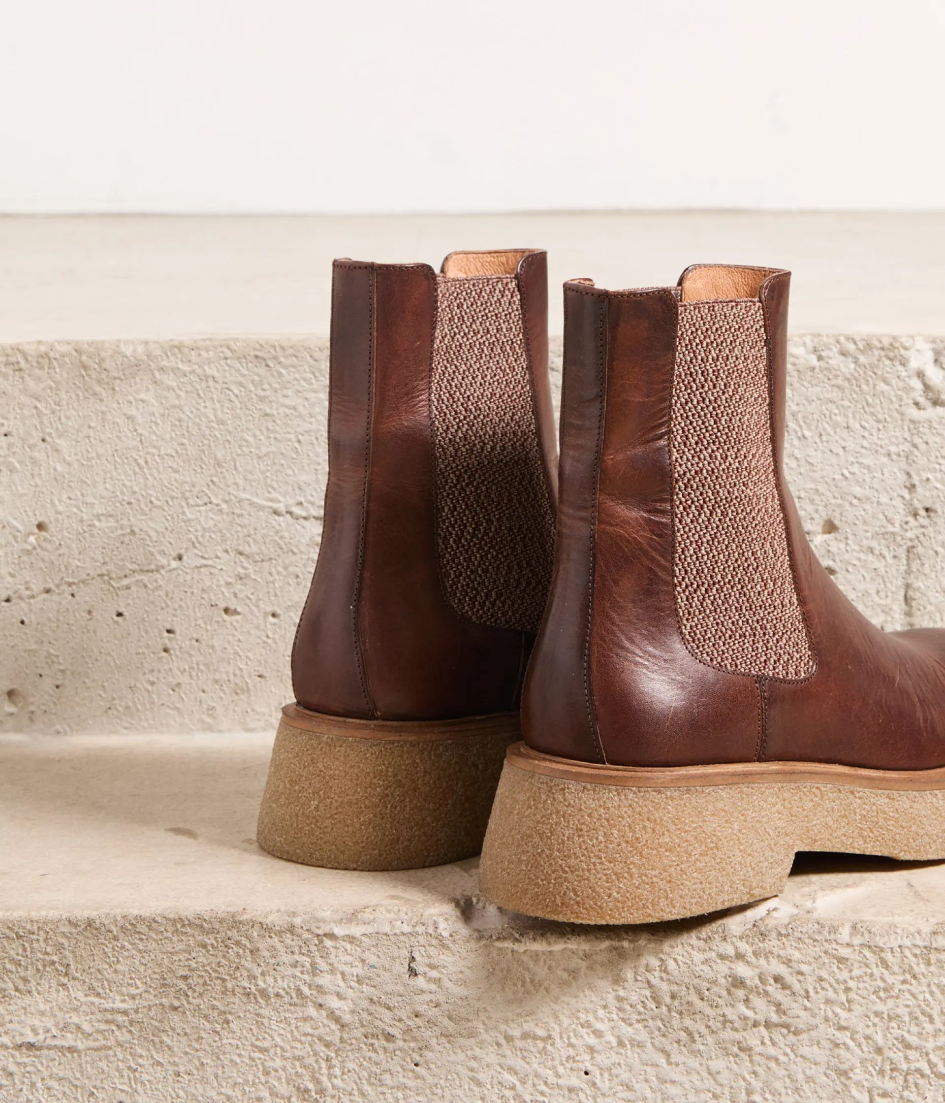 Dans la famille des boots pour femme, on demande… les Chelsea (identifiables à leurs élastiques latéraux). Cuir marron, détails fantaisie, semelles semi-compensées façon crêpe, le modèle Brianna donne tout pour célébrer le festival d’automne (à prolonger tout l’hiver). Costume en velours côtelé, coloris chinés et détails frangés acceptés. Brianna c’est l’esprit vintage à son apogée. Son cuir gardera des traces de vos péripéties. Si vous voulez les atténuer, il vous suffit de frotter avec votre main.