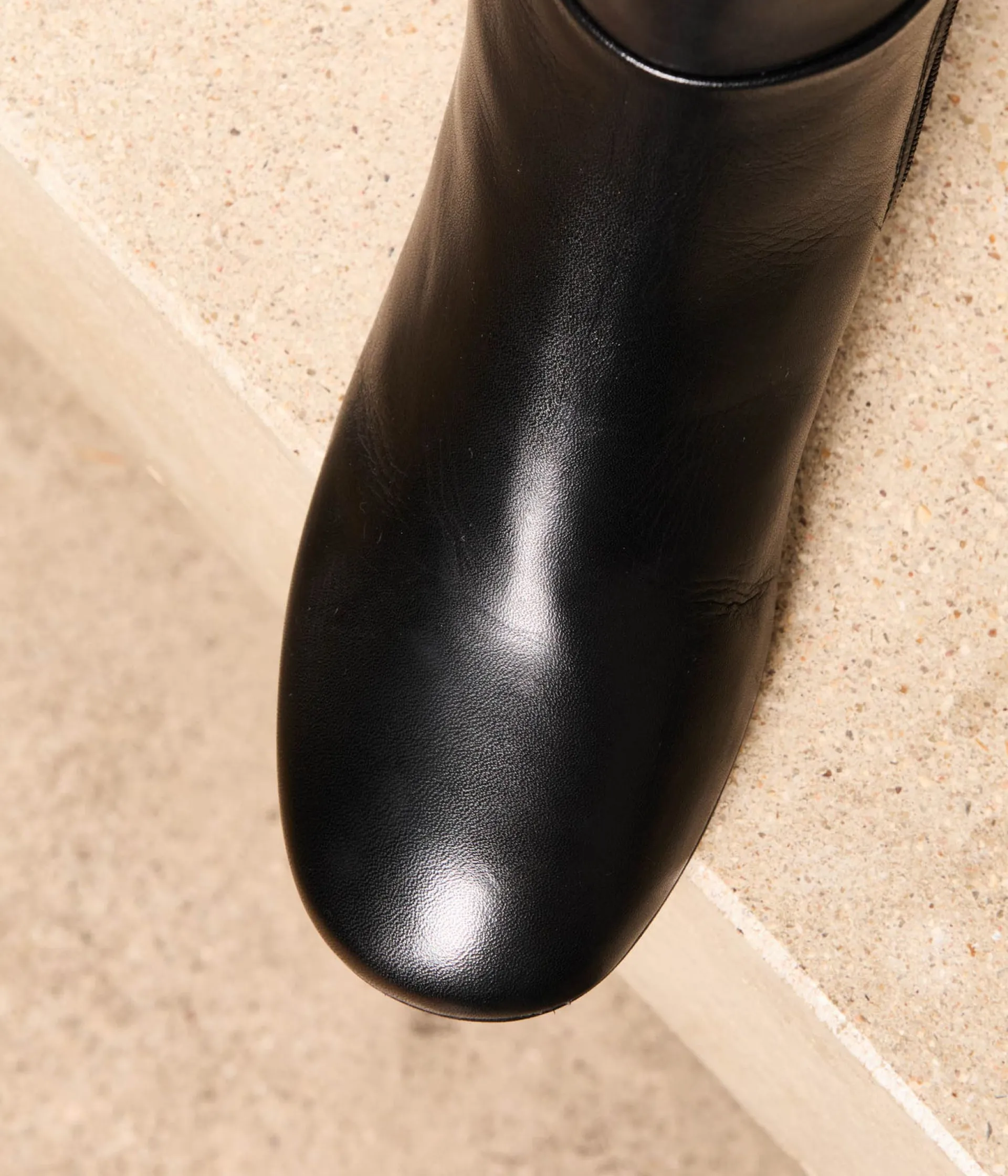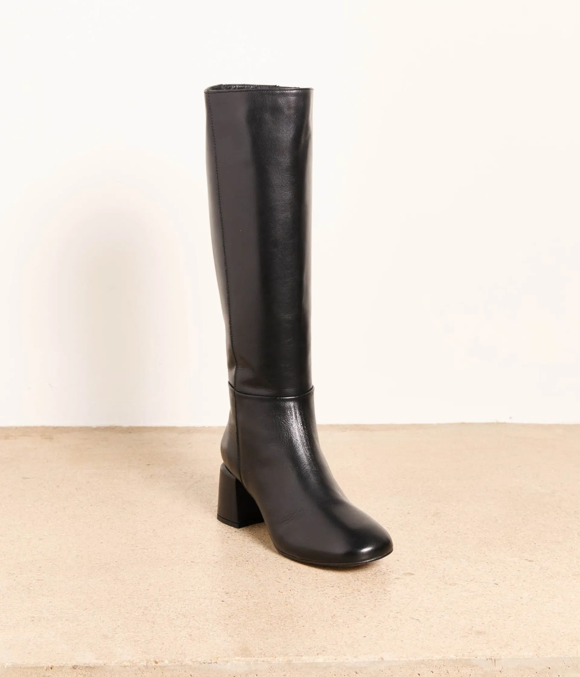 Le vrai chic accessible ? Les bottes Tina. Cuir lisse noir, talon de 5,5 cm, sa tige haute galbe le mollet avec subtili…