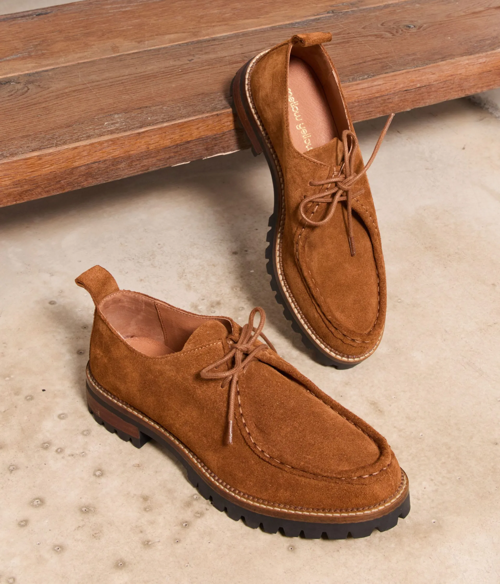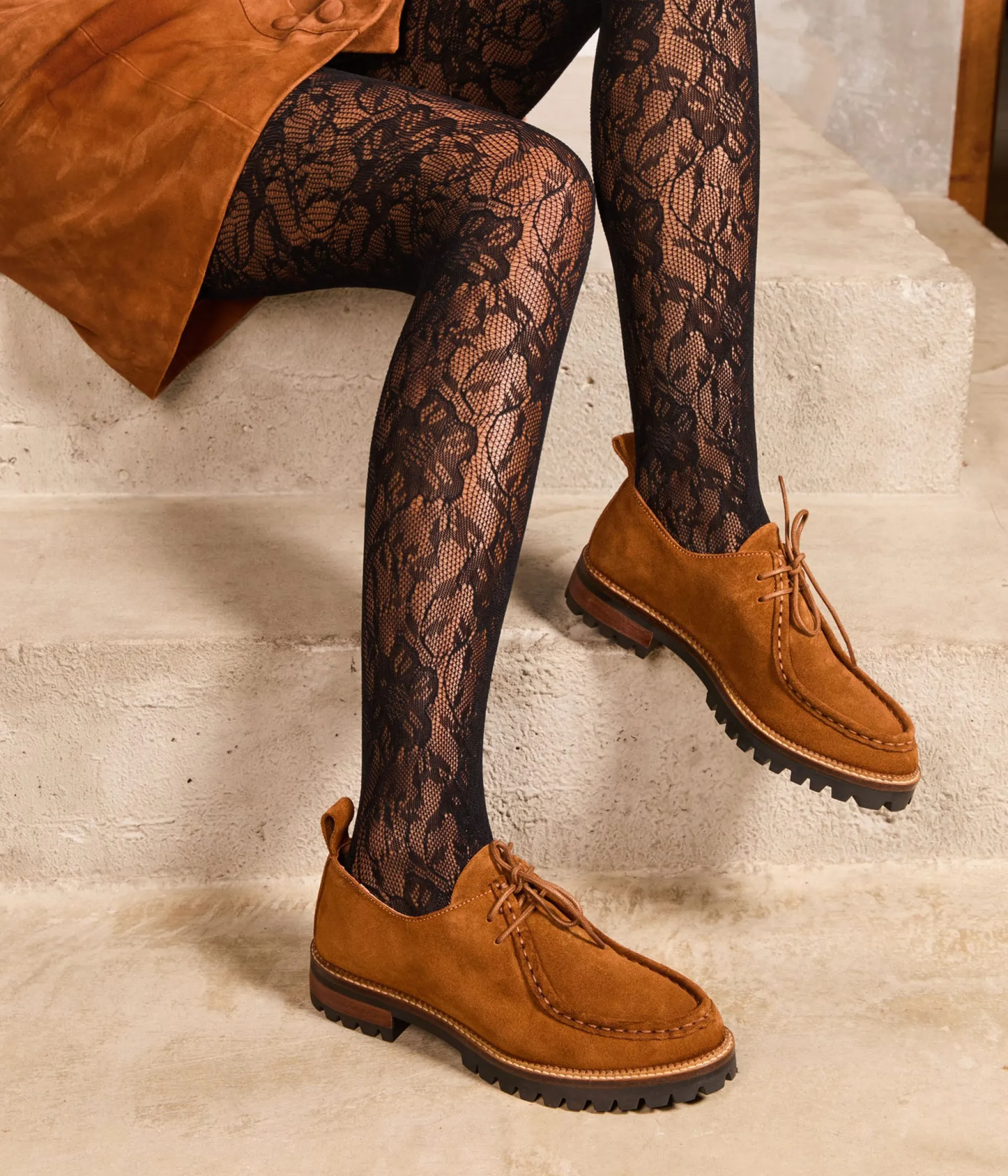 Les derbies George : What else ? Bien plus que de simples souliers, ils proposent un vrai lifestyle, avec leur association de cuir velours et coloris camel. Un modèle hautement désirable, avec une robe longue en tricot côtelé et de courtes chaussettes chinées.