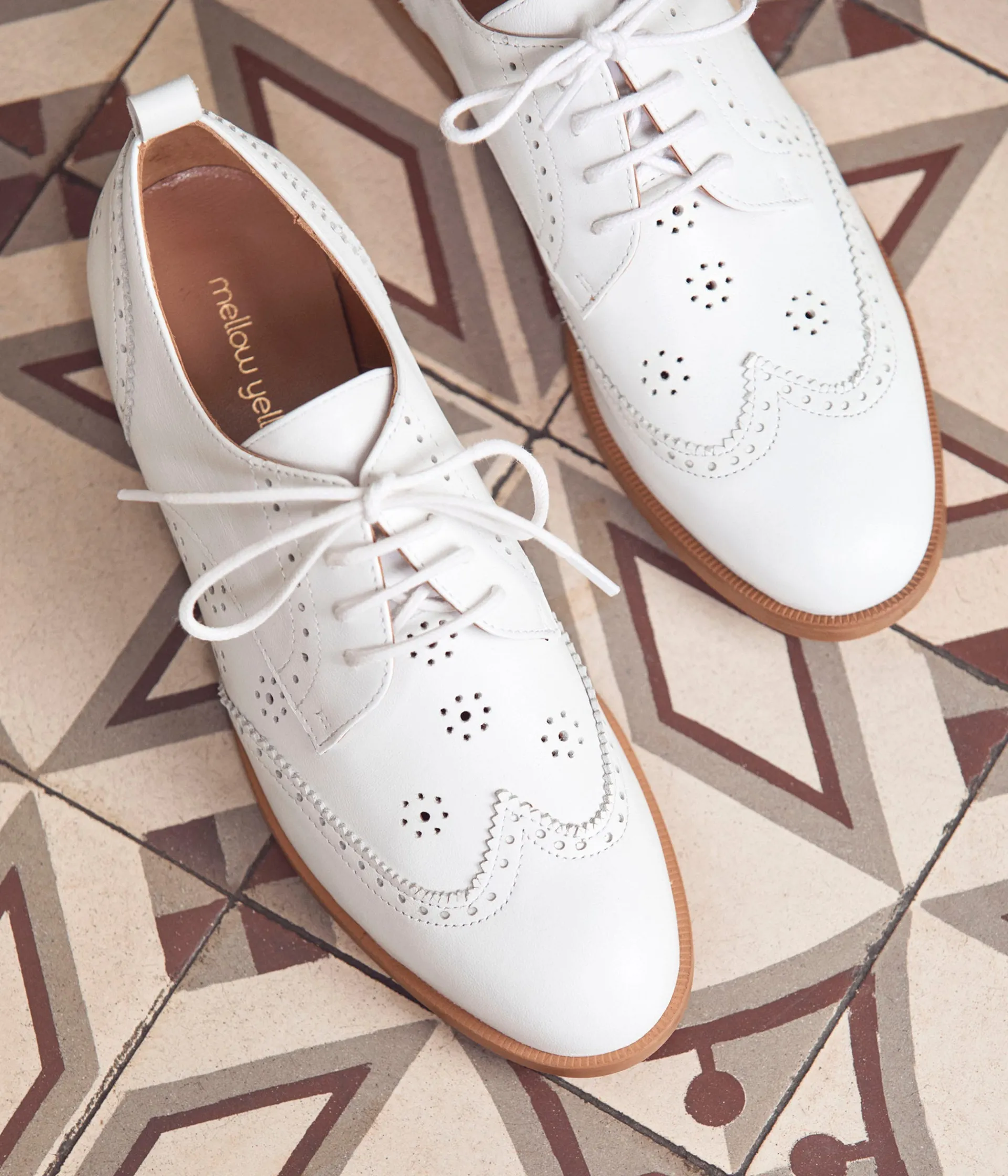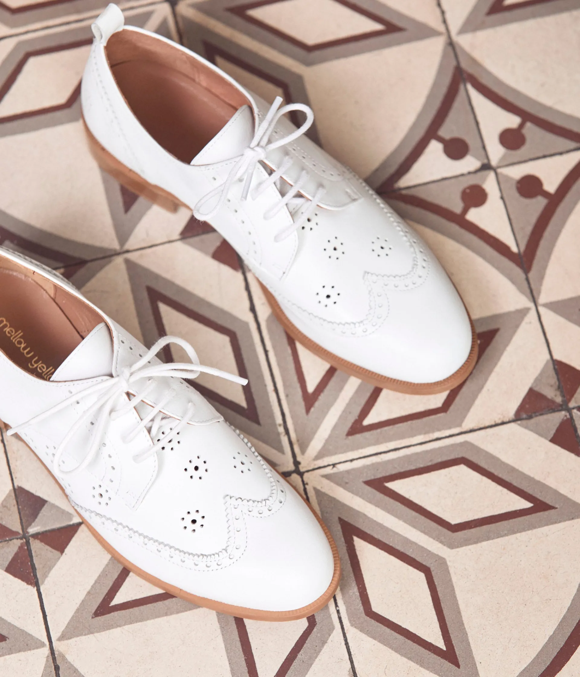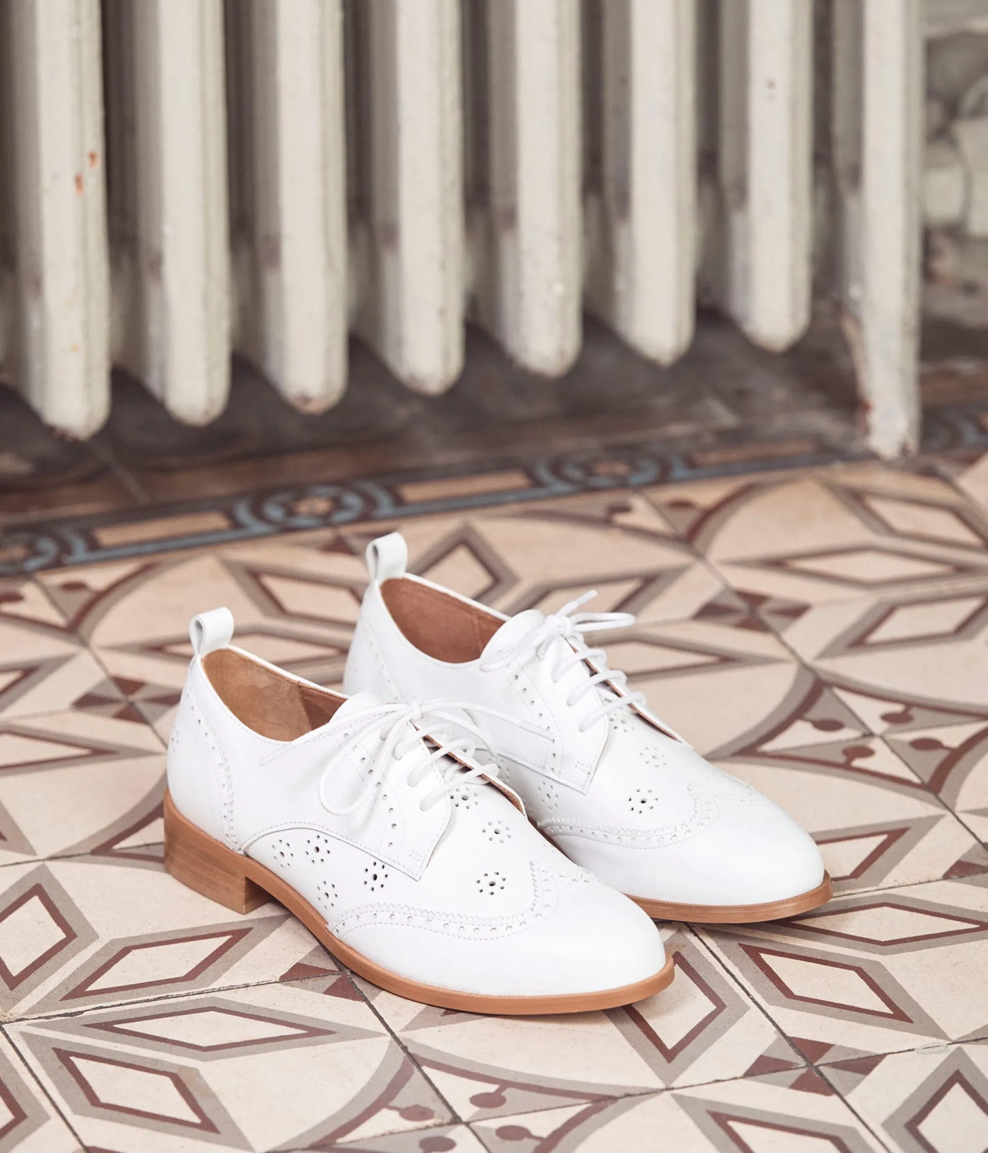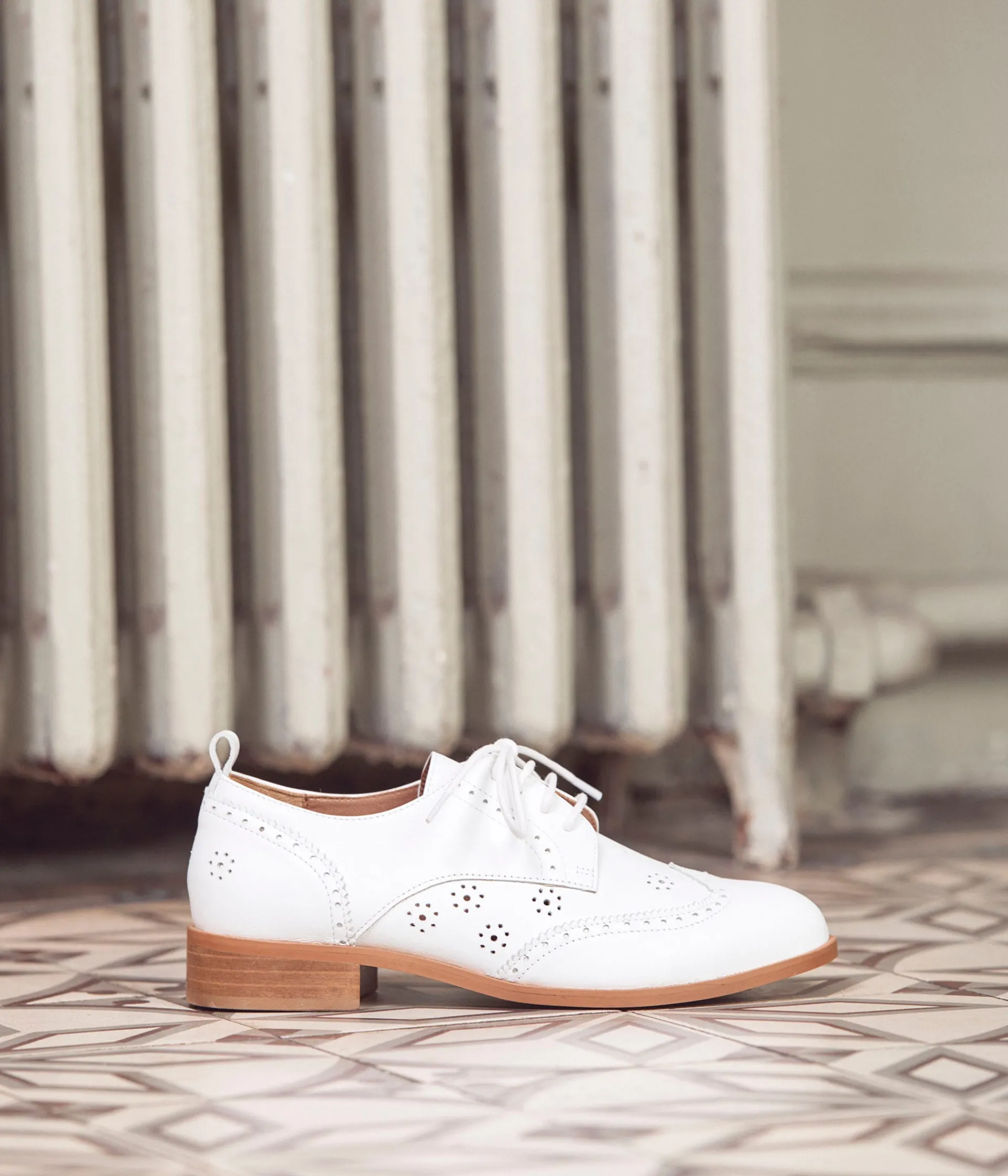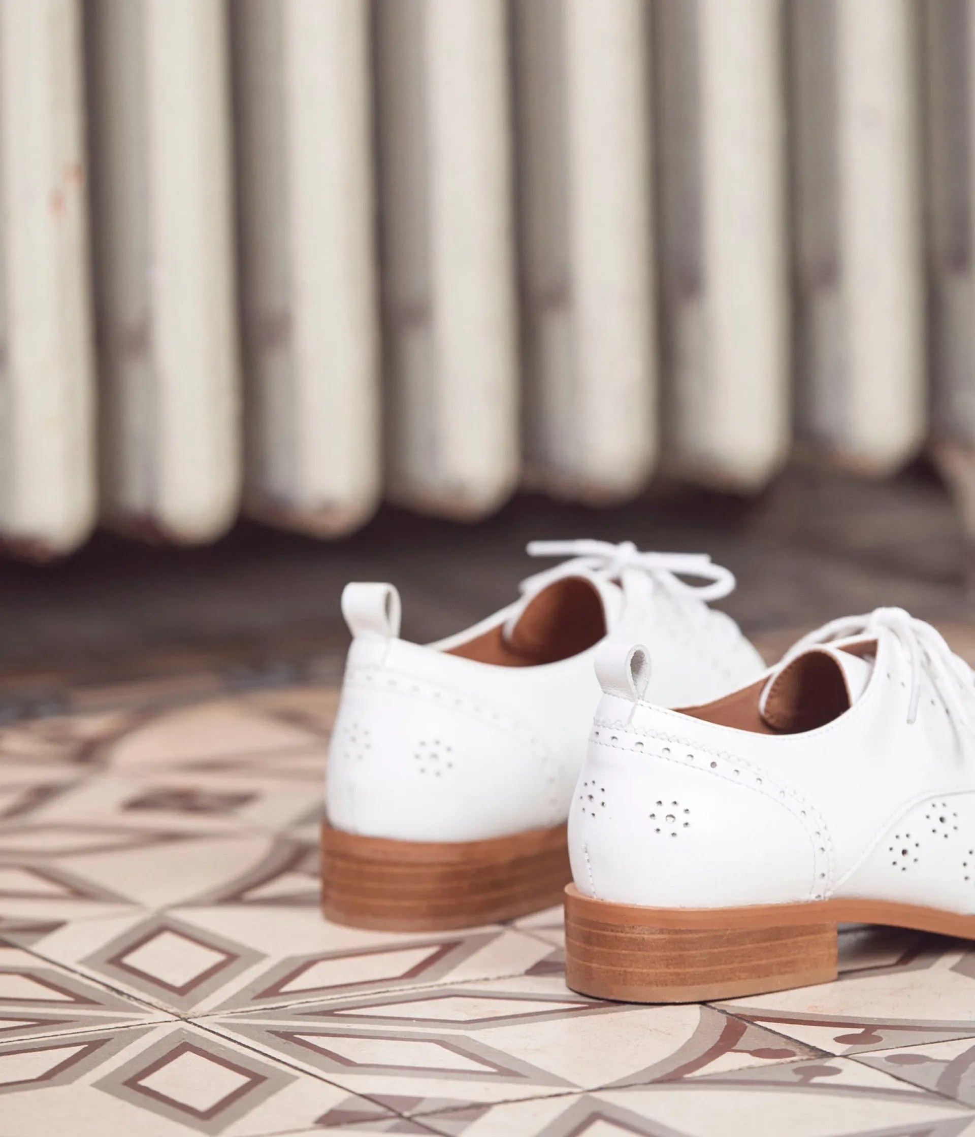 Avec Phil, pas question de se défiler. Un petit 9h-19 h des familles cloqué en réunion ? Un apéro improvisé après une journée de télétravail ? Une soirée où vous serez attendue sur la piste ? Faites péter votre paire de derbies Phil, en cuir lisse blanc et à bout fleuri. Un must have.