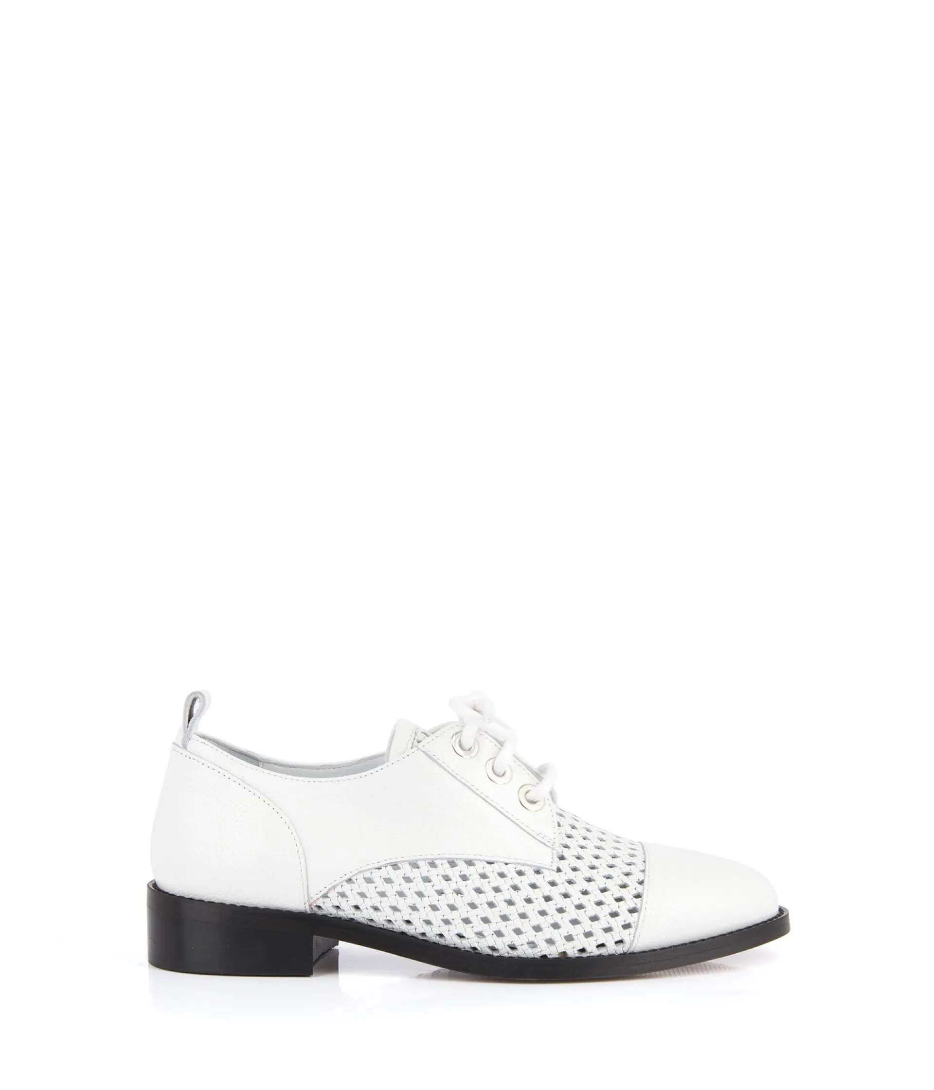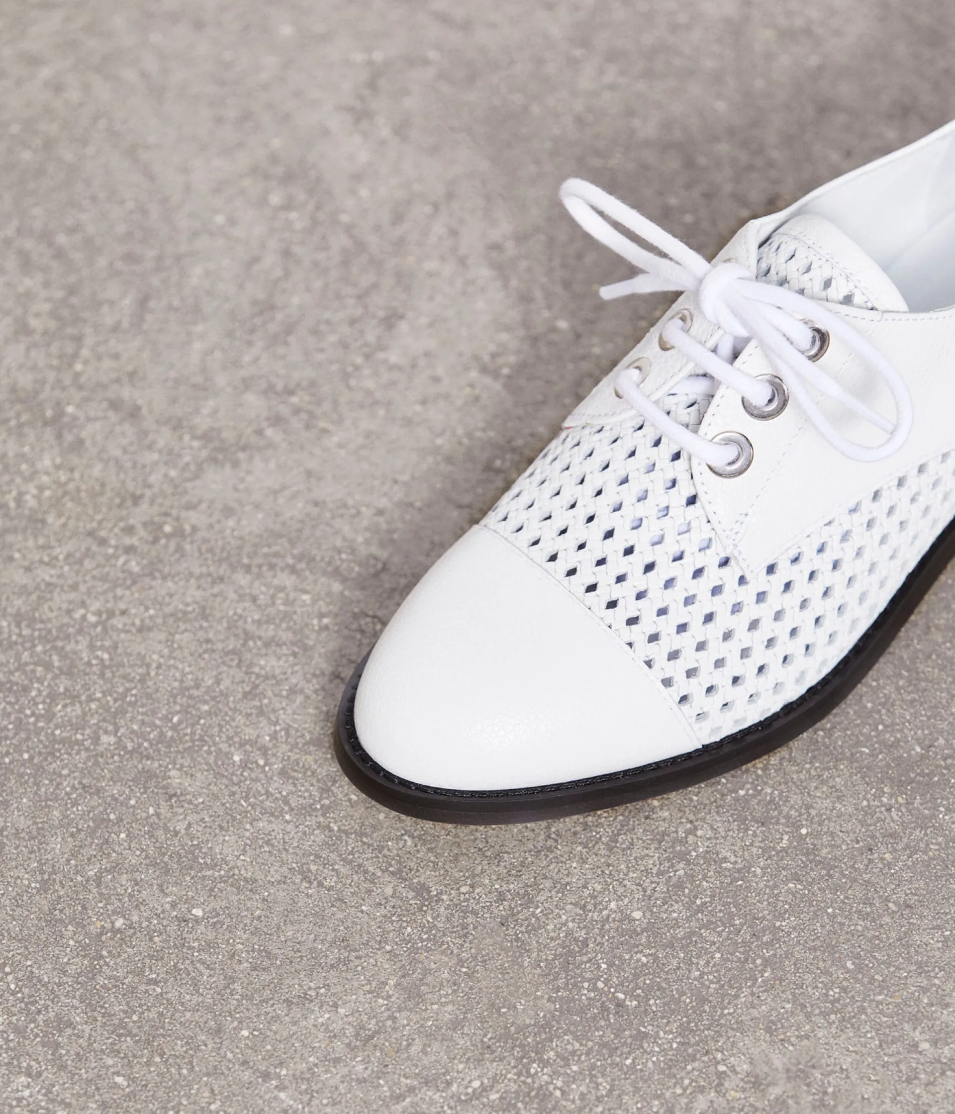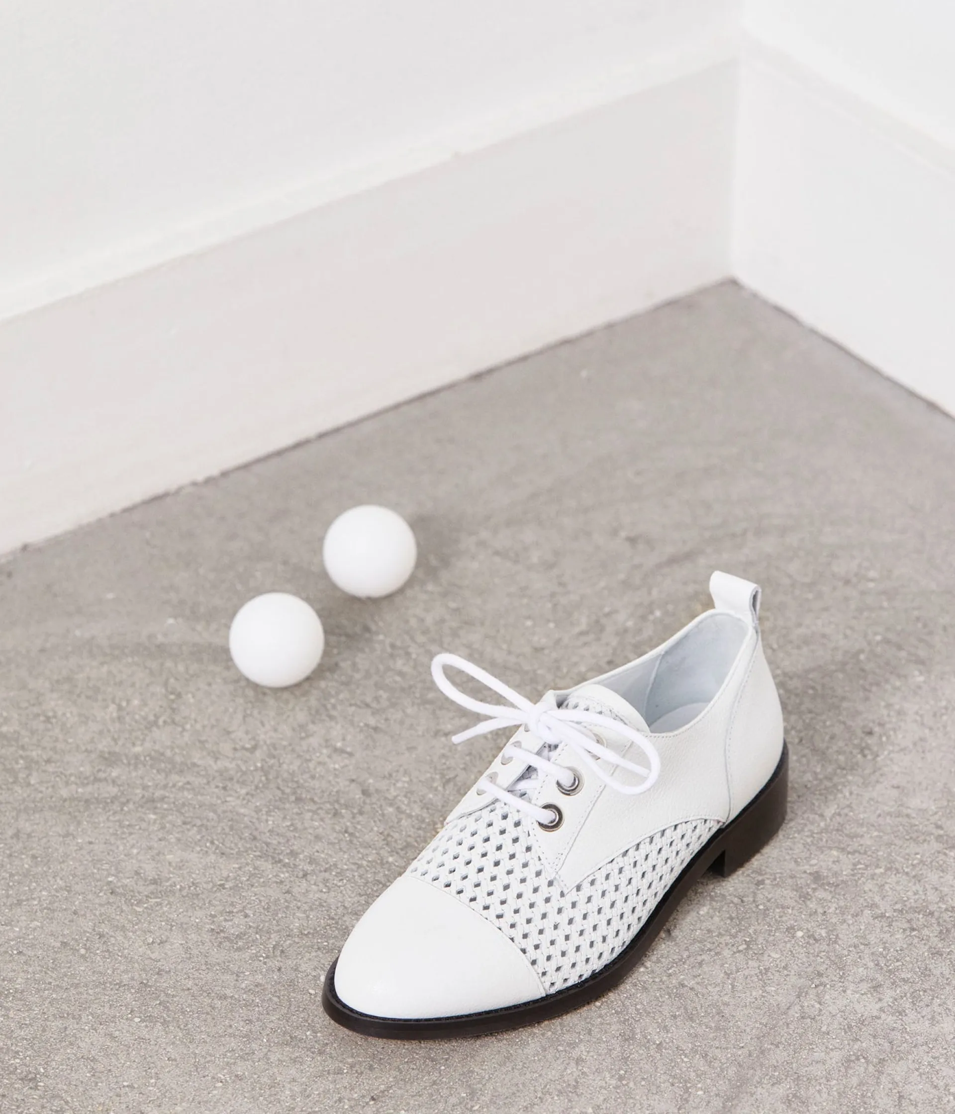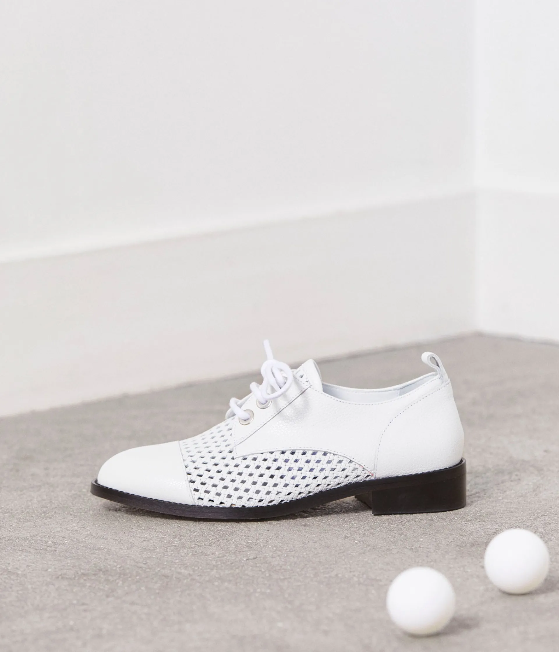 Pour en dévoiler un peu, mais point trop n’en faut, notre paire de derbies Édith fait le choix de l’ajouré. Une paire de souliers au cuir souple et aux motifs géométriques qui se parent de transparence. En version blanche pour le petit côté androgyne Gainsbourg.