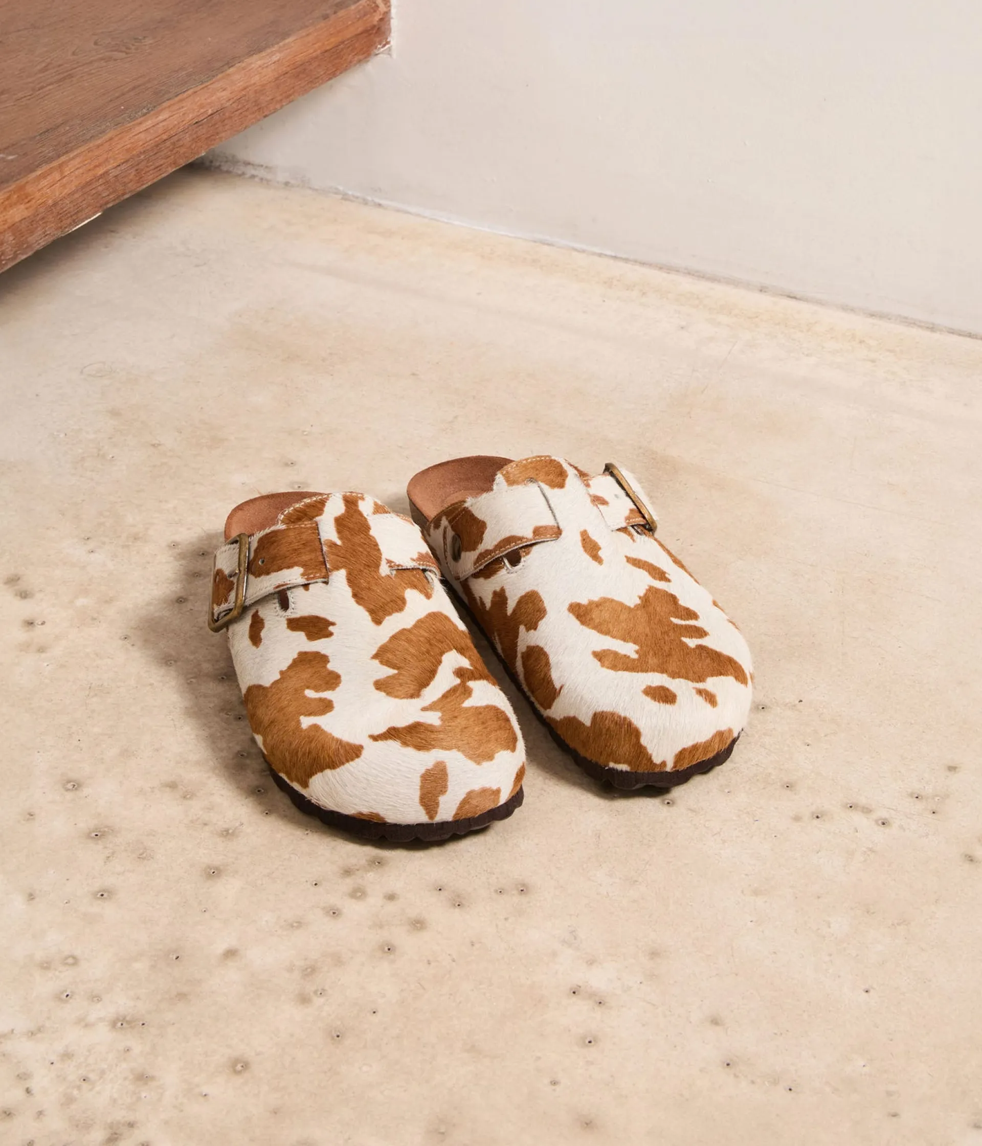 Si l’exubérance avait un nom, ça pourrait être… Marguerite, des sabots en cuir effet poulain à imprimé vache. Co…