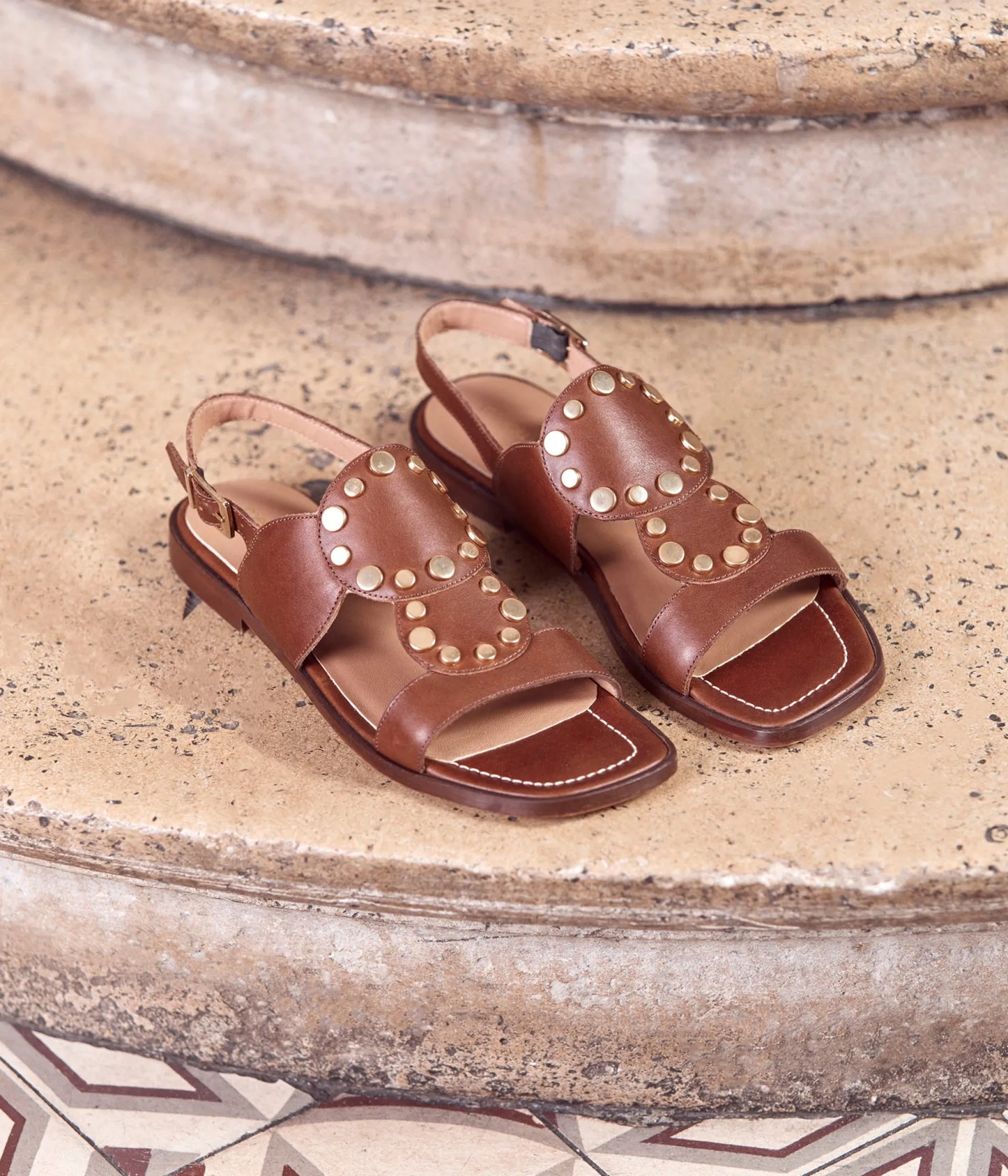 Prête à danser le Mia ? Pas de chichi : enfilez votre paire de sandales Mia marron, aux clous en or qui brillent, et déboutonnez un poil votre chemise. Et pour que la piste s’enflamme, n’hésitez pas à enchaîner les pas lents sur ce talon plat effet bohème chic. Olé !