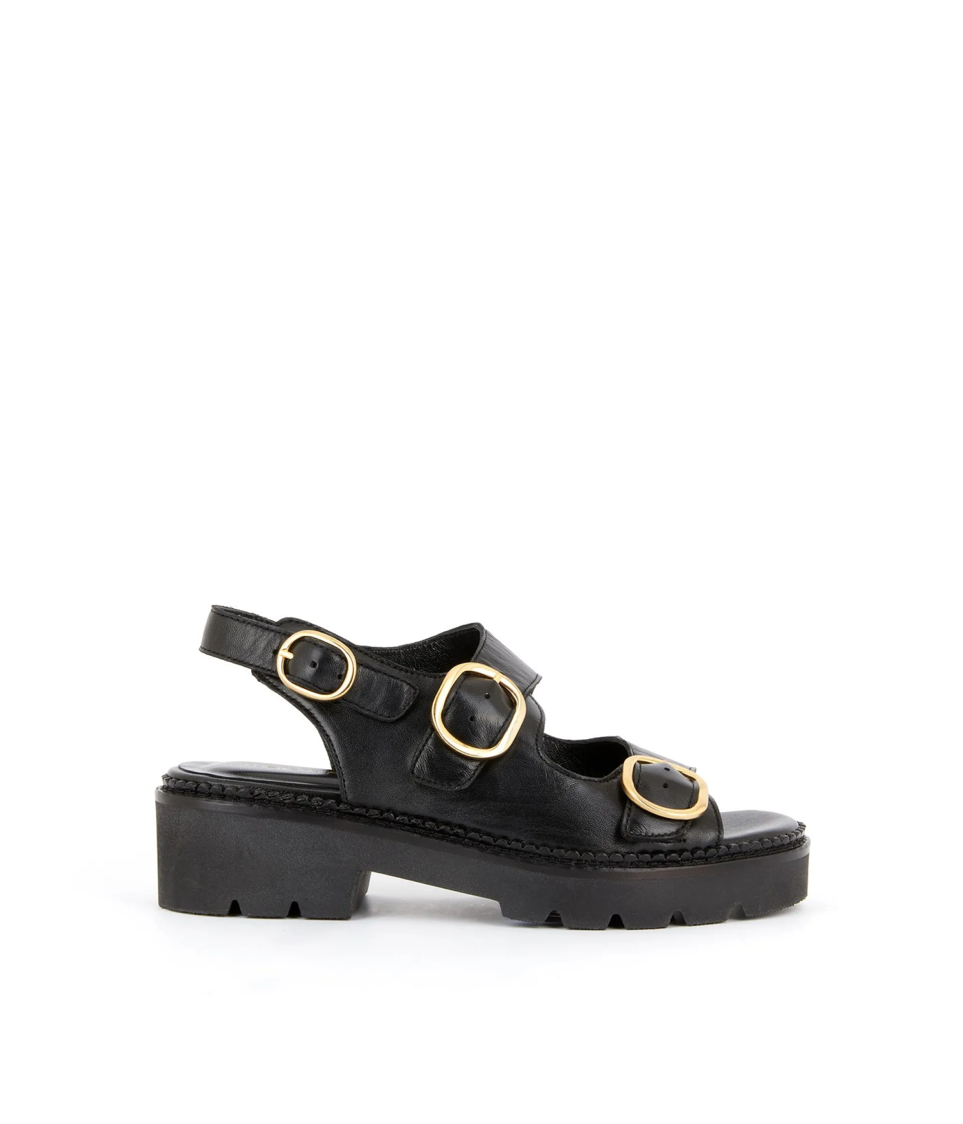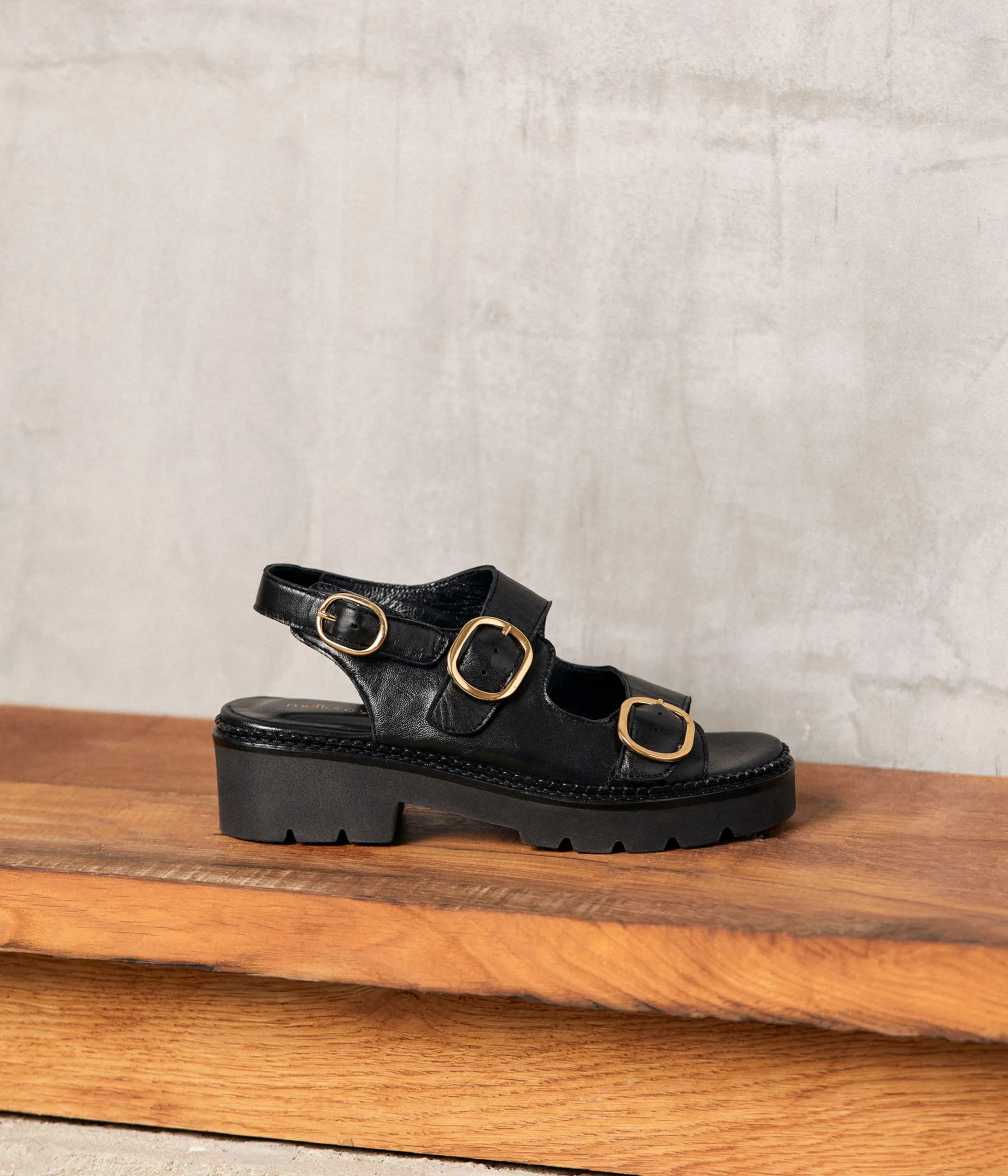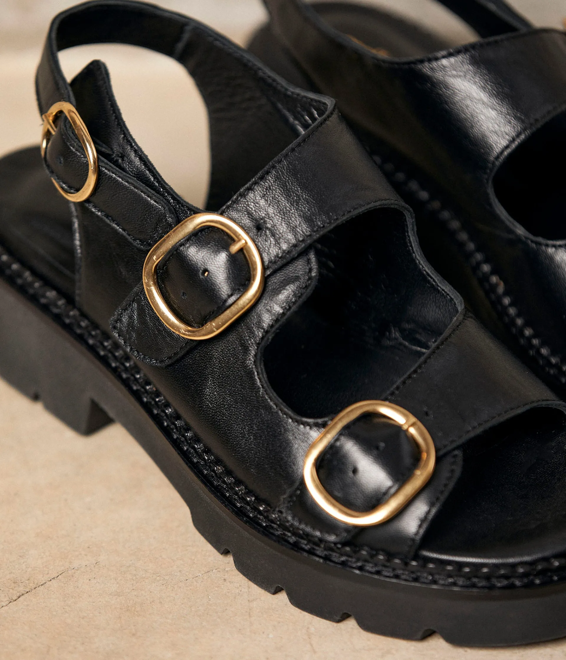 Il est l’heure de savourer une silhouette à contre-saison, voire hautement visuelle. Dans le viseur : les sandales à semelles crantées IRINA, en cuir noir. Avec ? Osera, osera pas, un tailleur impeccable.