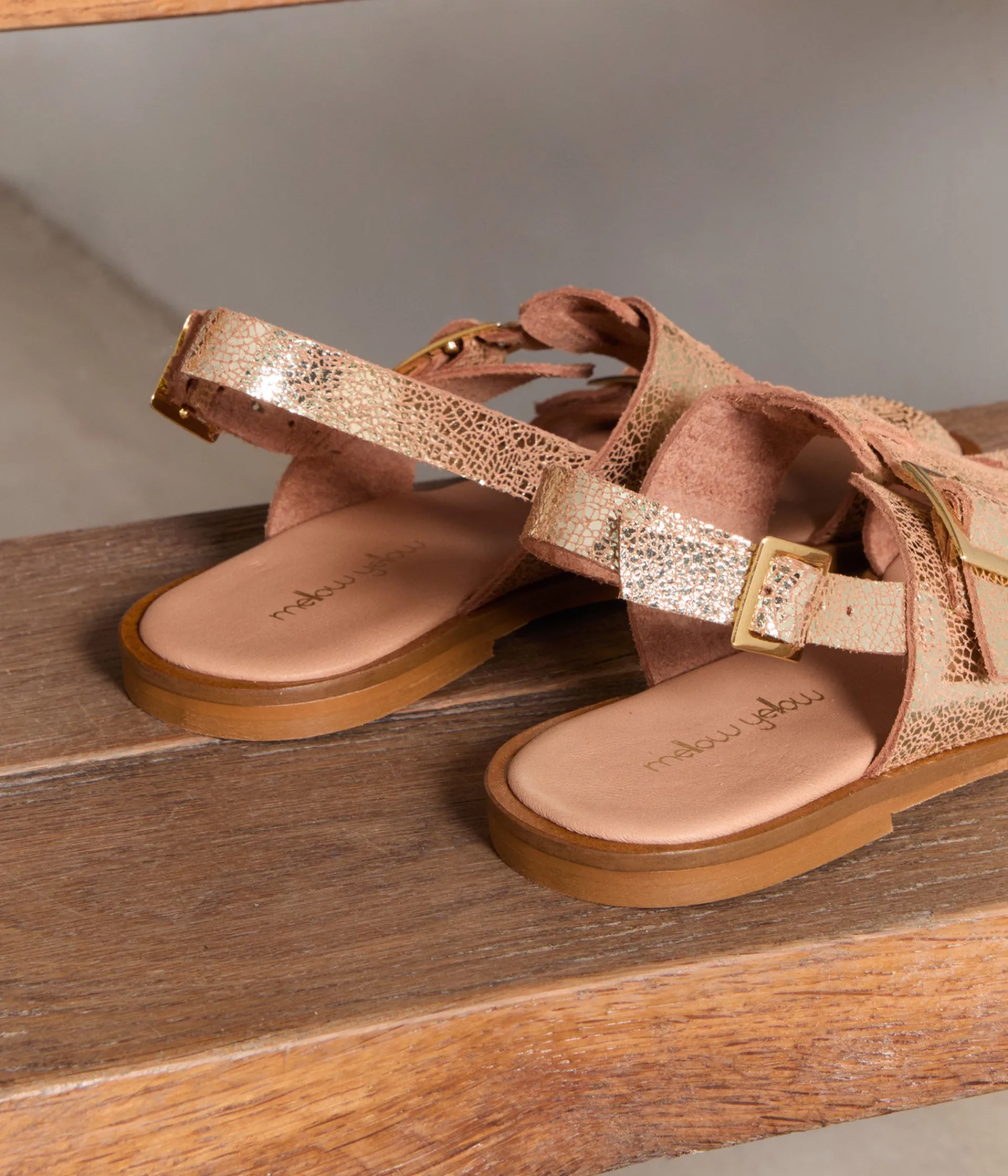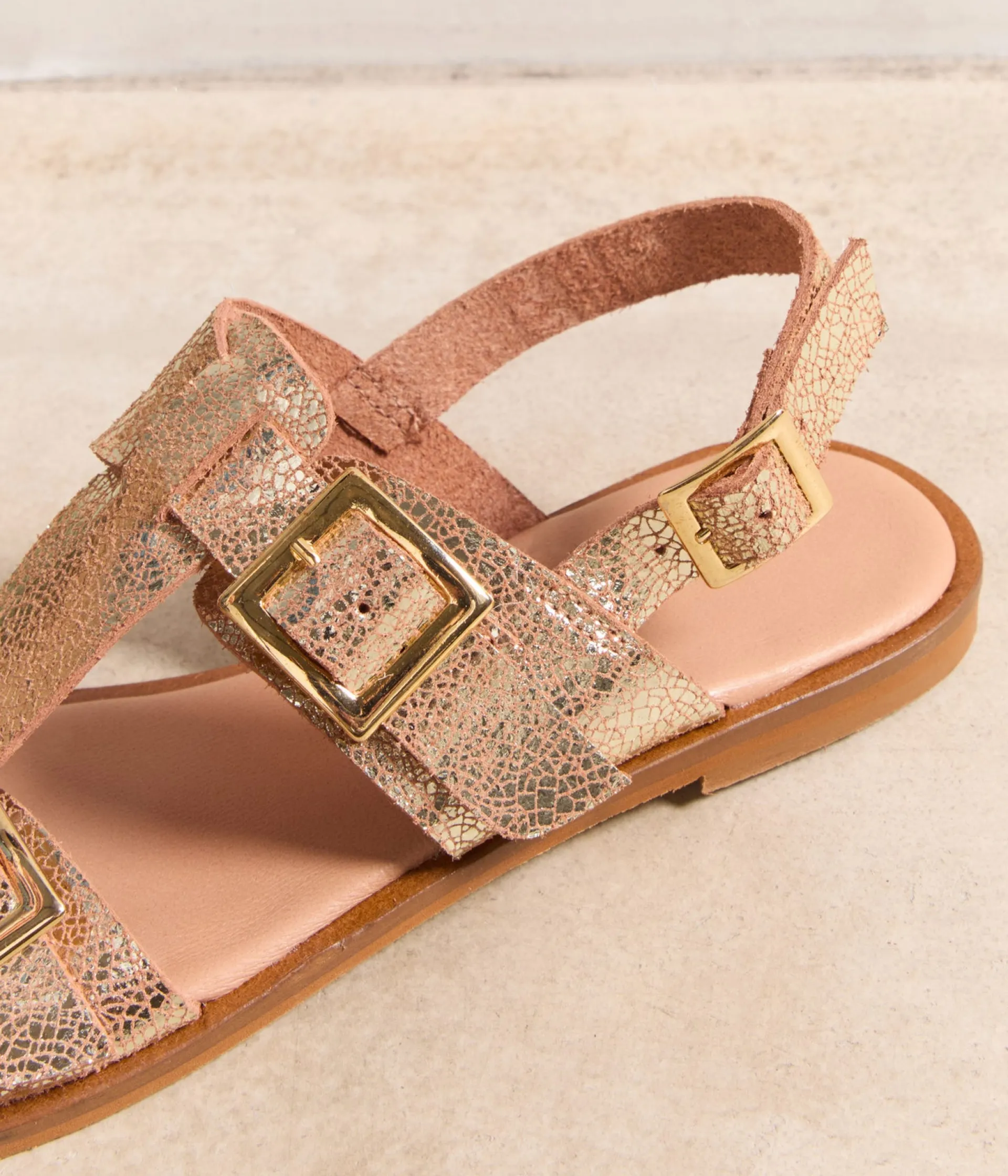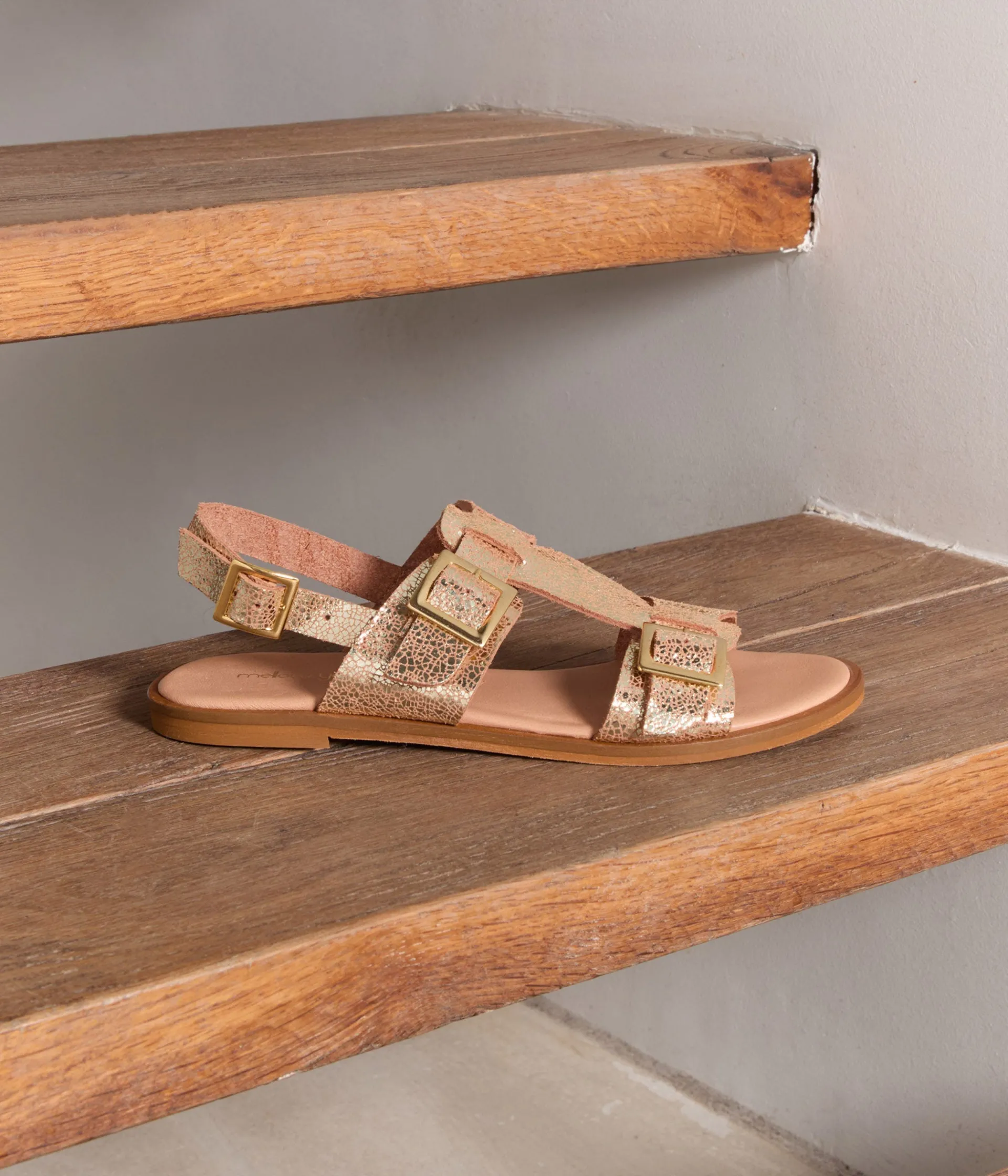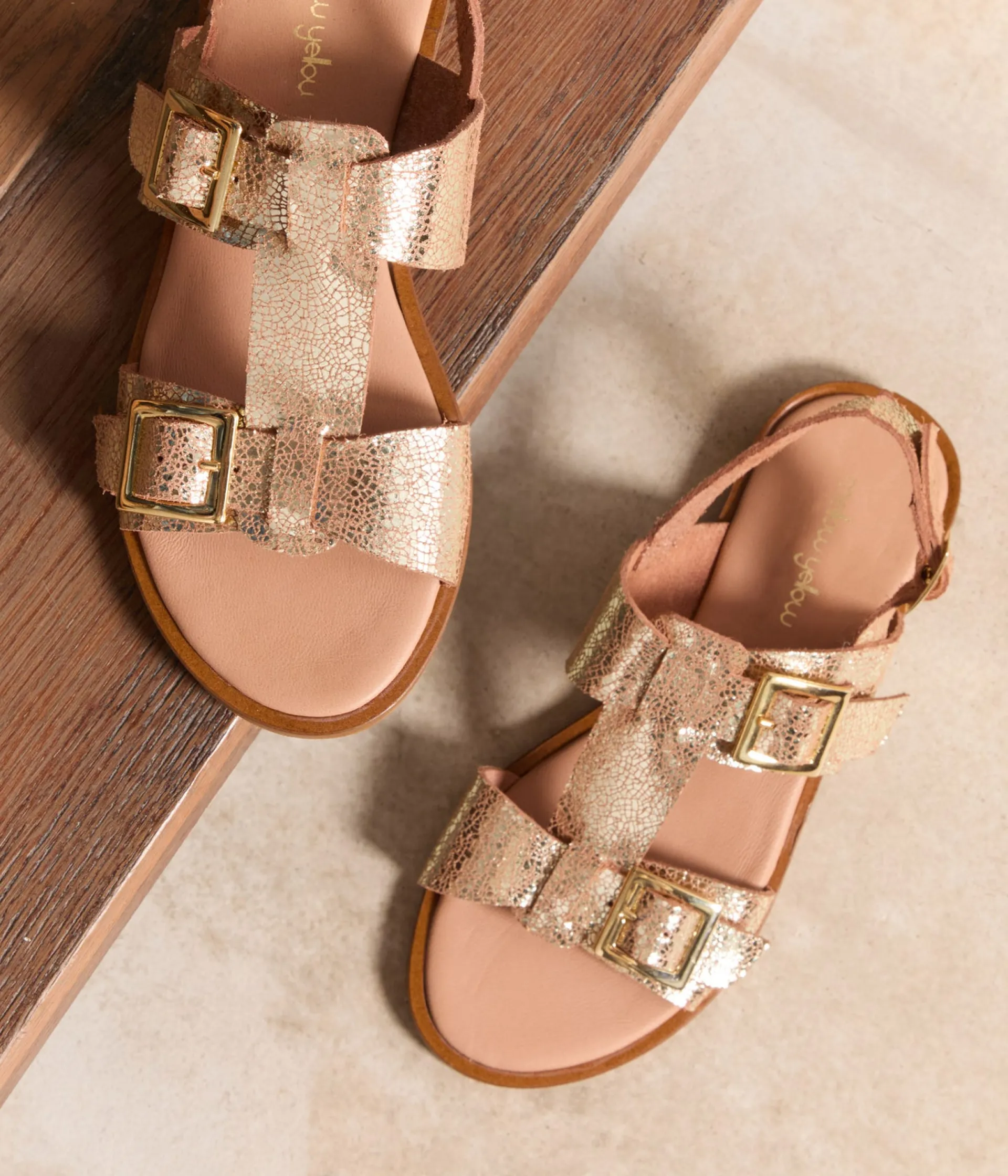 Qu’est-ce qui matche à la perfection avec une robe noire et un total look blanc, avec une combi en jean brut et un pantalon battle kaki ? Ne tergiversez pas longtemps. Ce sont… les sandales dorées, évidemment. C’est un grand Oui pour le modèle Nikki, en cuir métallisé fantaisie.