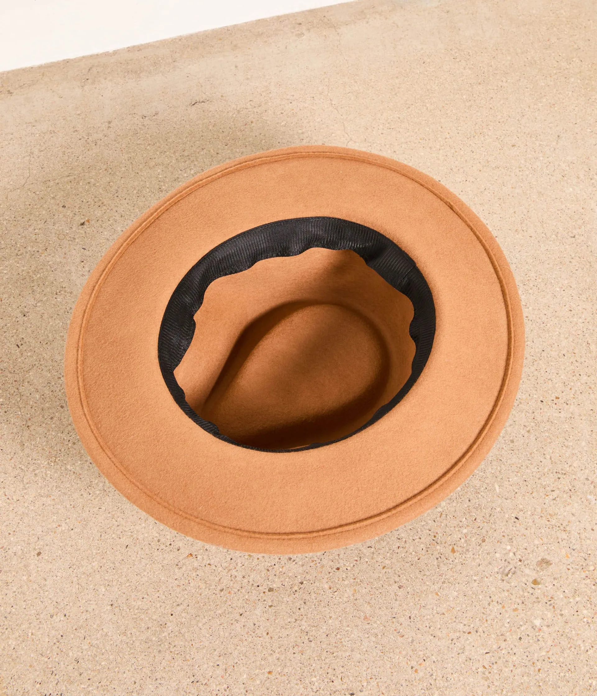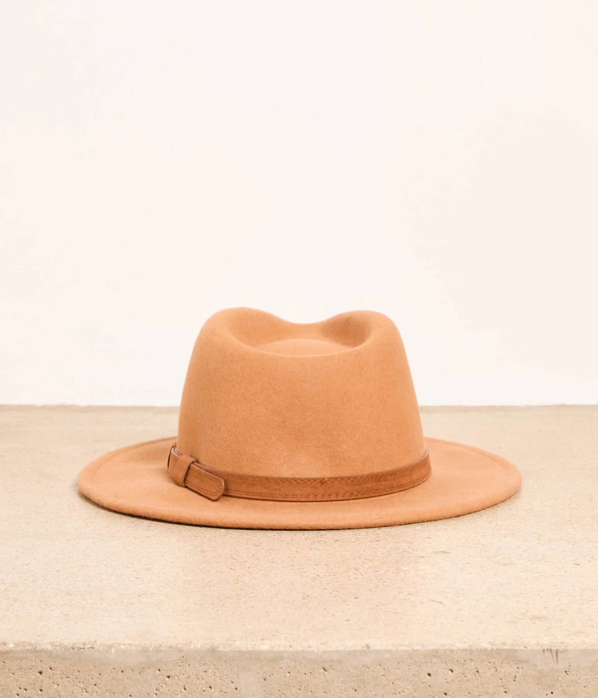 Long manteau camel, robe-tube en maille beige, bottes à talon en cuir cognac, sac à main chocolat. Il ne vous manquait que le chapeau Anne, en laine feutrée marron clair, pour finaliser votre nouveau look prèf’ du moment.