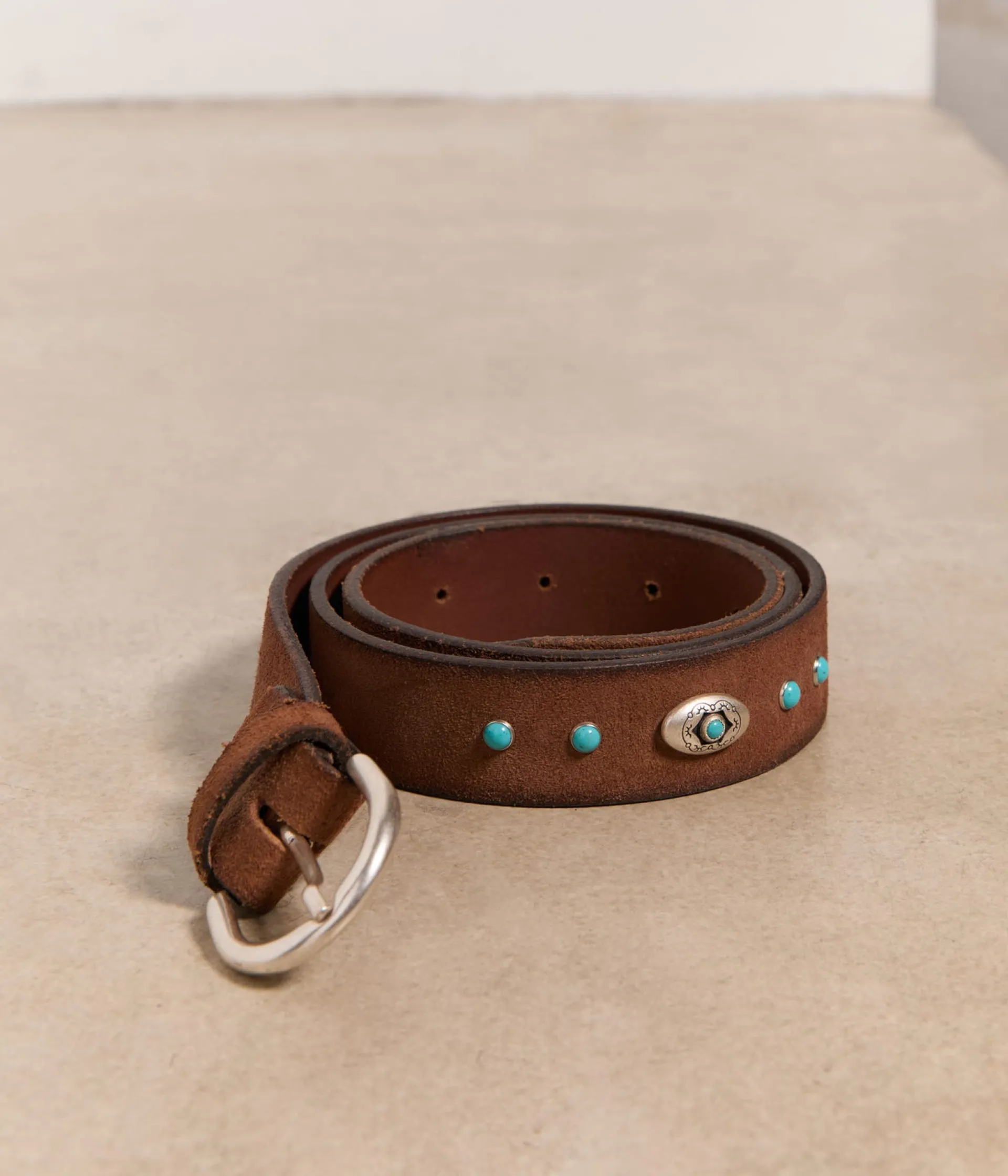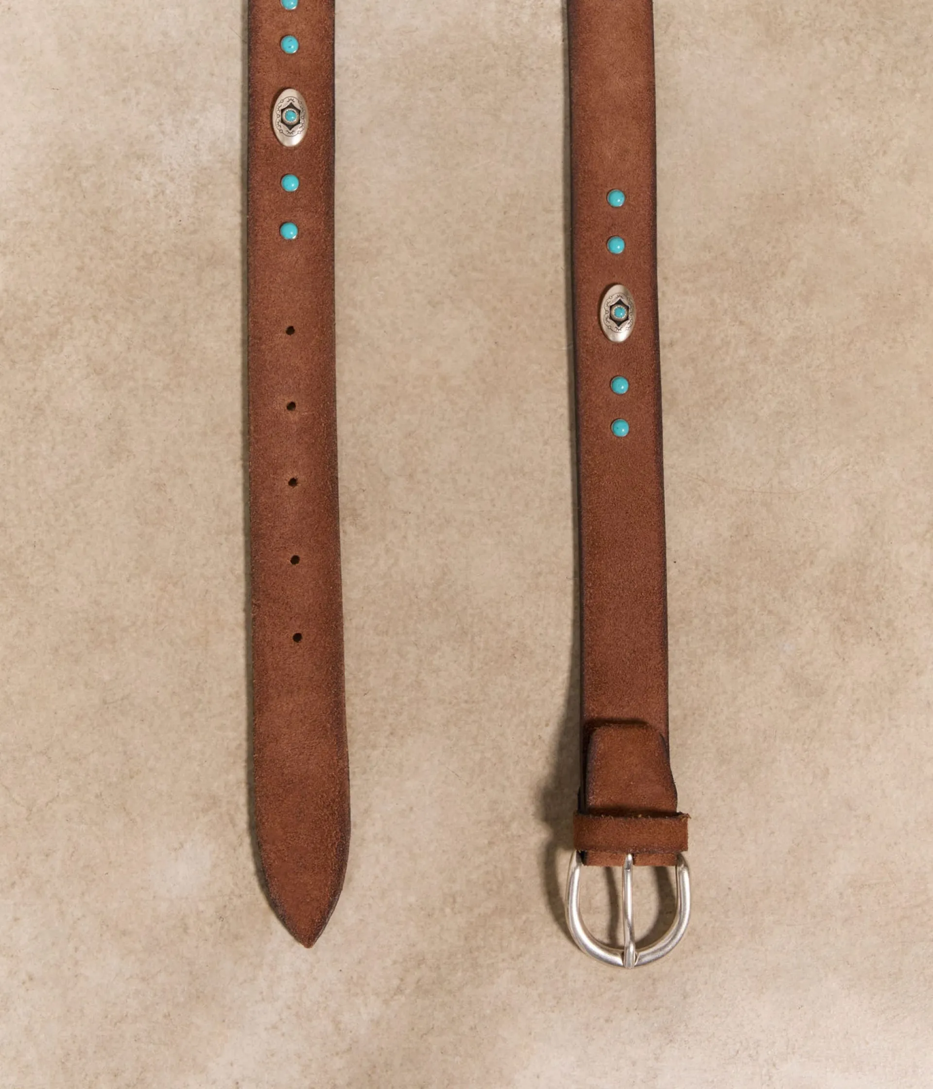 Attachez vos ceintures ! (Ou au moins la vôtre.) Plus question de passer sa vie à remonter son jean ! Faites le choix d’un accessoire efficace et utile, pile dans la tendance. Essayez Maddie, soulignée de pierres bleu turquoise sur cuir velours marron, pour un twist dans un esprit amérindien.